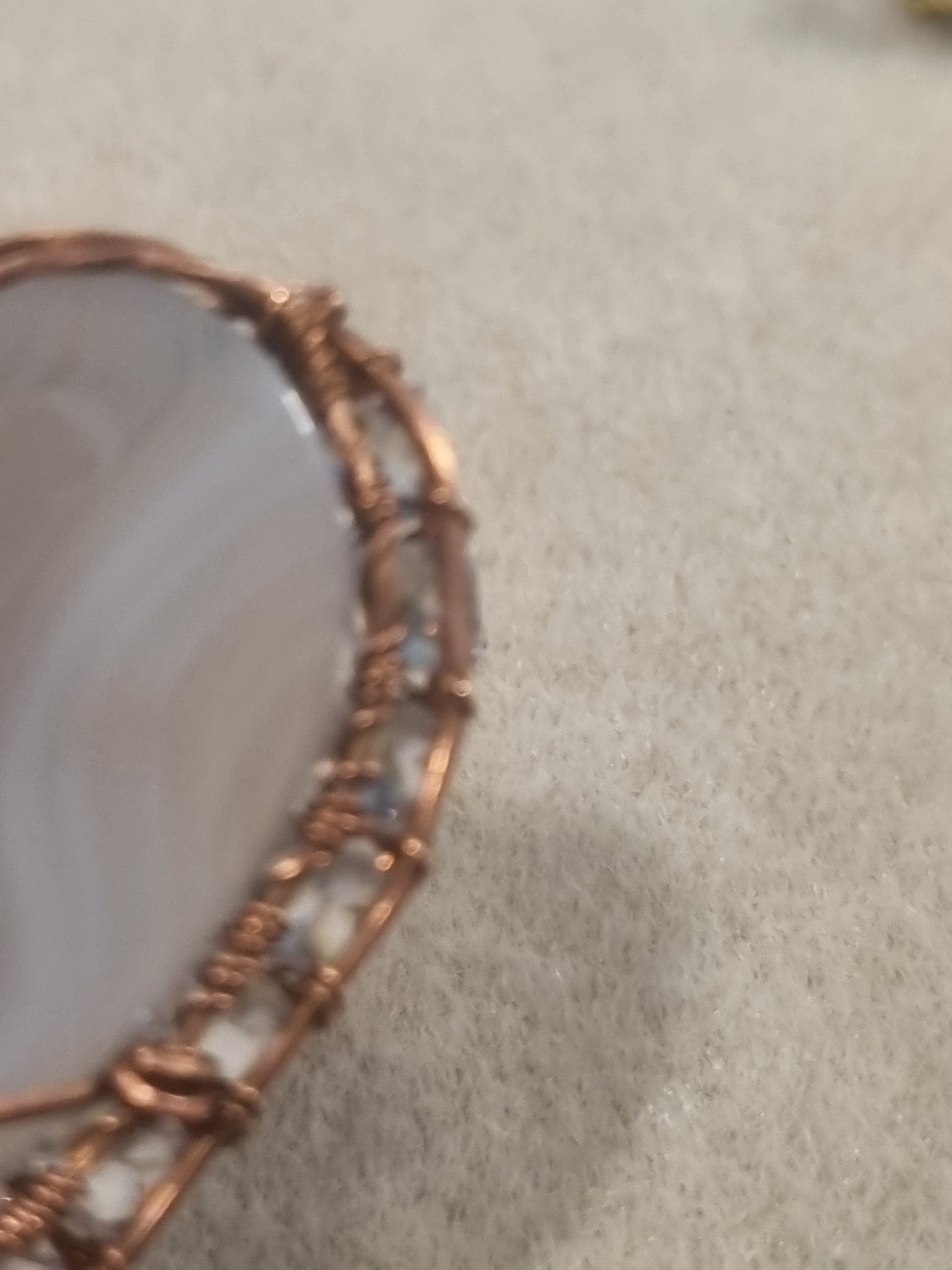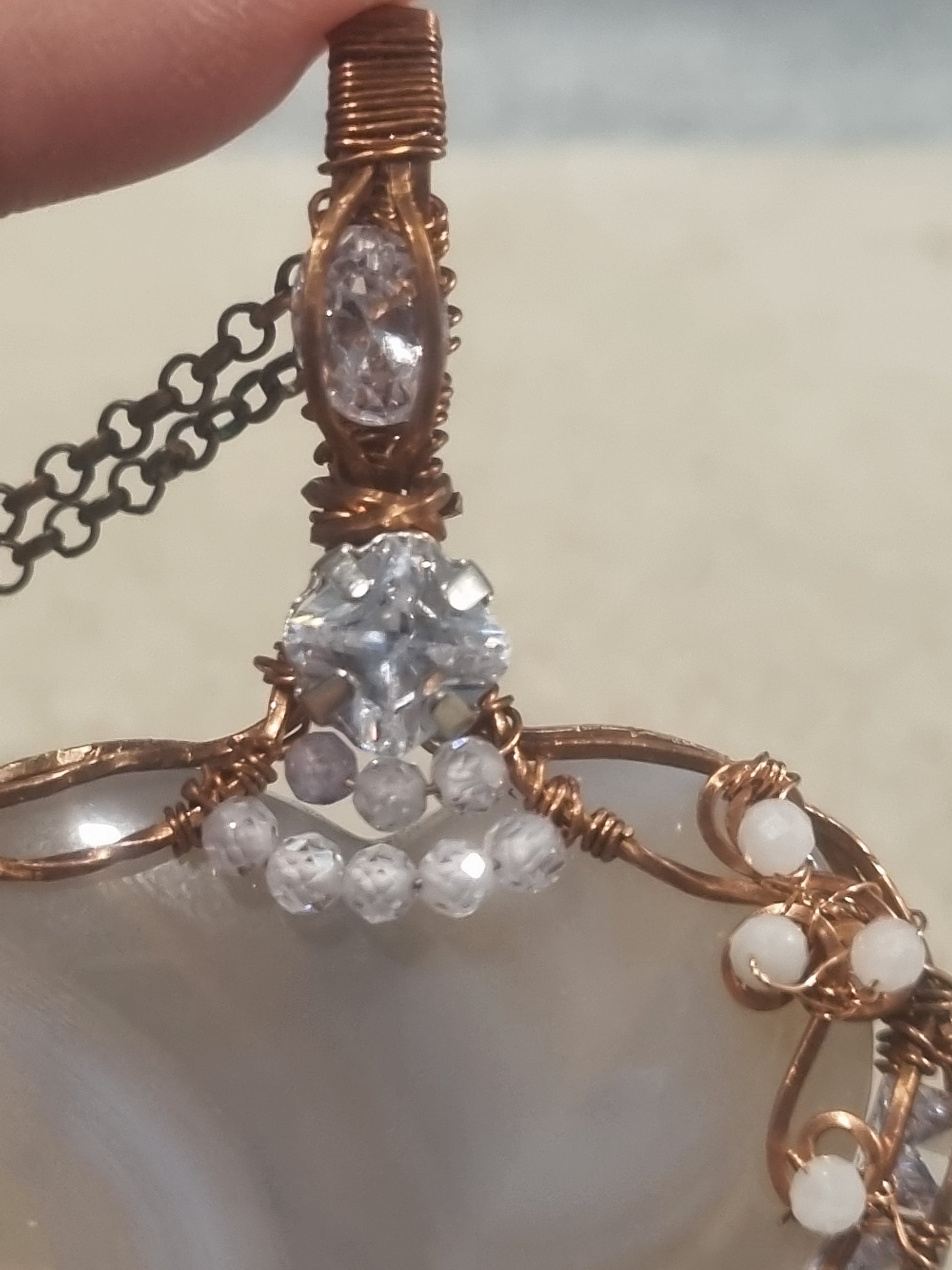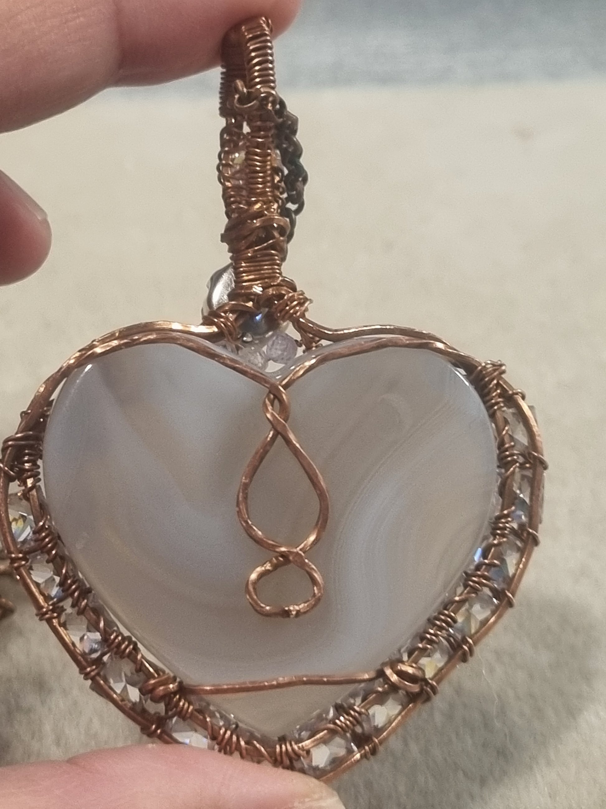 Agate Heart Stone with rhinestone, cubic zirconia and moonstone accents. Wire wrapped in copper.