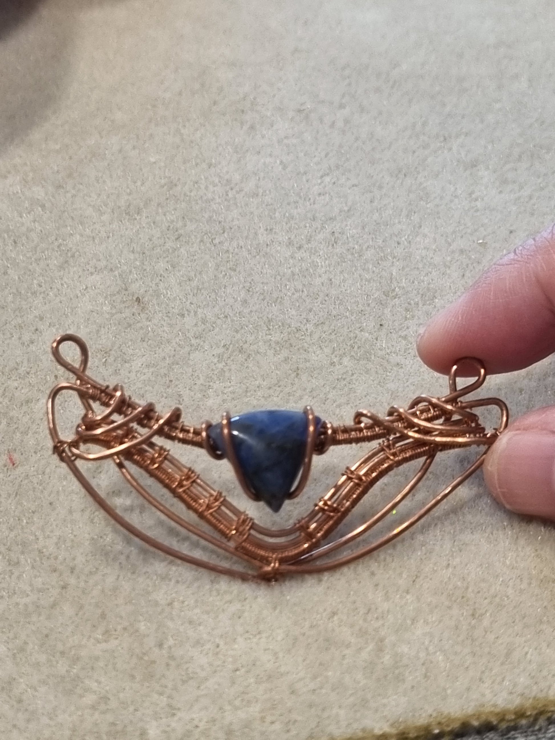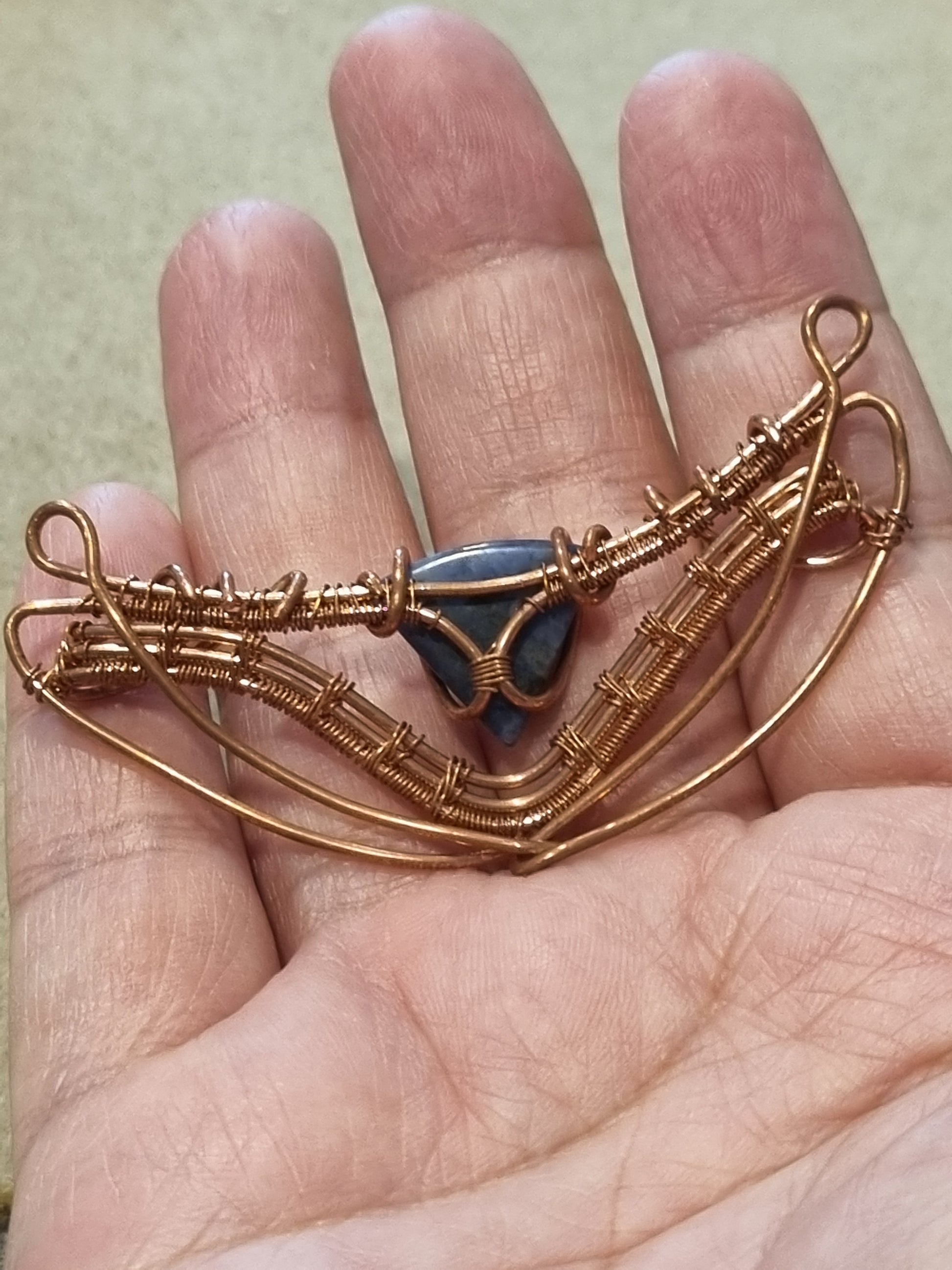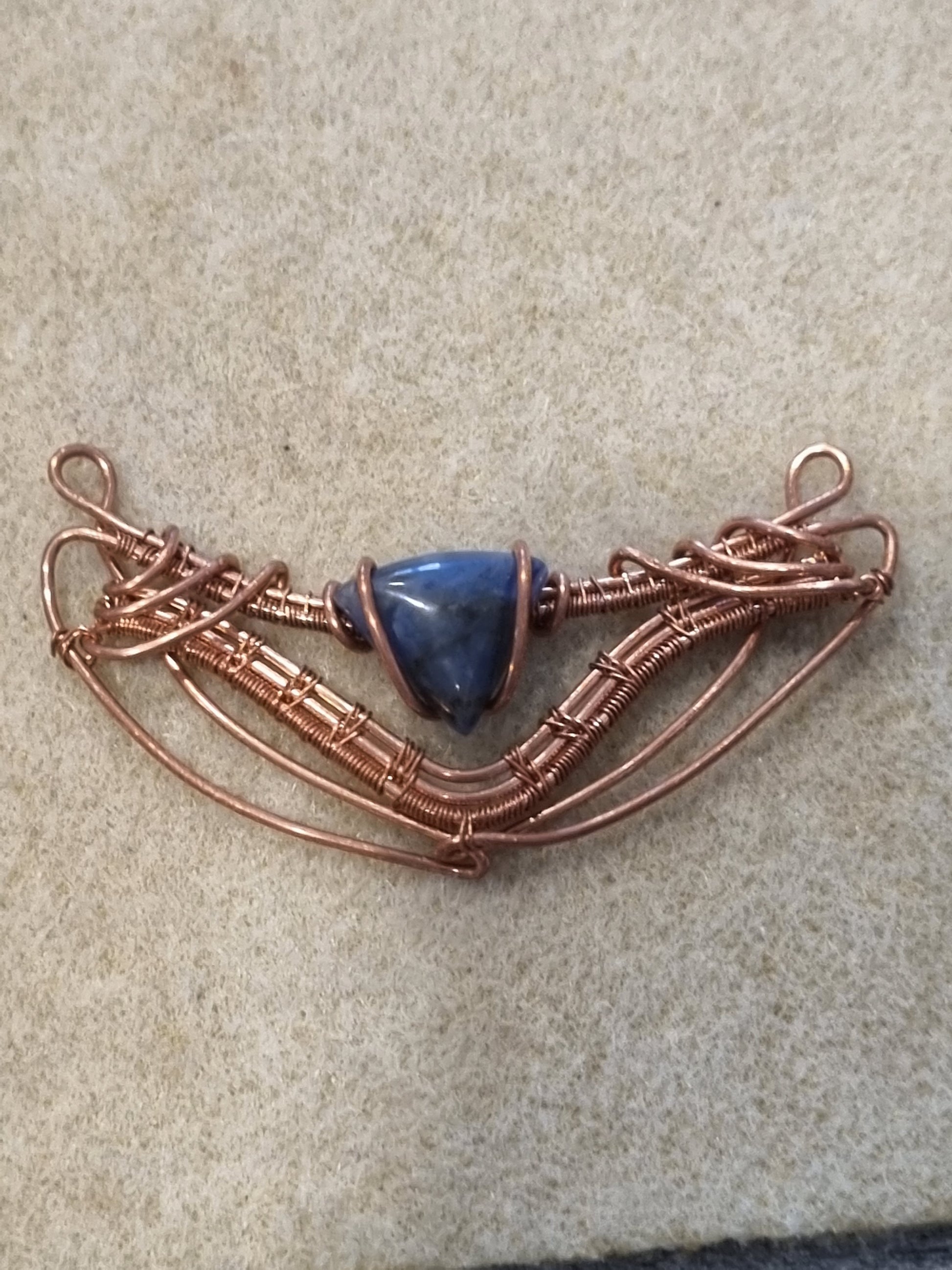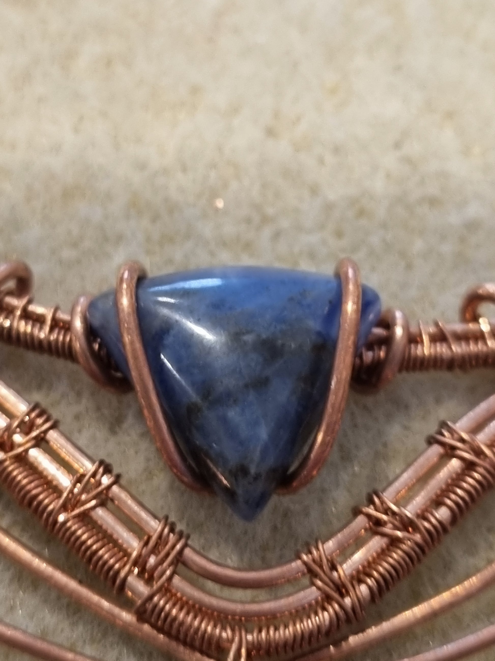 Beautiful sodalite encased in a decorative art deco half moon frame done with copper wire.