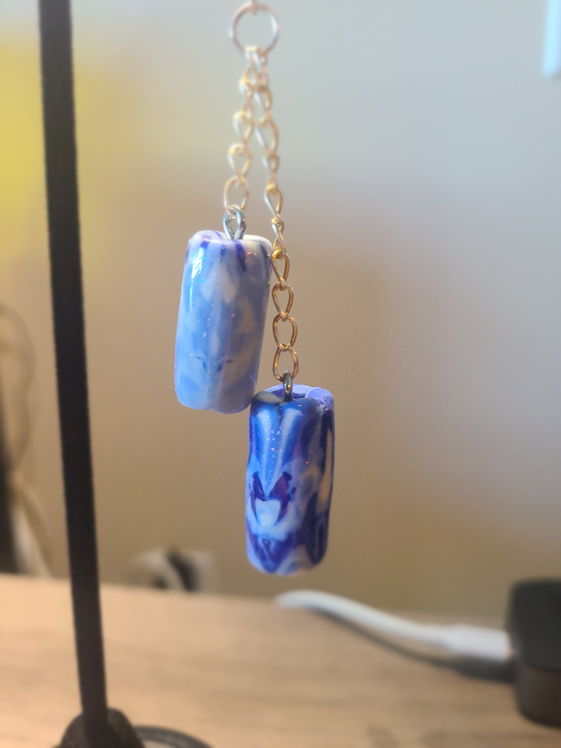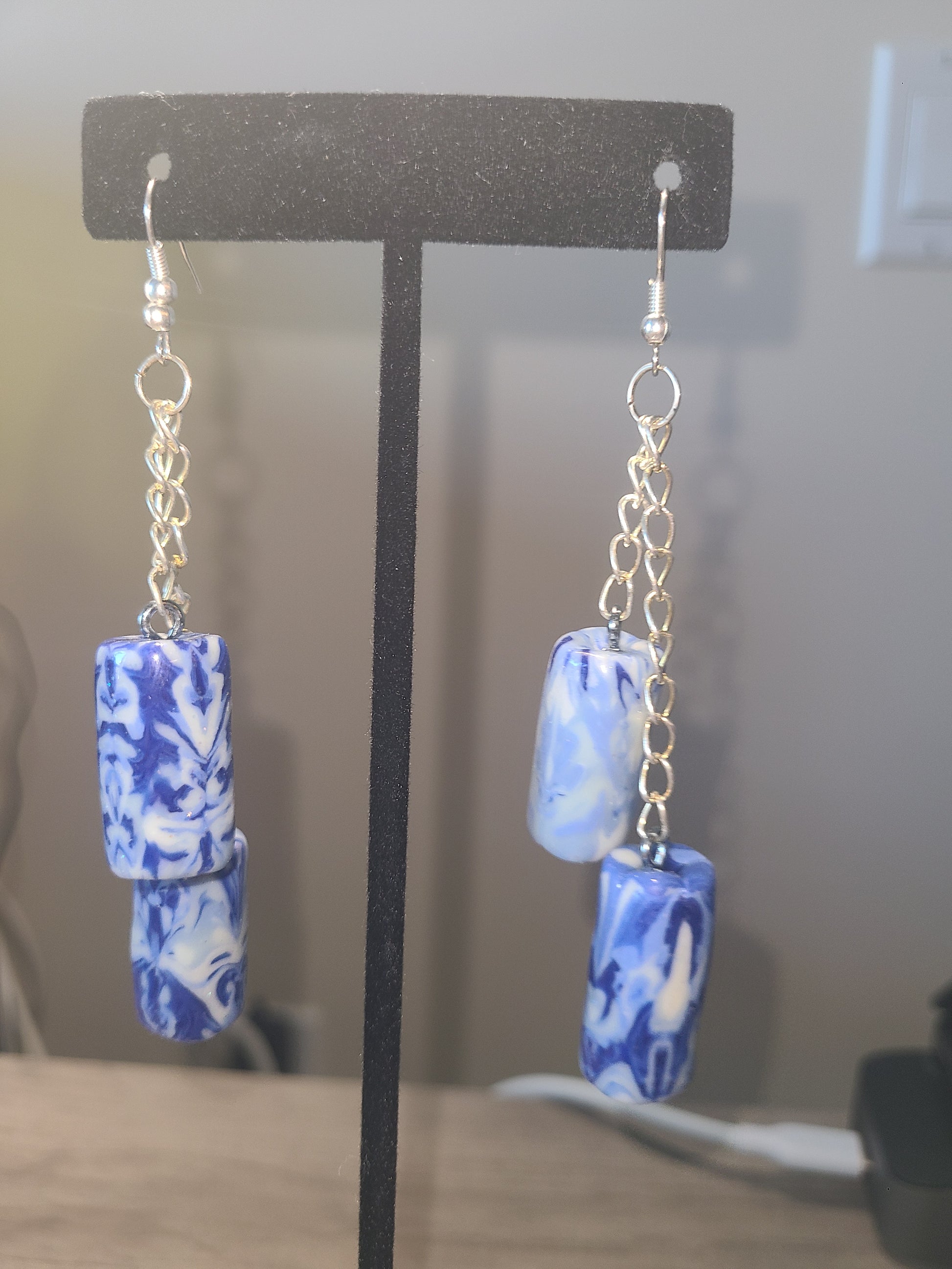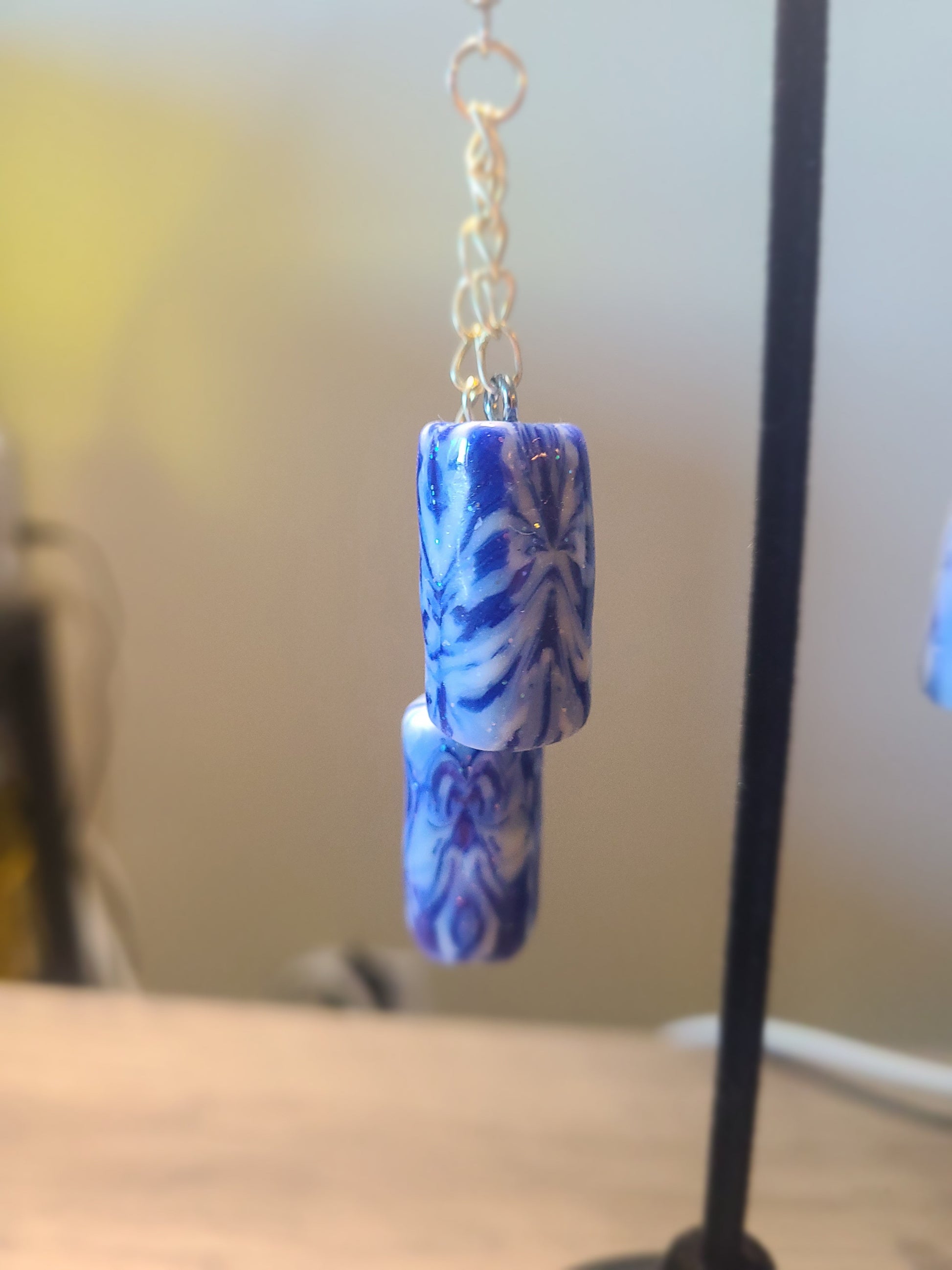 Natasha beads made of polymer clay; the pattern is continuous all around. Two barrels per earring gives it some movement and sound. Each barrel is handmade and therefore none are the same, giving 4 different vibes in one pair of earrings.