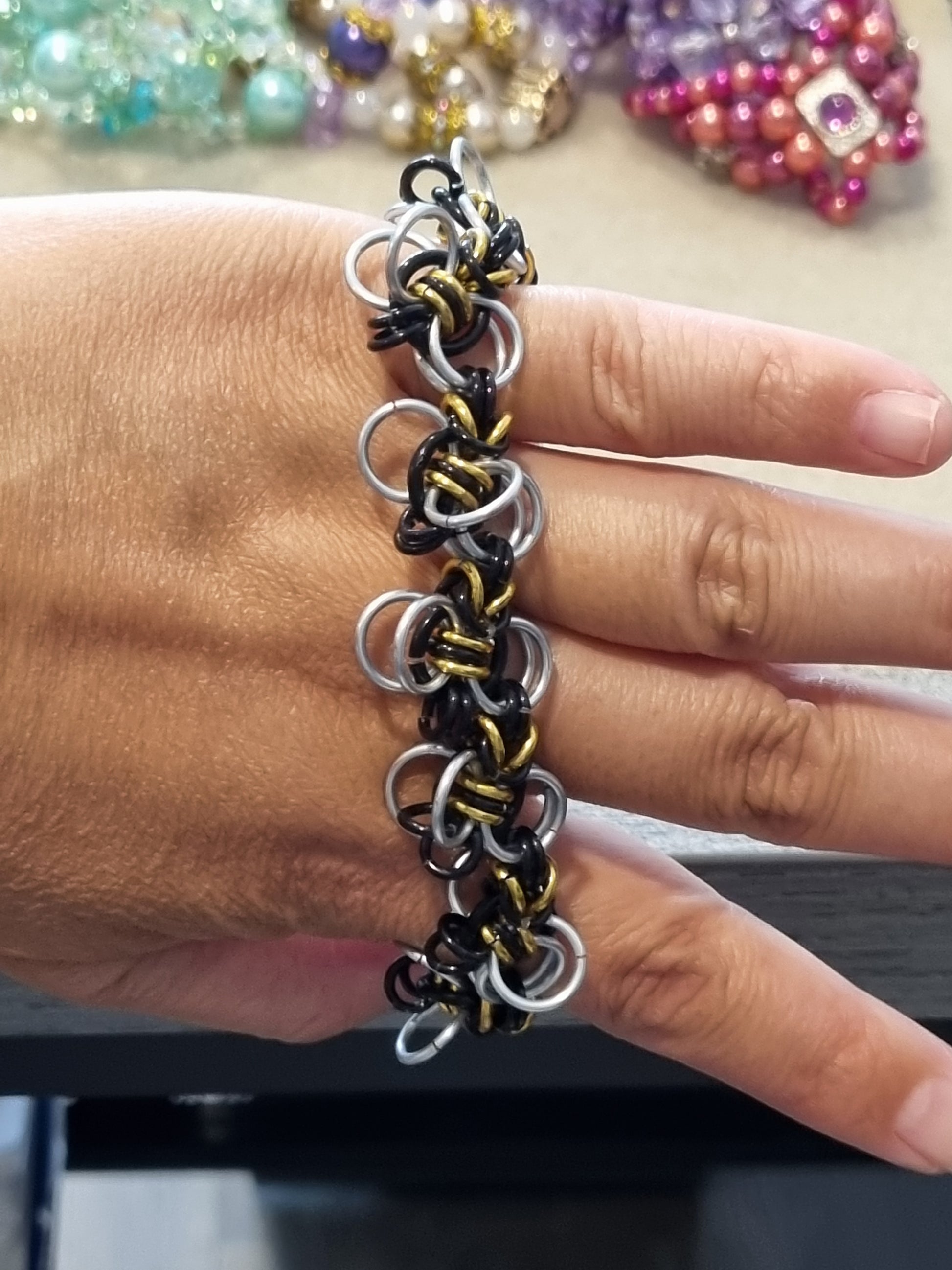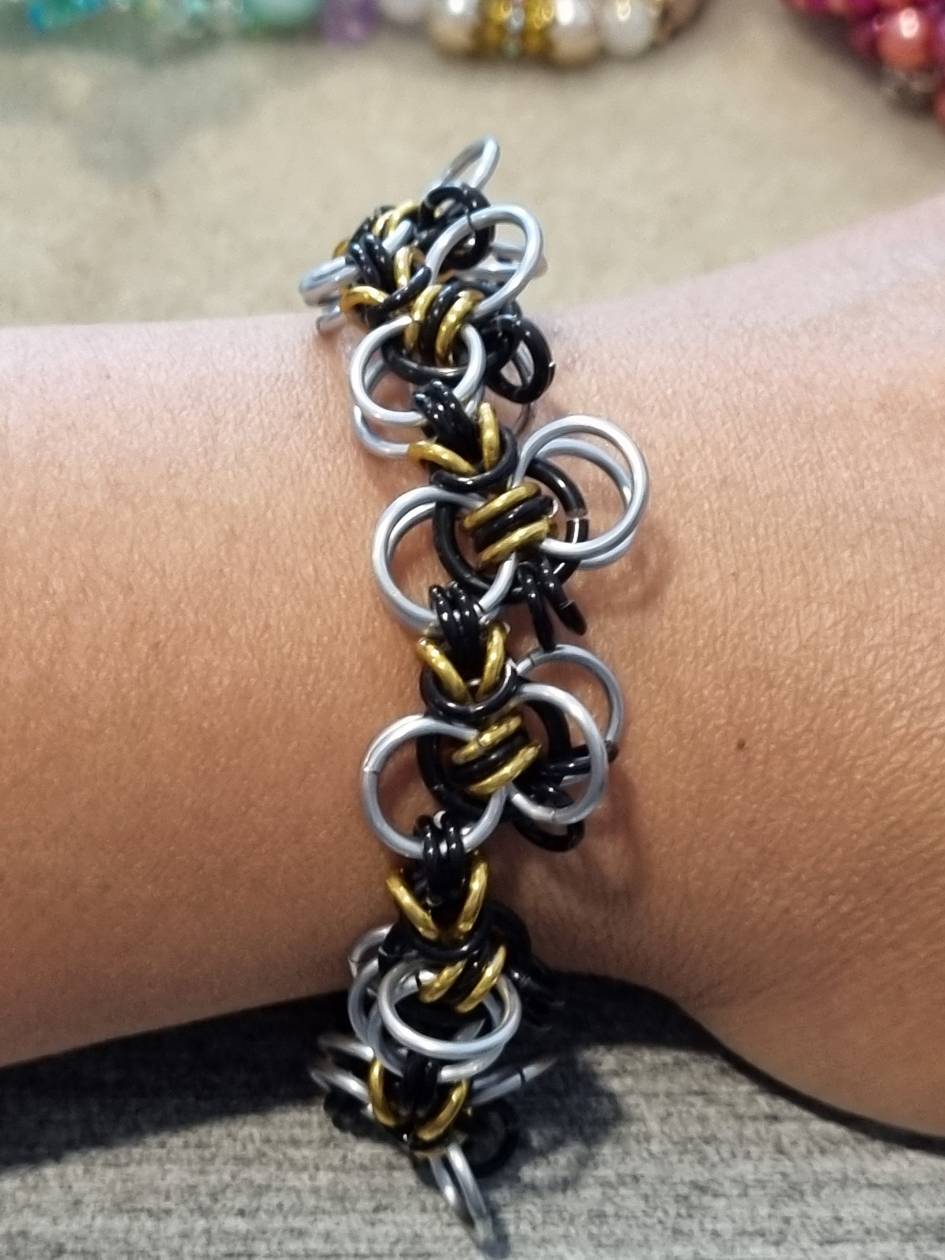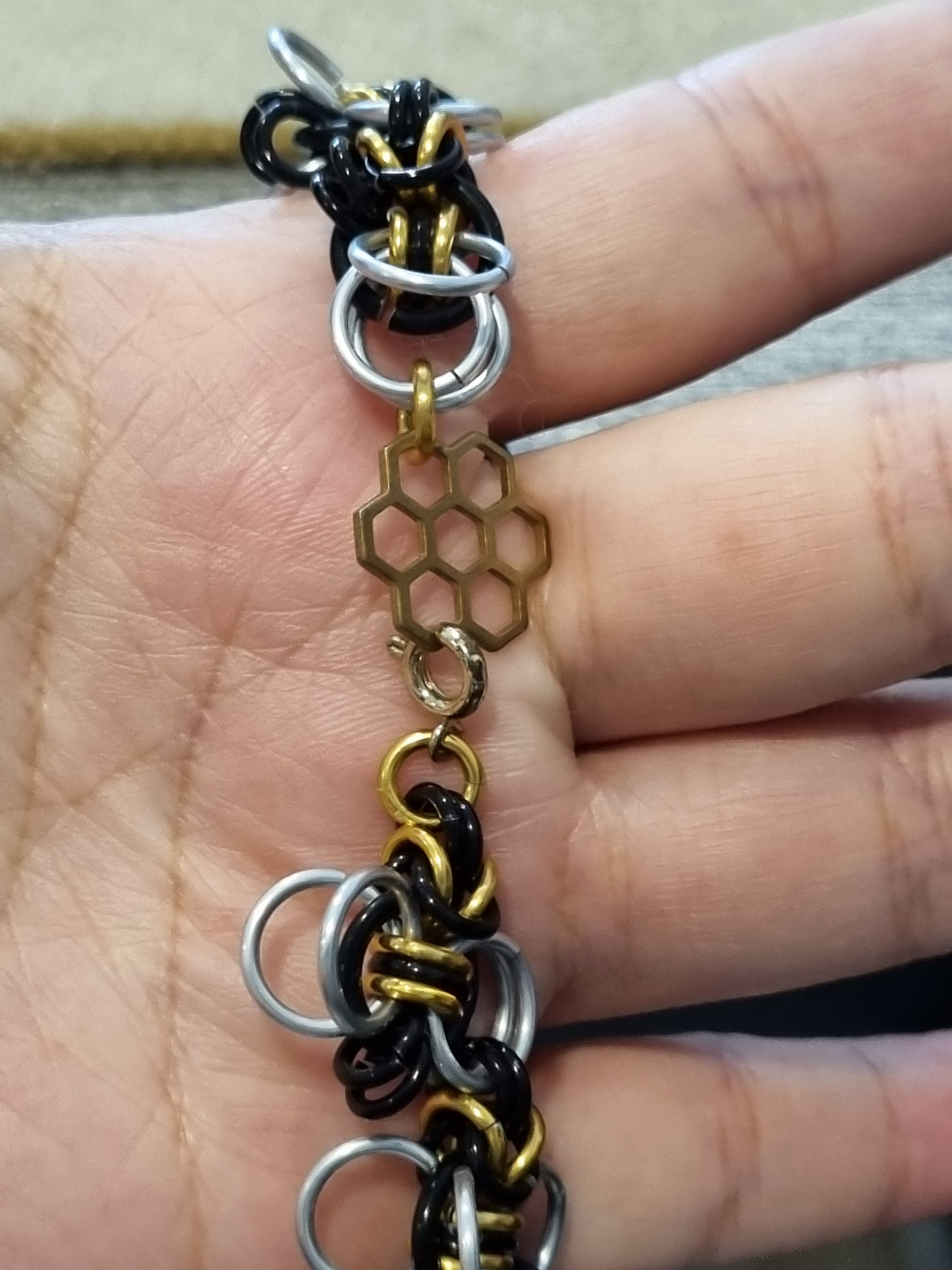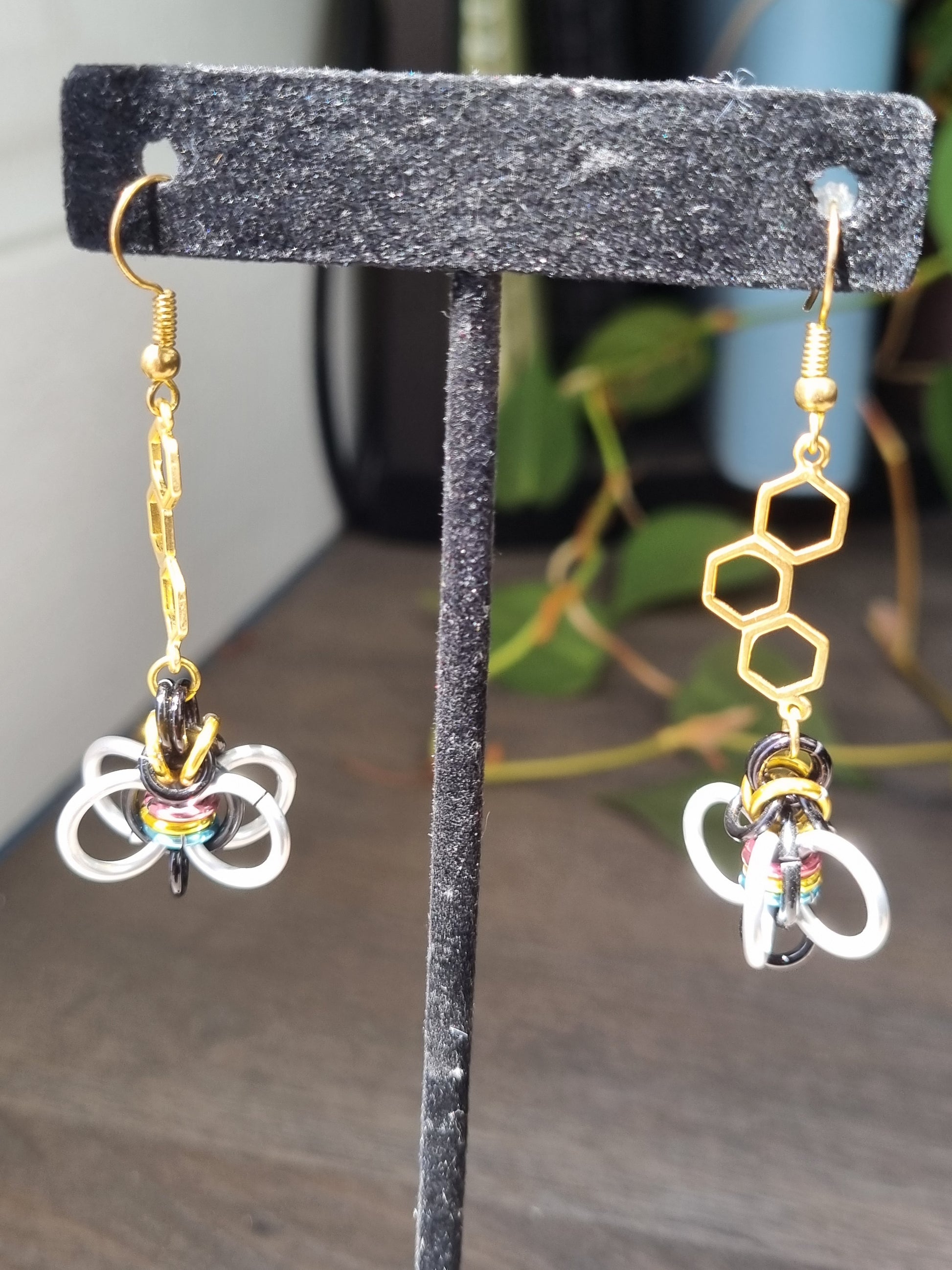 Create a bzzzz with these earrings. Done with aluminum jump rings. Bees dangling off the honeycomb.