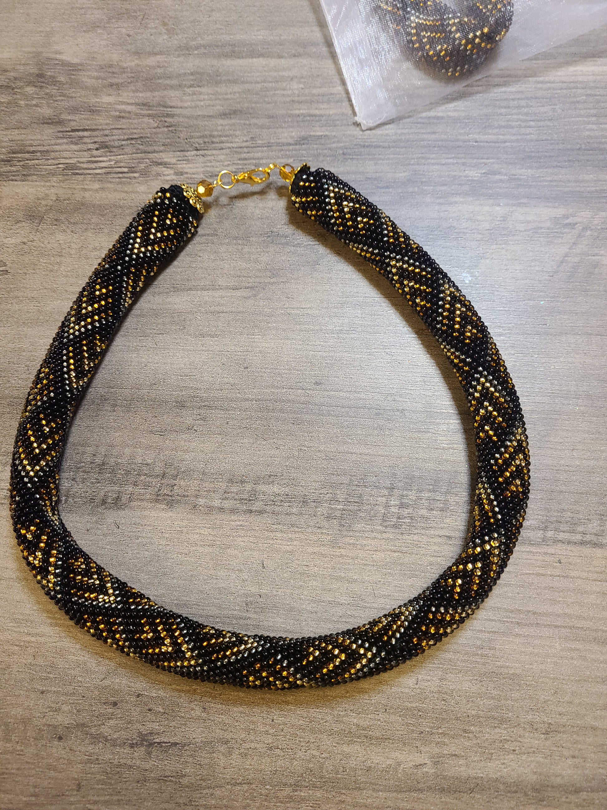 This set is a beaded crochet design by Crazyyy Academy. The design is done with transparent seed beads. It's soft and flexible.