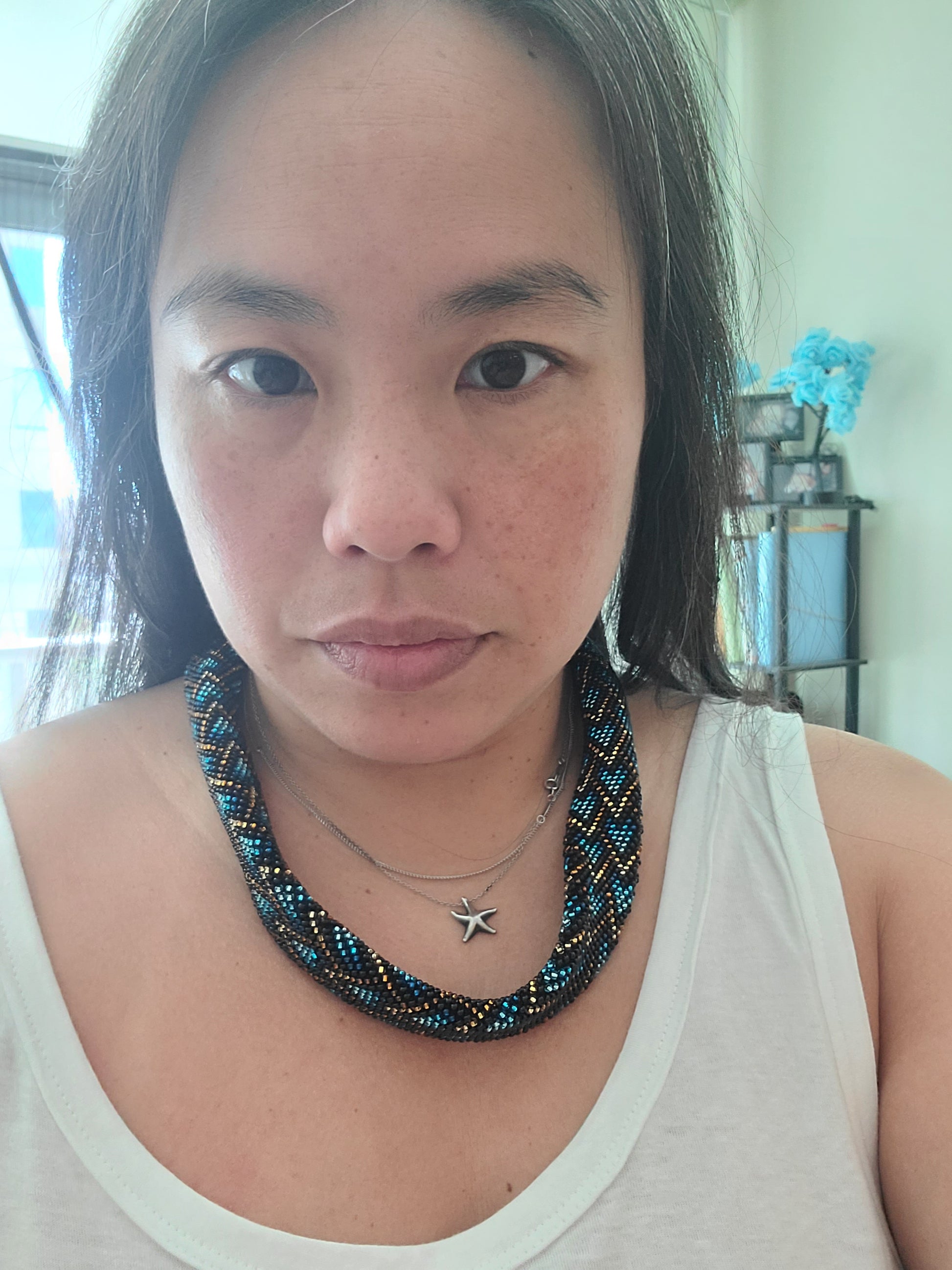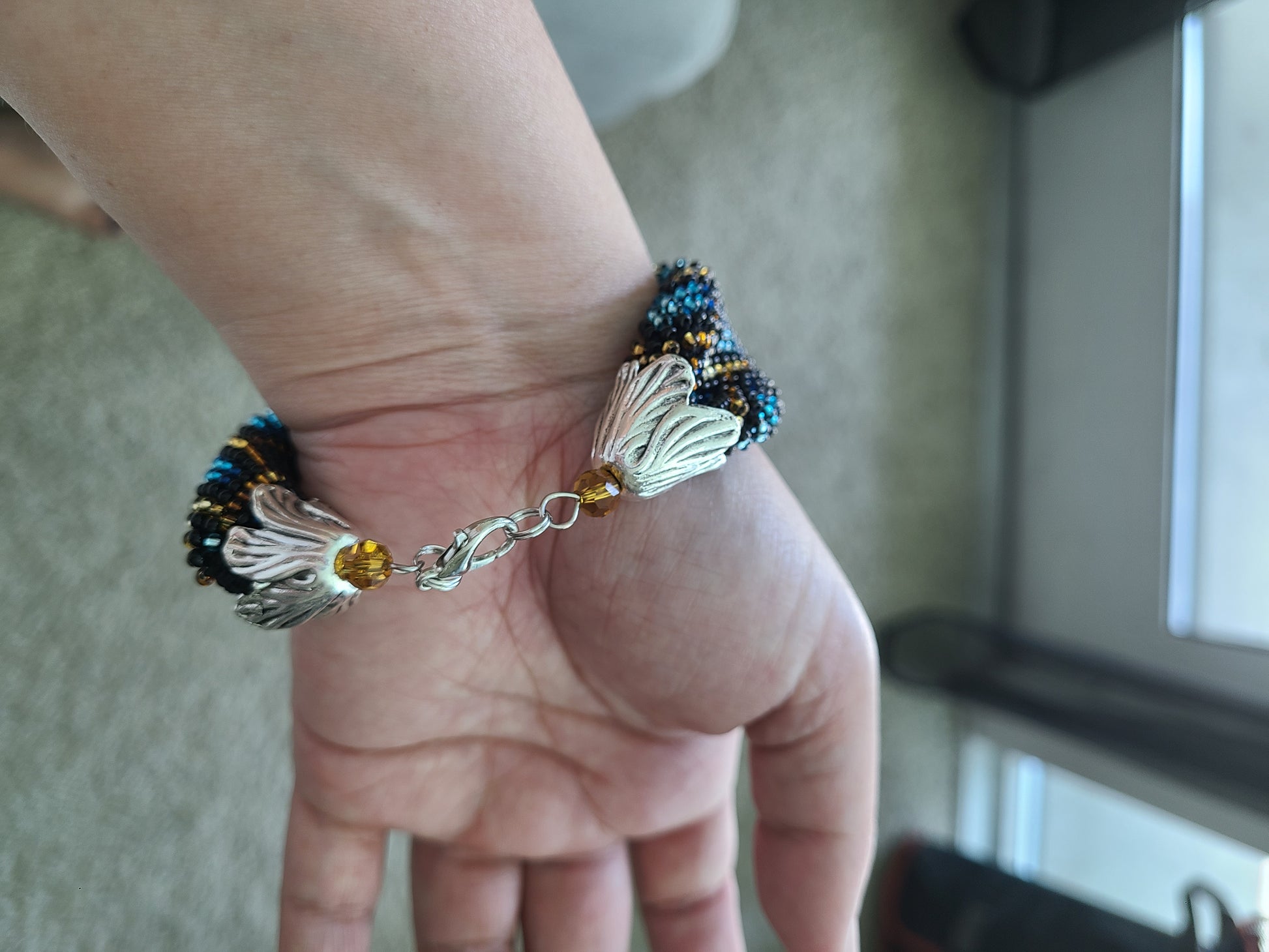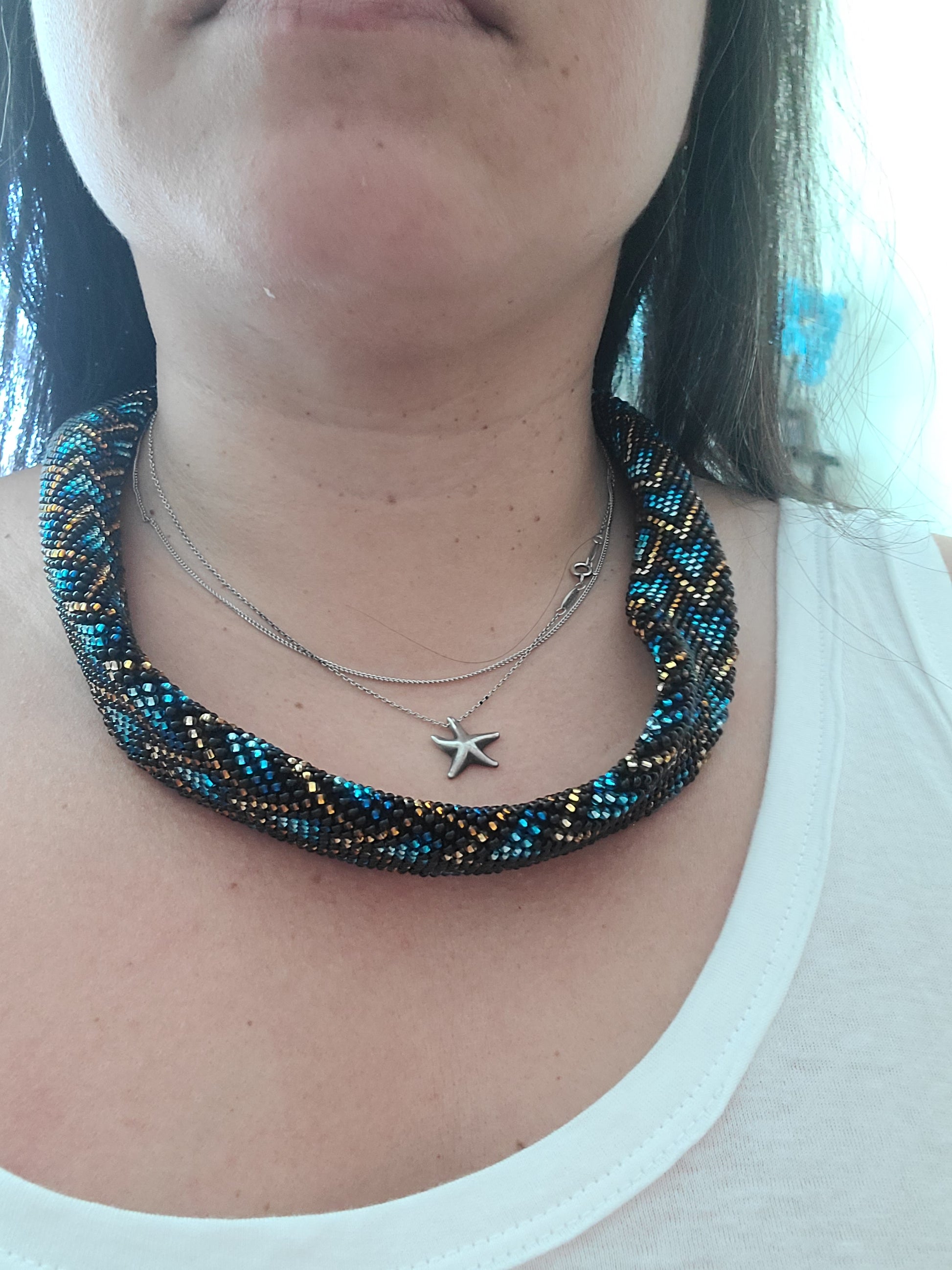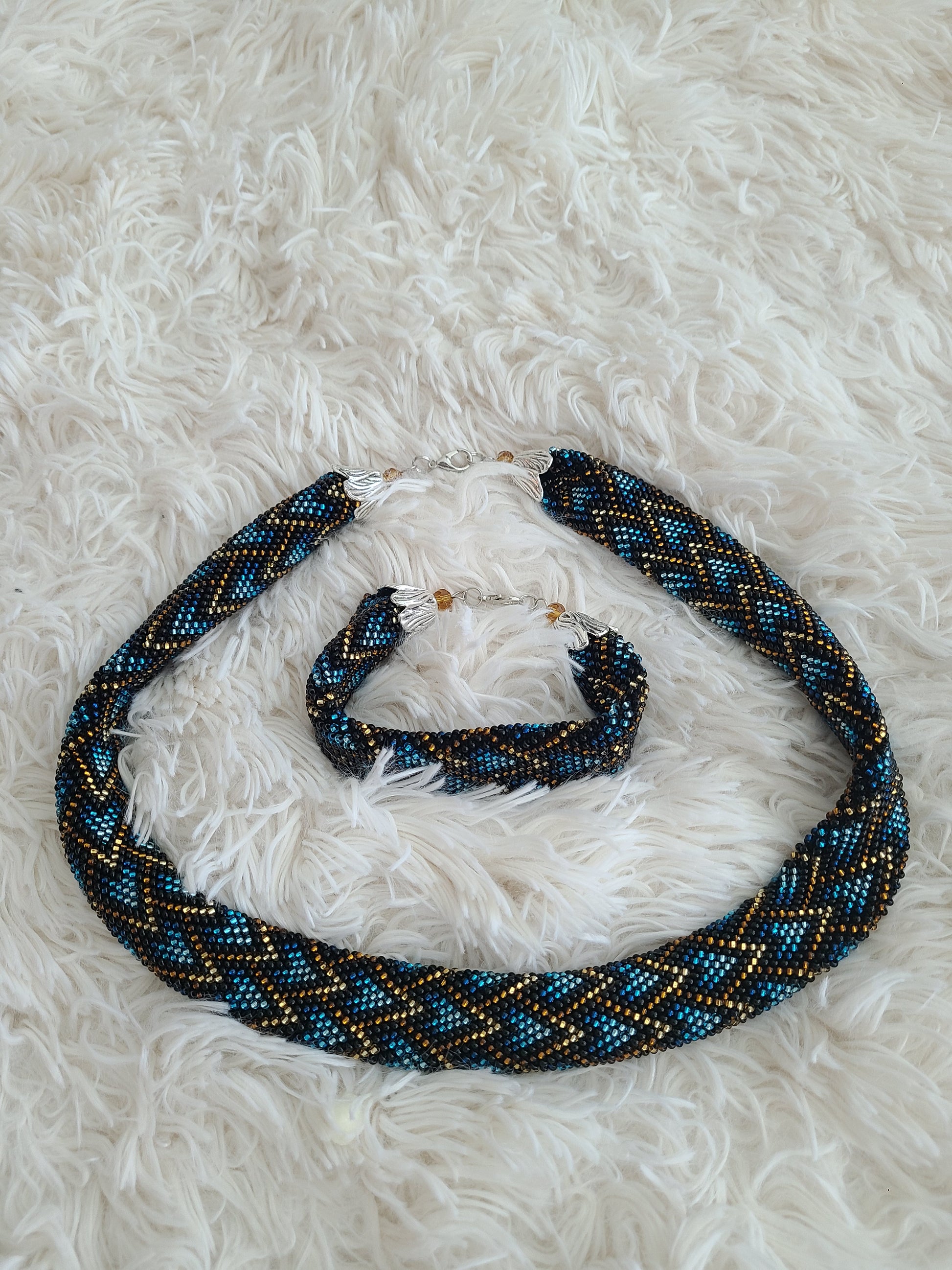 This set is a beaded crochet design by Crazy Academy. The design is done with transparent seed beads. It's soft and flexible.