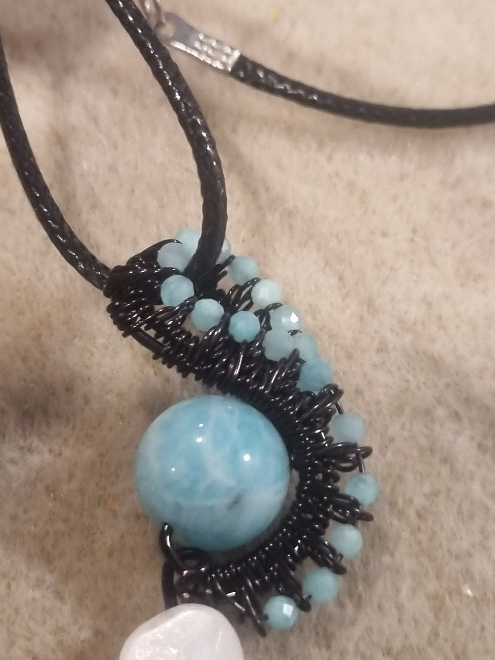 Aquamarine Bead wire wrapped with an amazonite beaded wrap and accented with a moonstone.