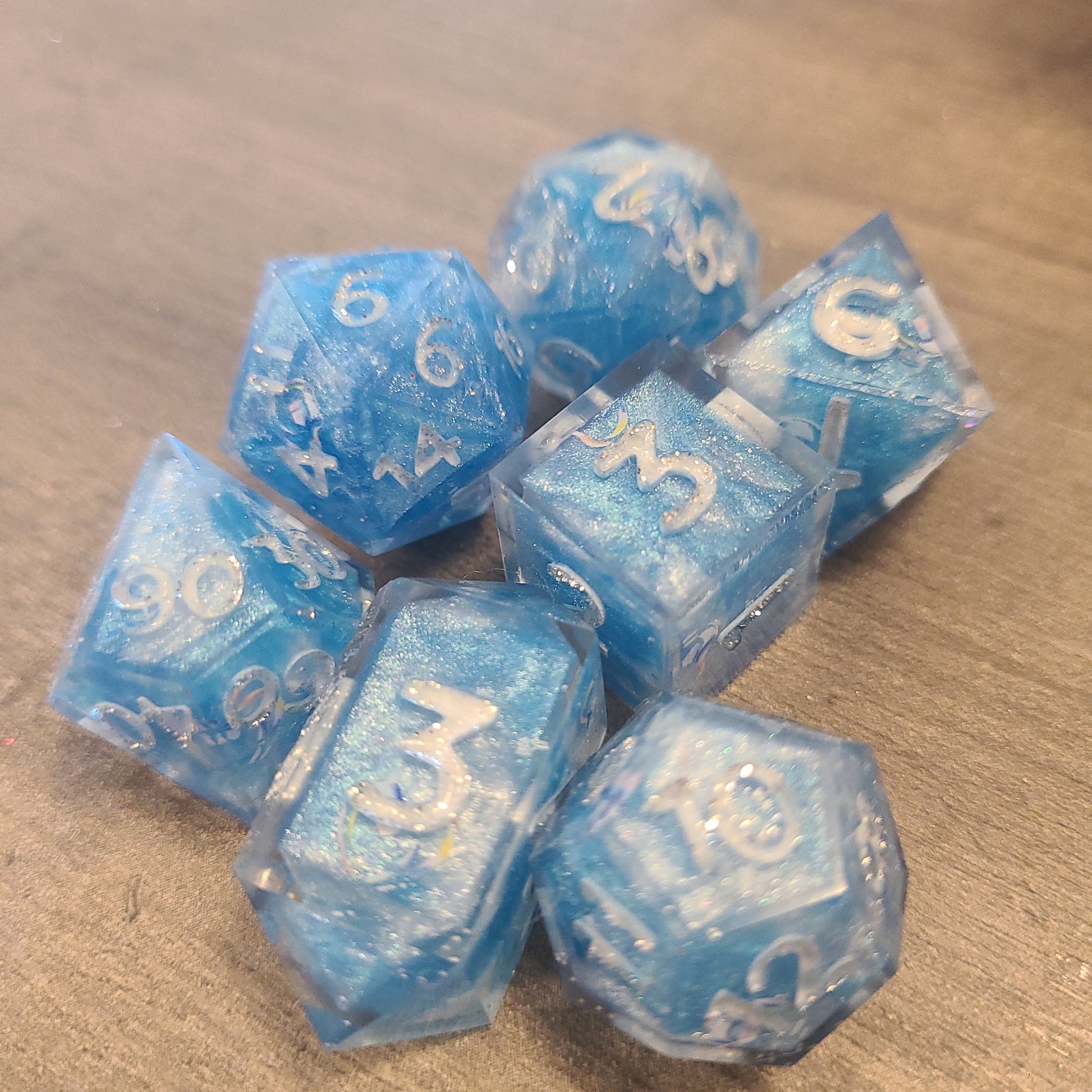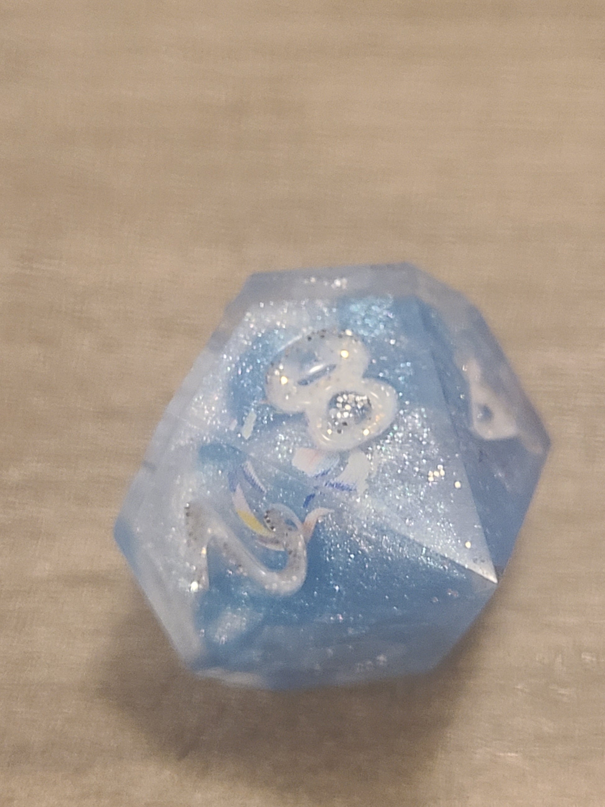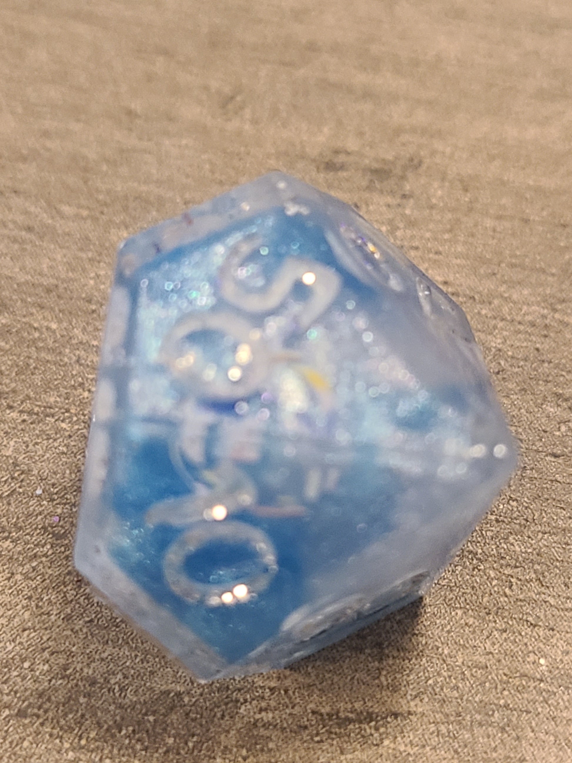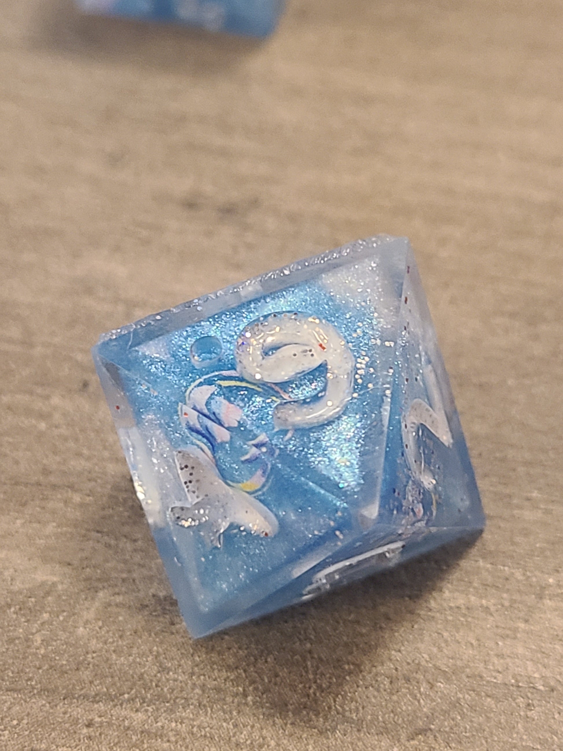 These have dice blanks done with a 2 color pour of blue and white. Then I decorated with rainbow bubble nail stickers and recast with their numbers.