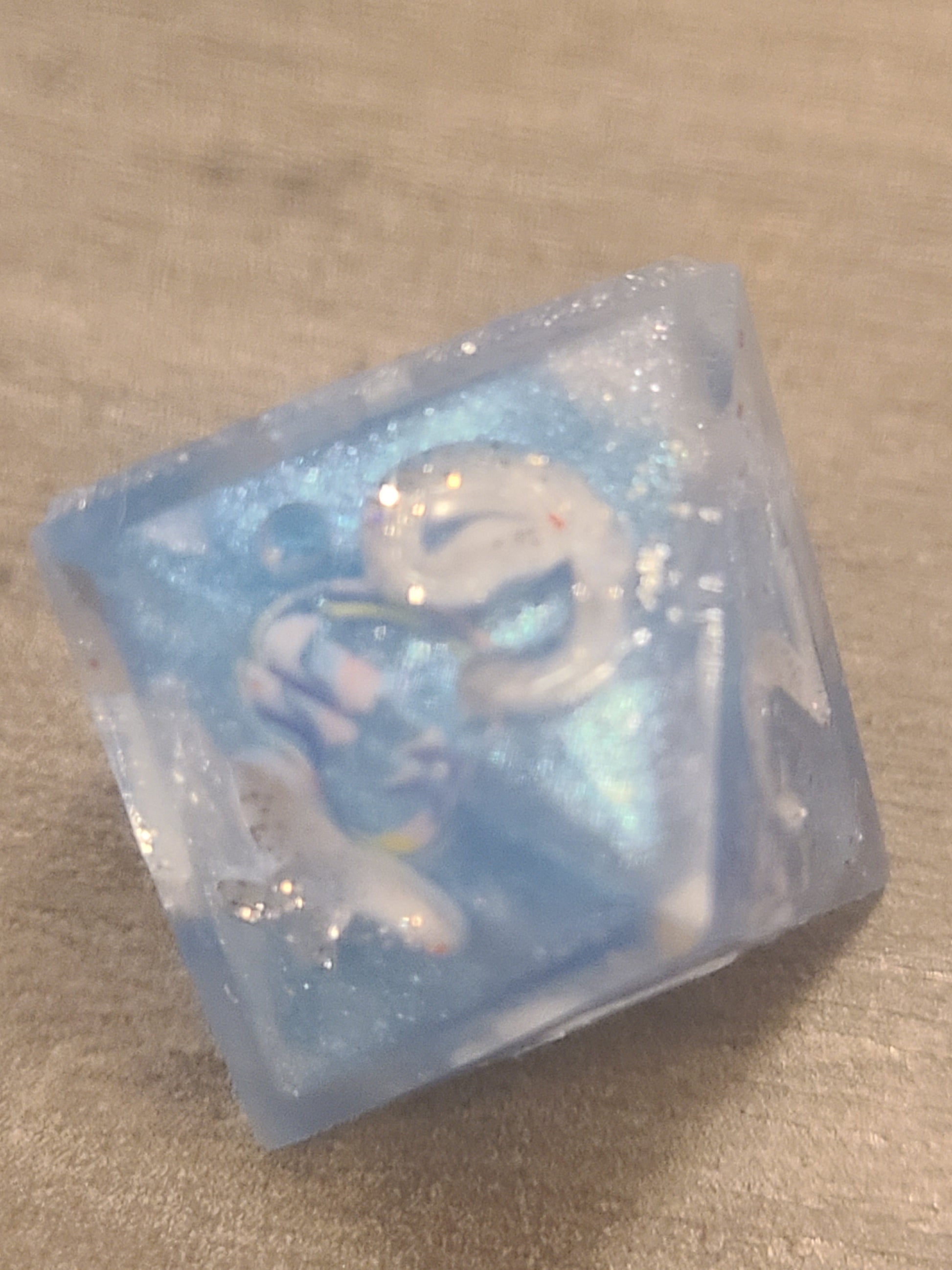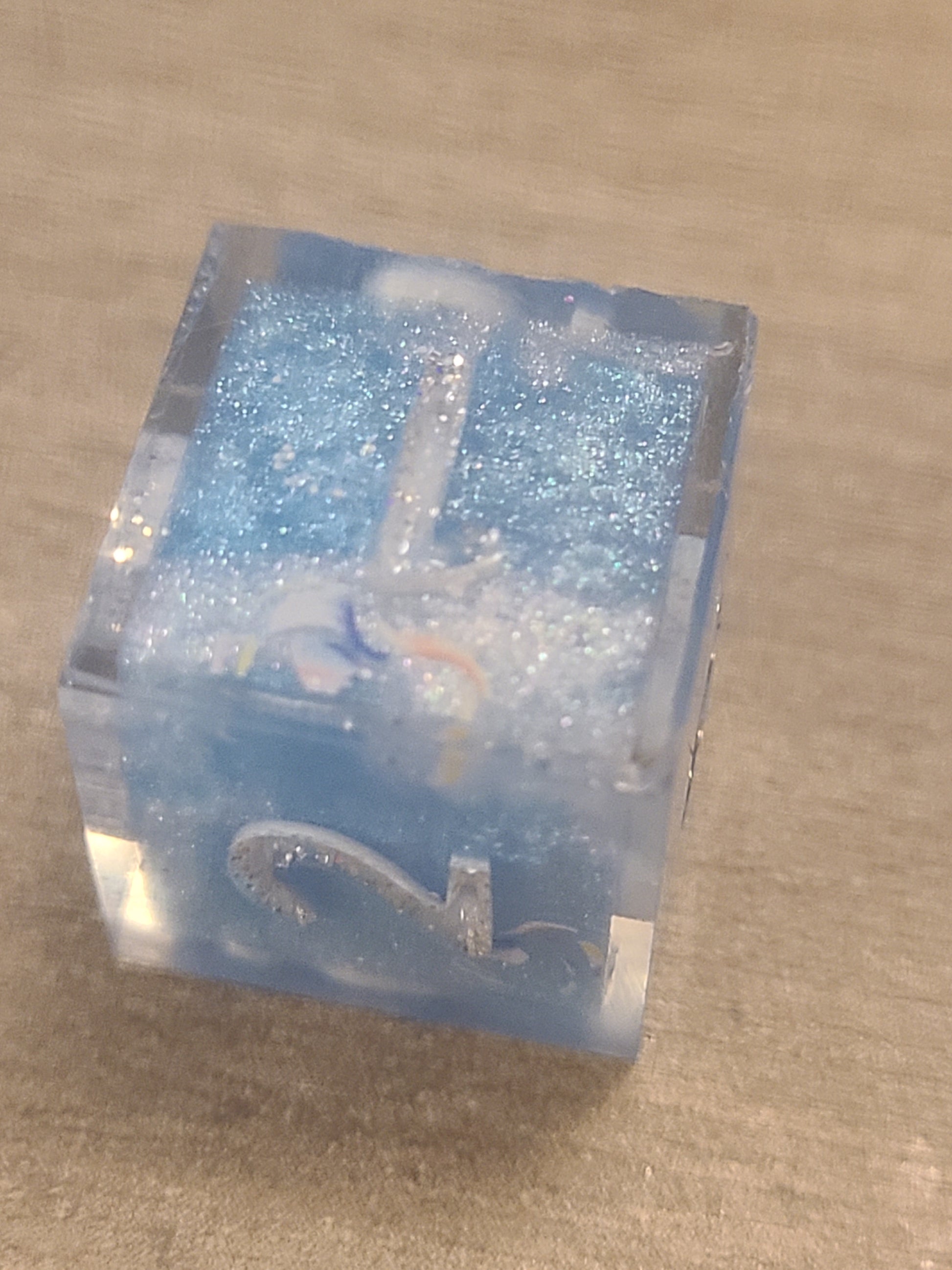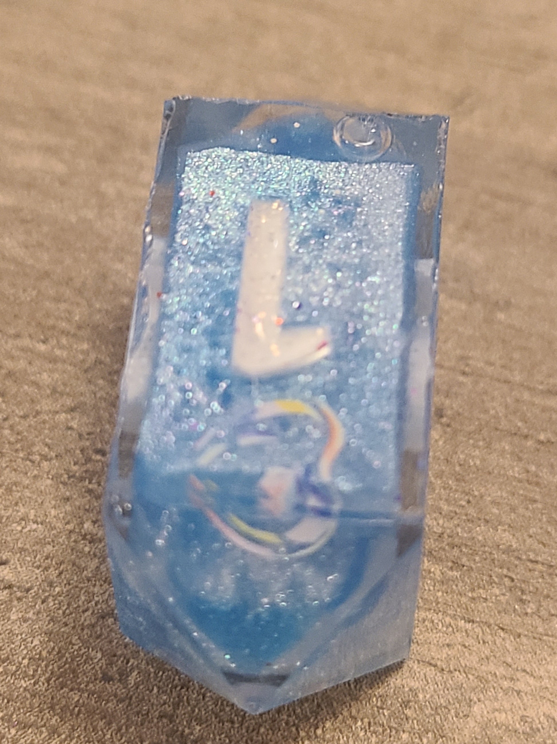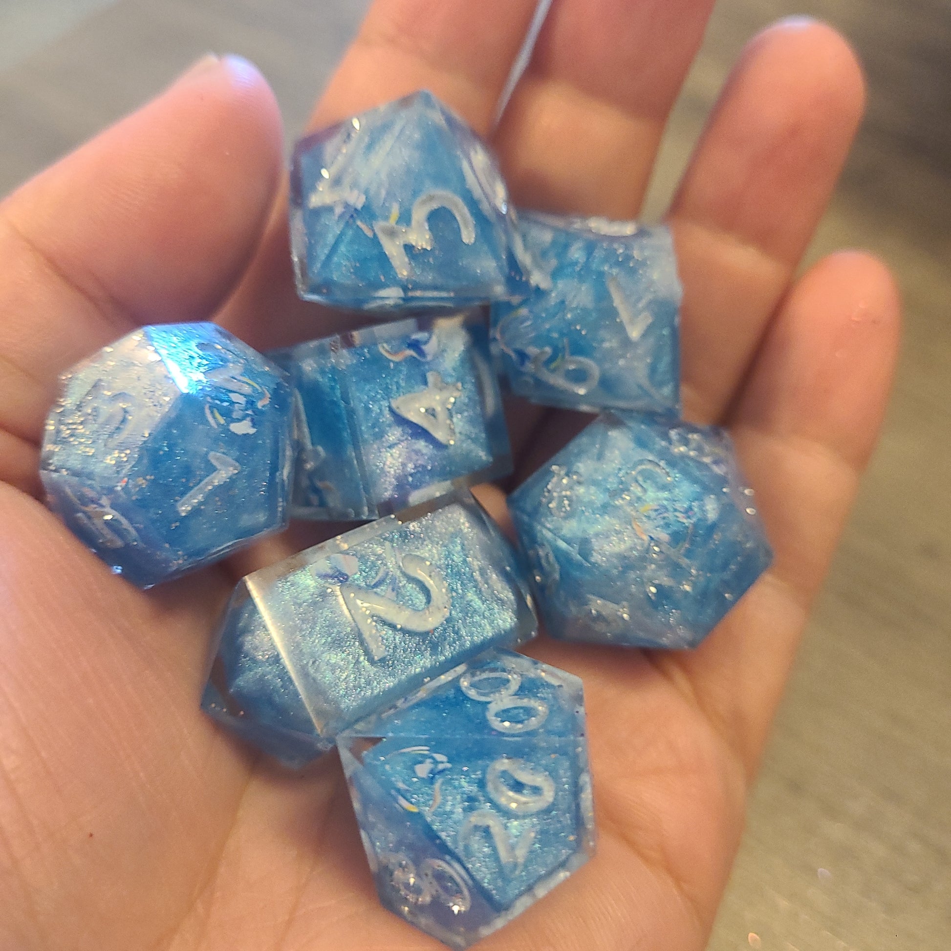 These have dice blanks done with a 2 color pour of blue and white. Then I decorated with rainbow bubble nail stickers and recast with their numbers.