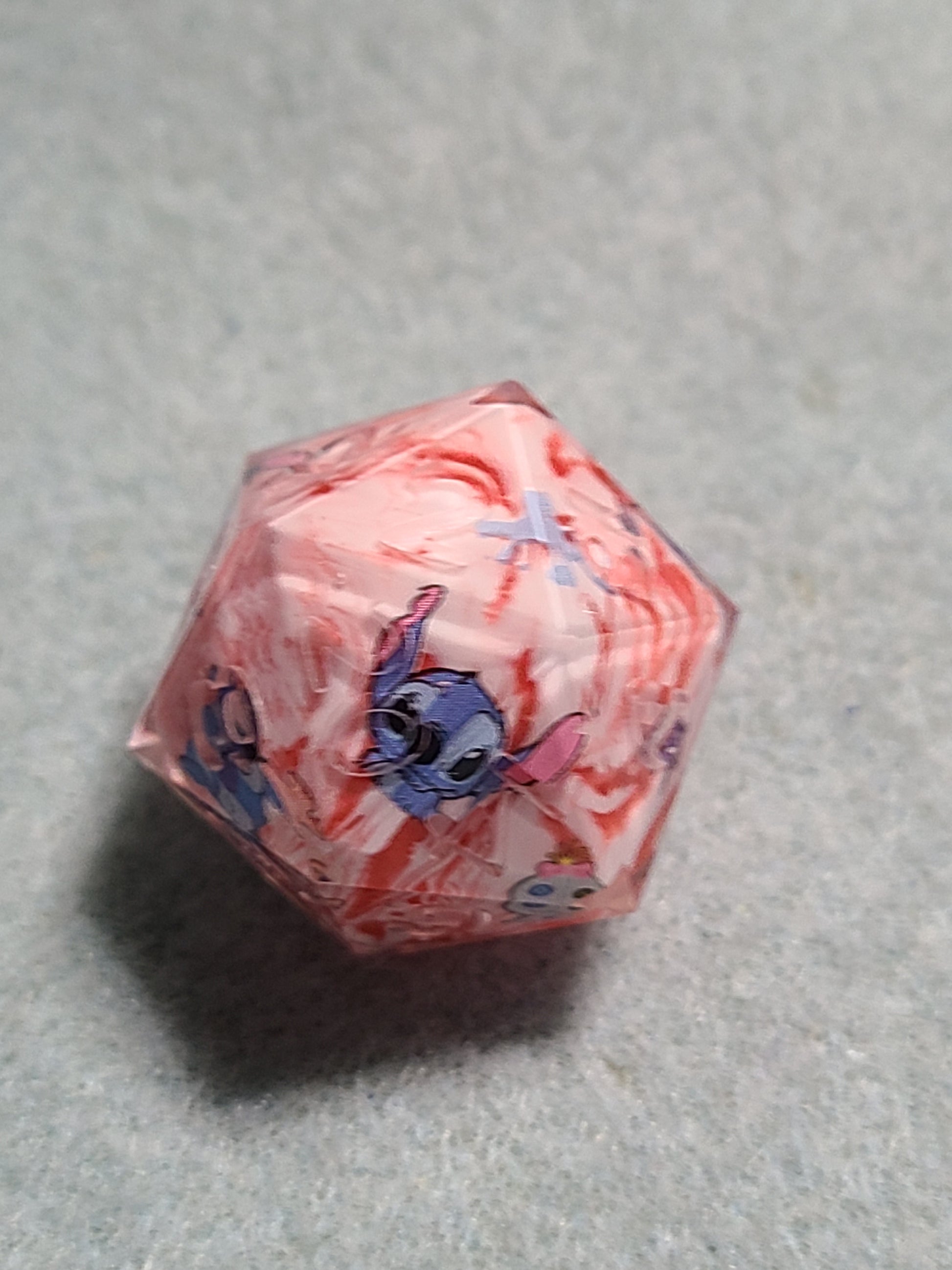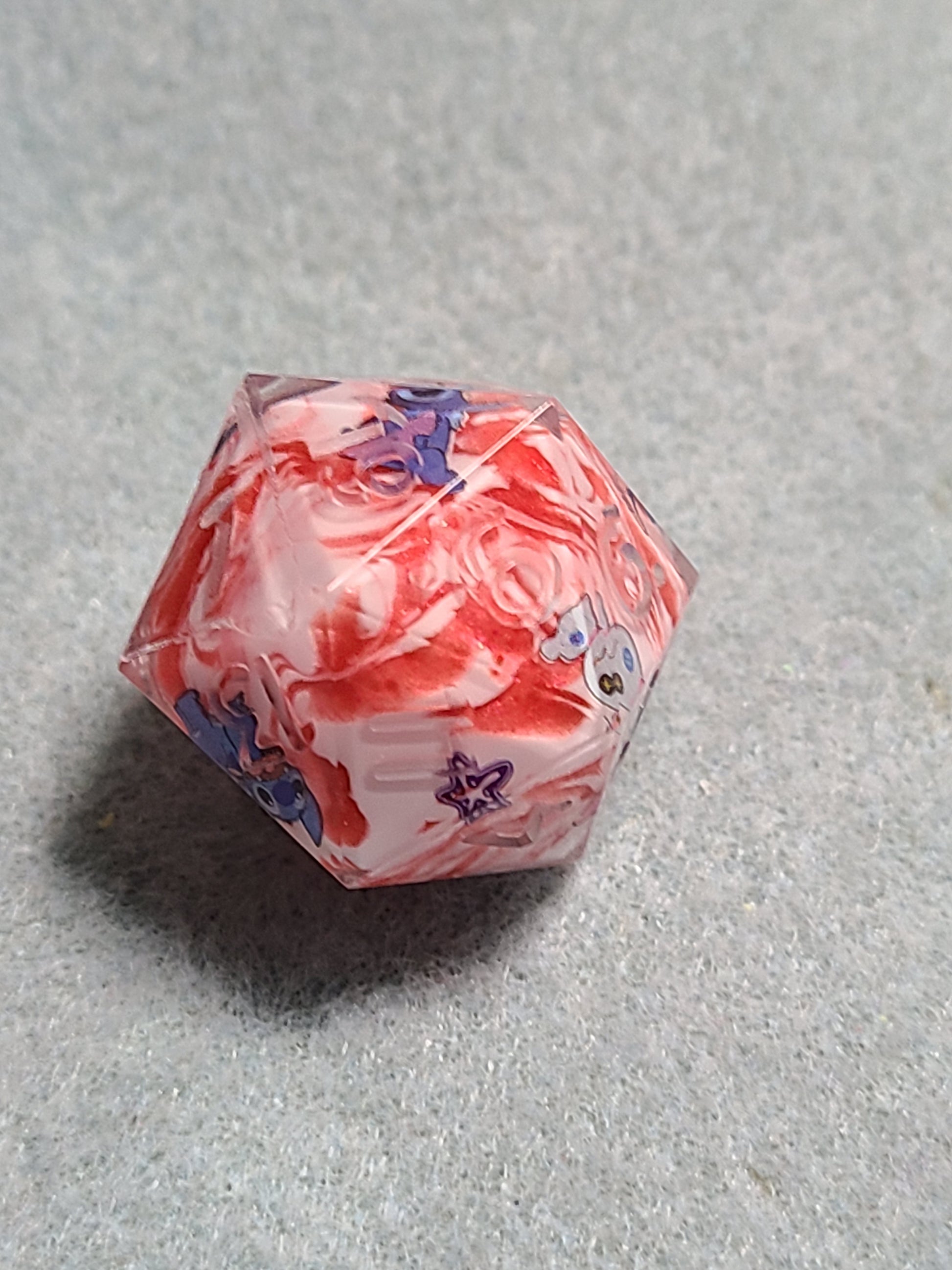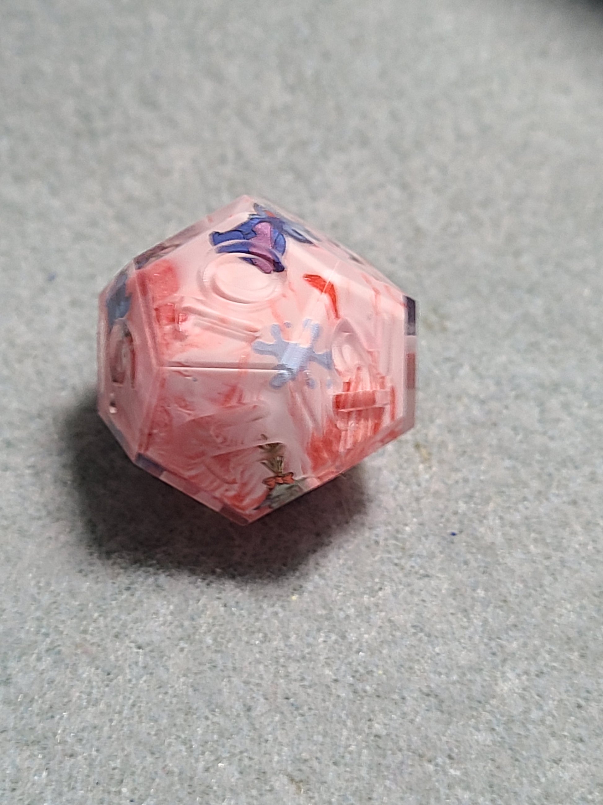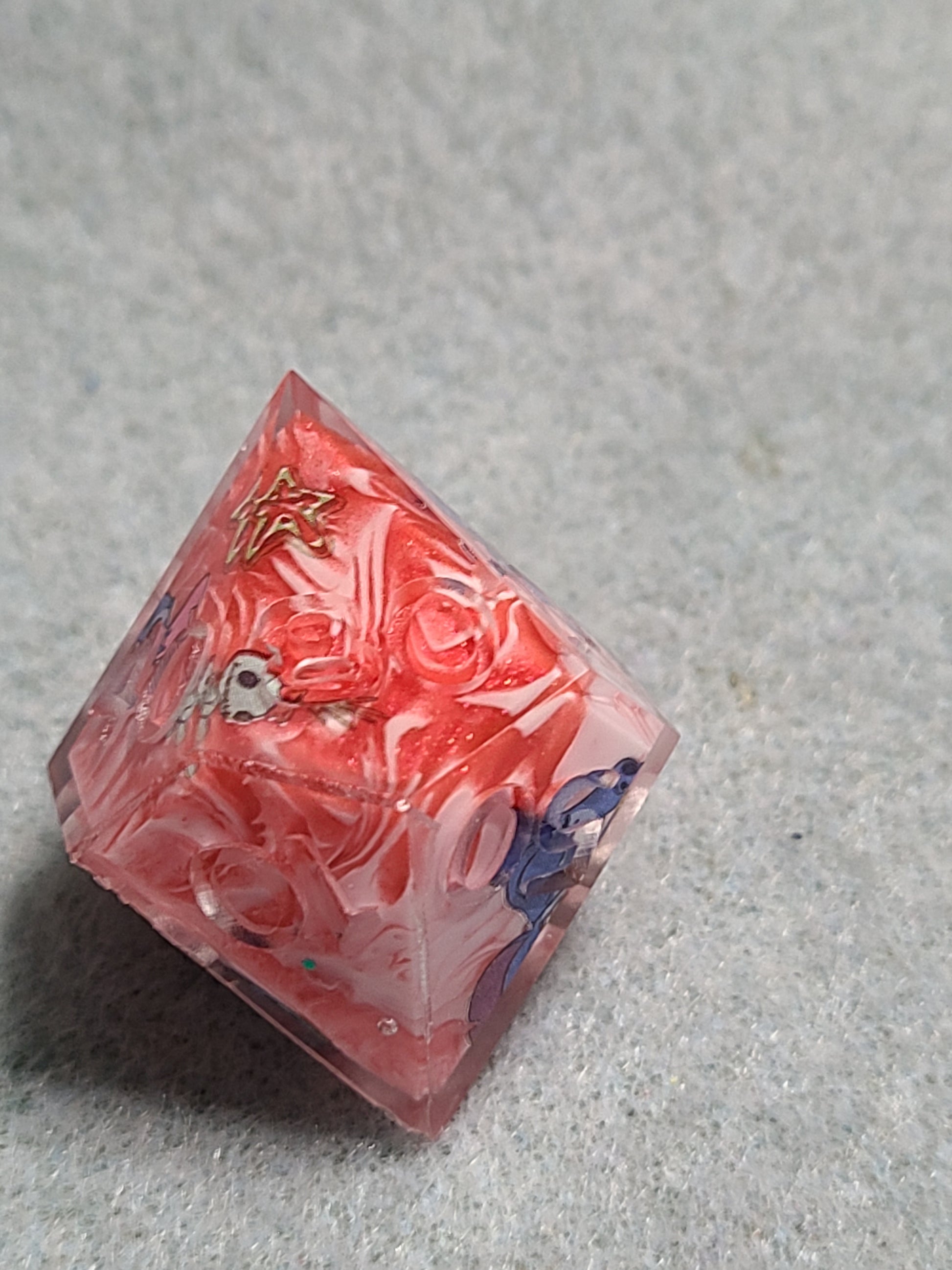 These have dice blanks done with a 2 color pour of redand white. Then I decorated with stitch nail stickers and recast with their numbers.