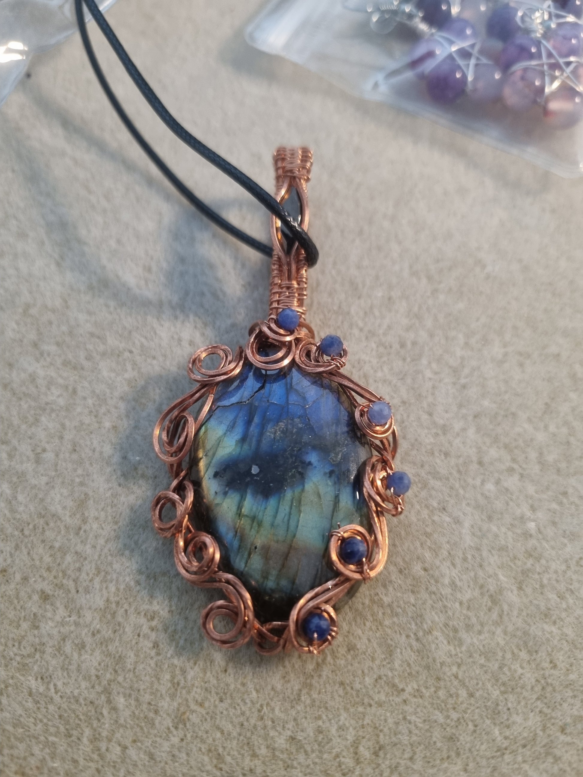 Labradorite Oval Cab with a crack in it!!! Black rhinestone and sodalite accents. Wrapped with copper.