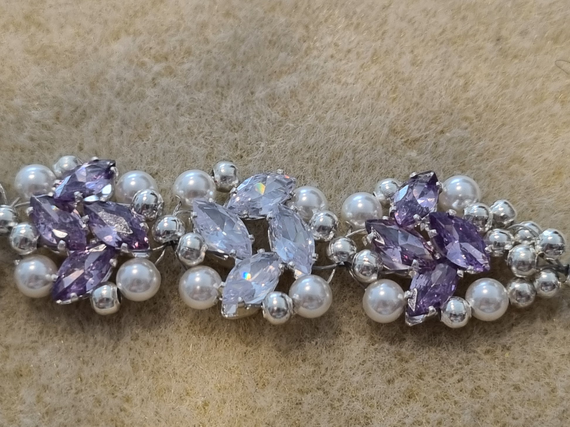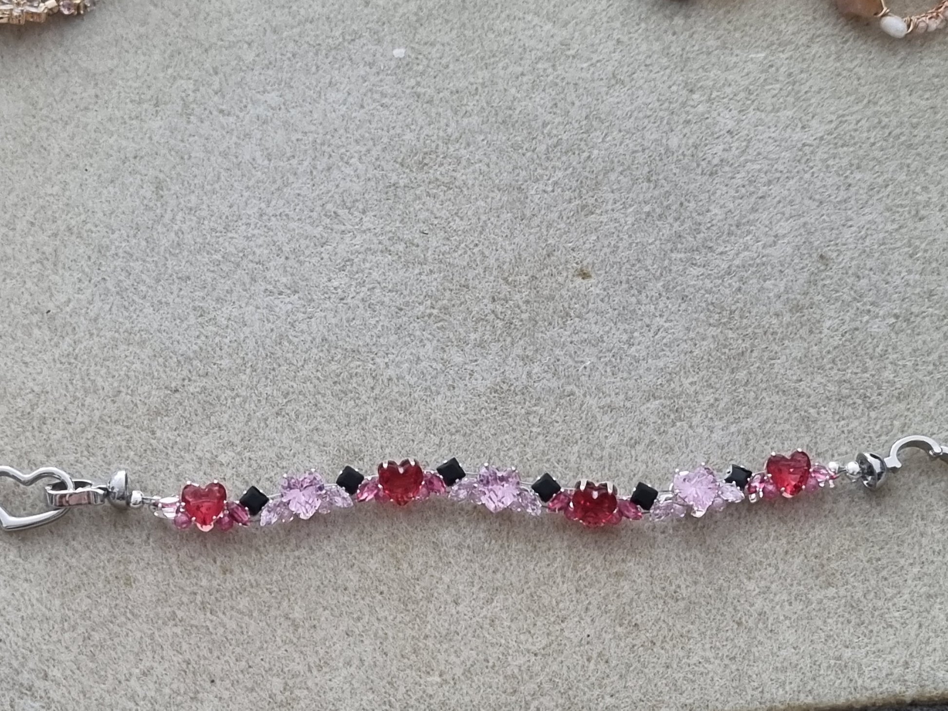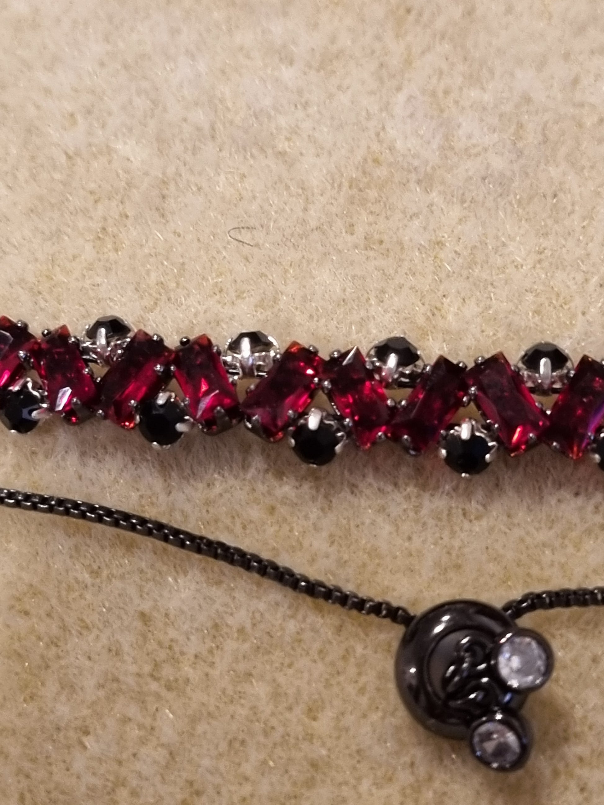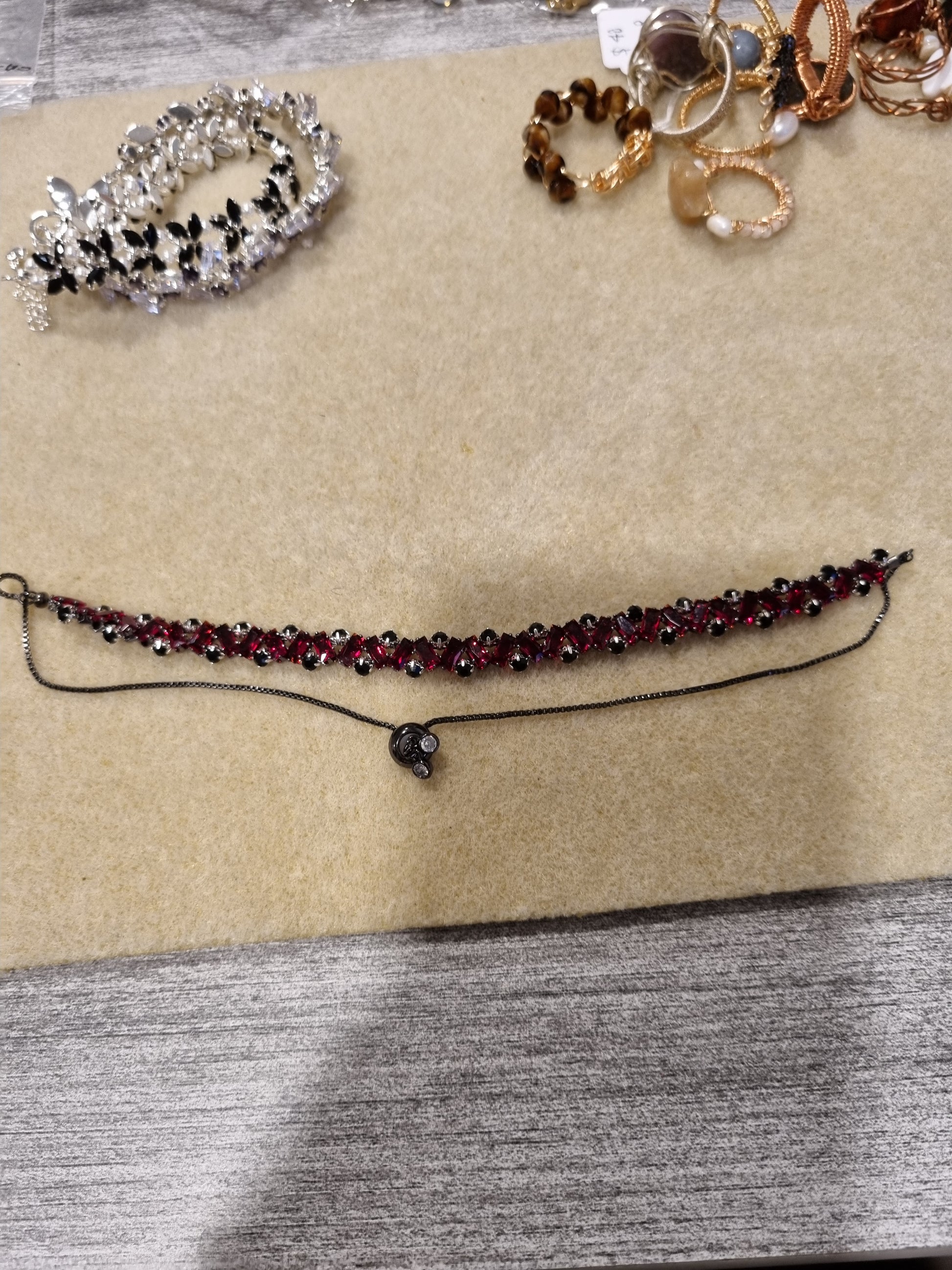 These are made of copper accents and a mix of glass, crystal, and zircon beads for maximum bling. These are all clasped with about an average of 6" length. If you need something different, please reach out.