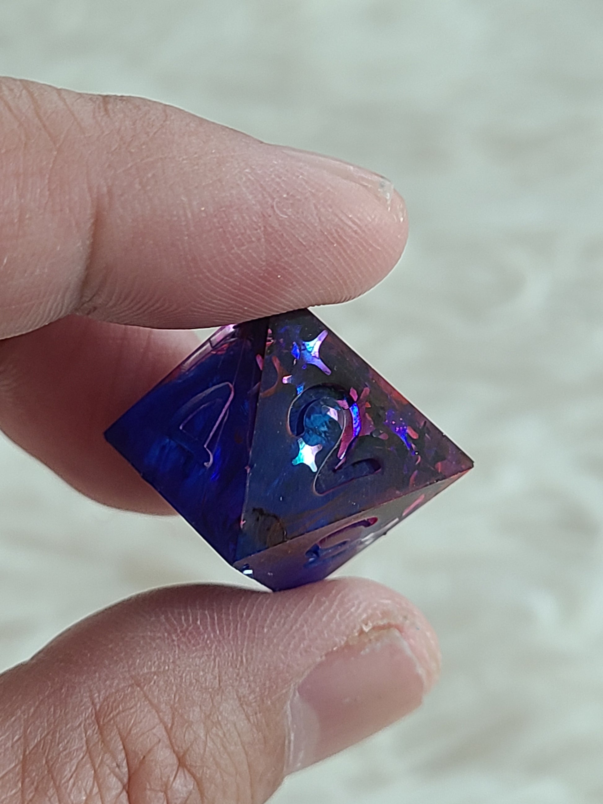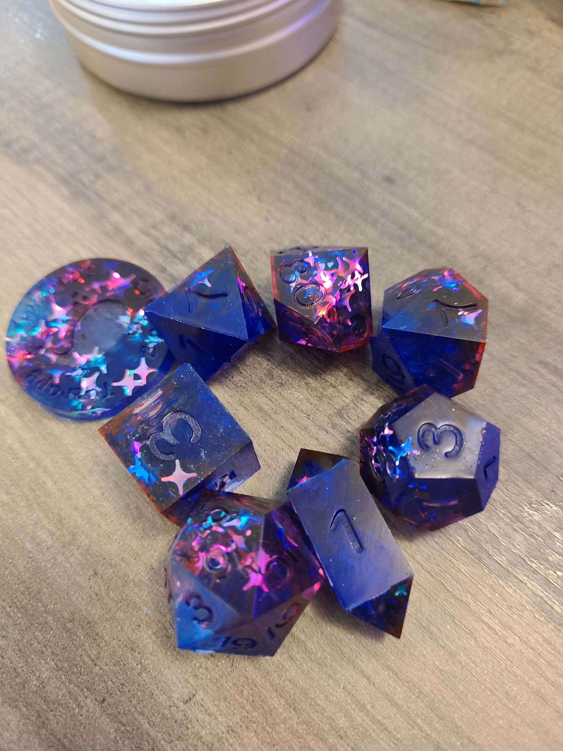 These dice are done with a blue and pink and star triple dirty pour. They came out a big darker than I hoped and so I have discounted them because they were not my vision - but they are perfect.