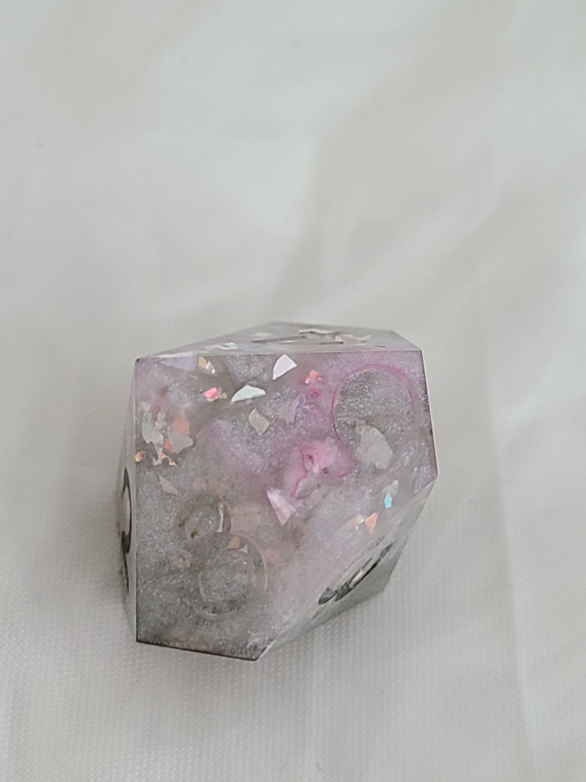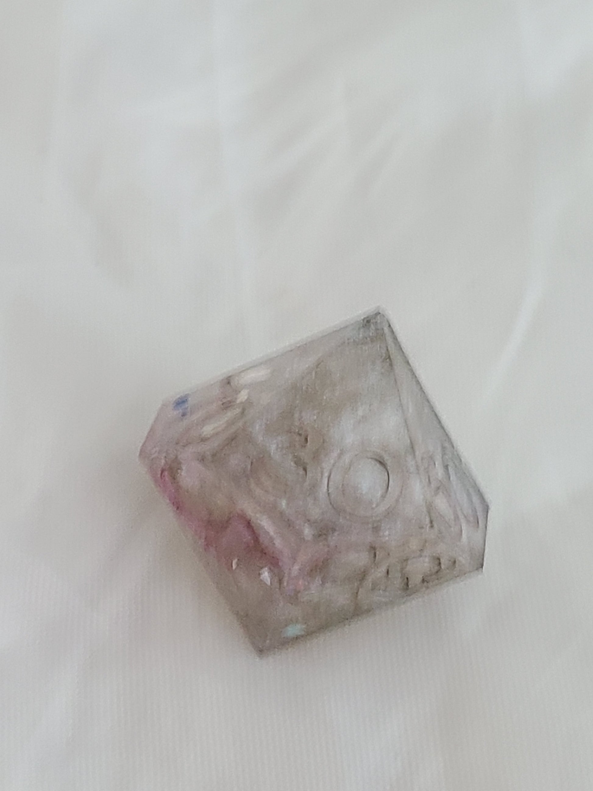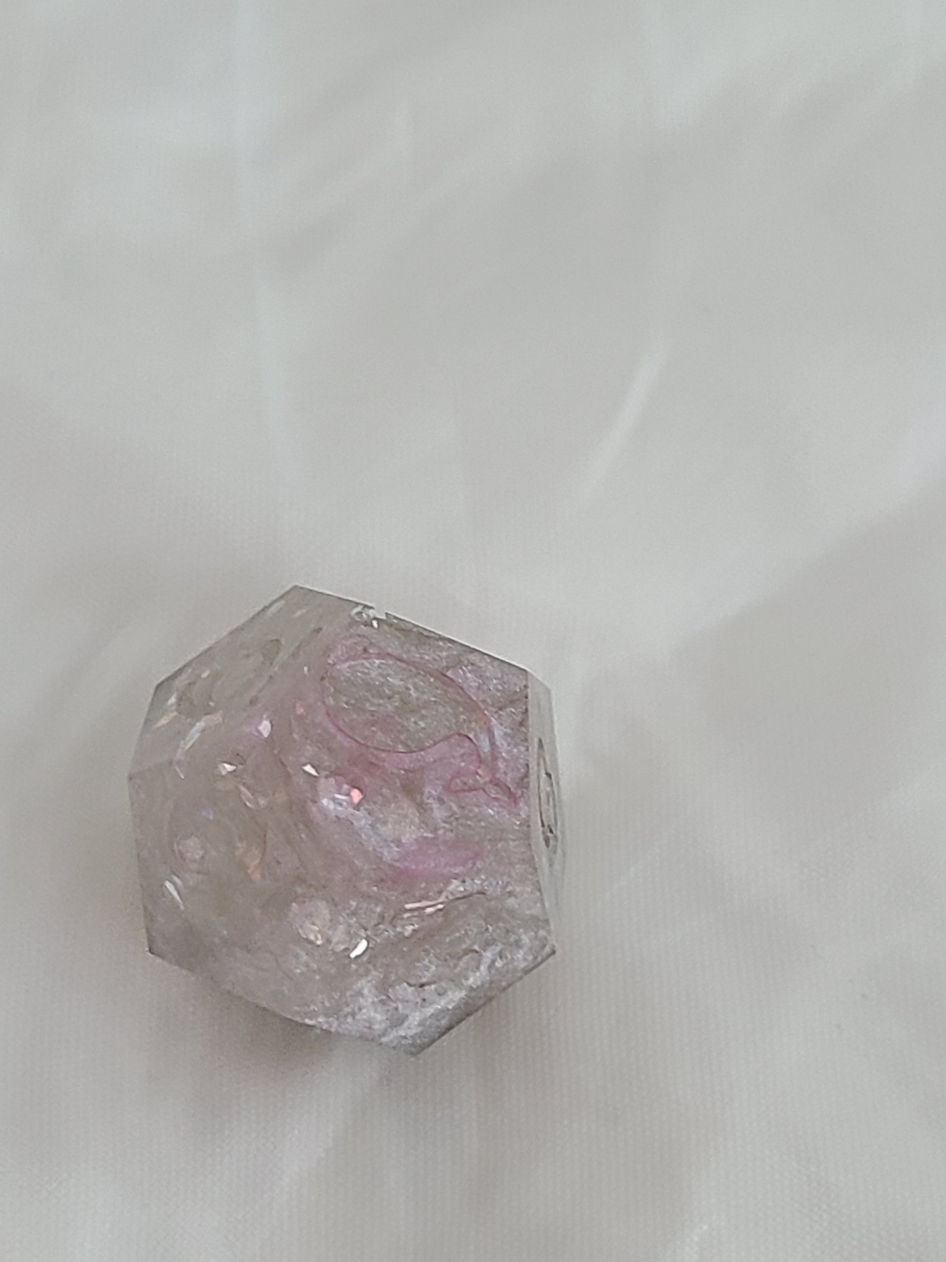 This set has a crystal d4 and a d2 coin. My logo is on all the high faces.