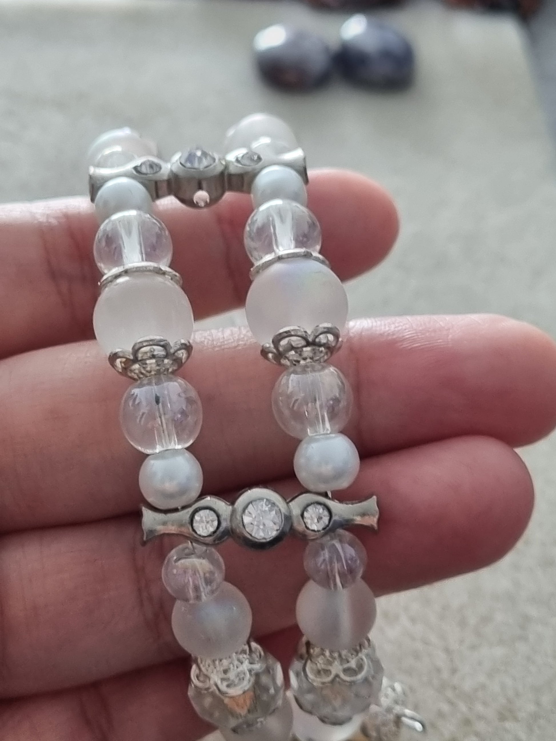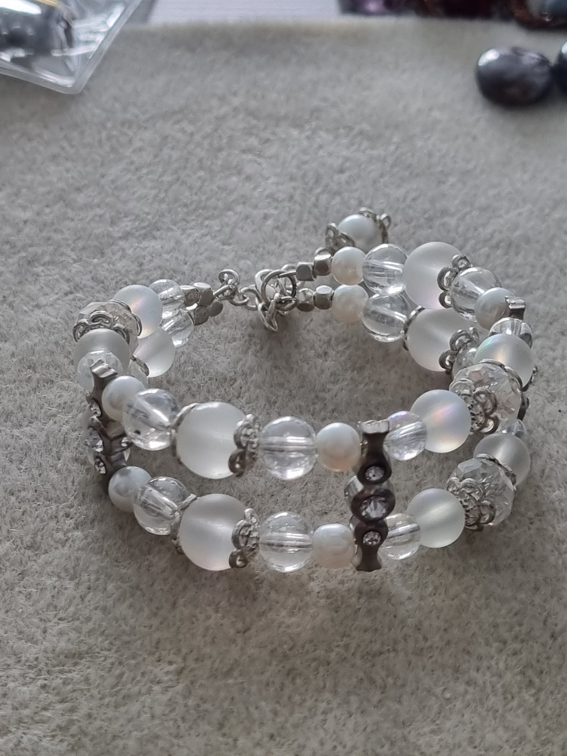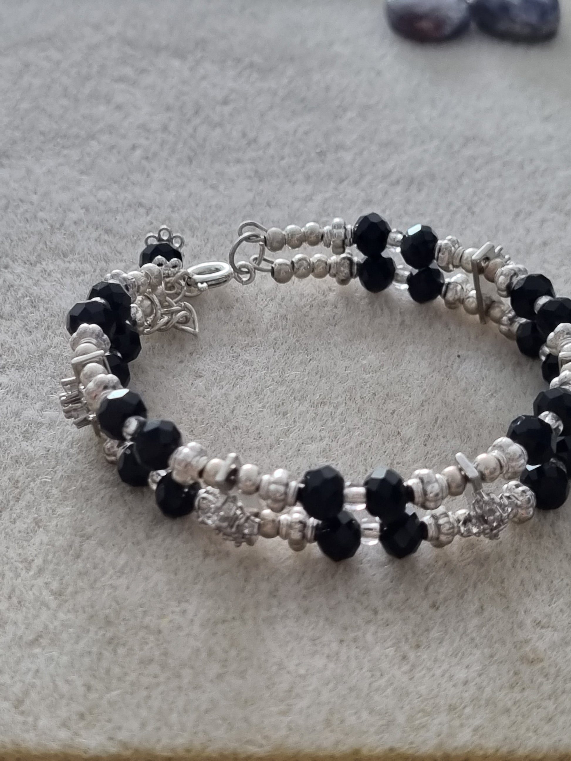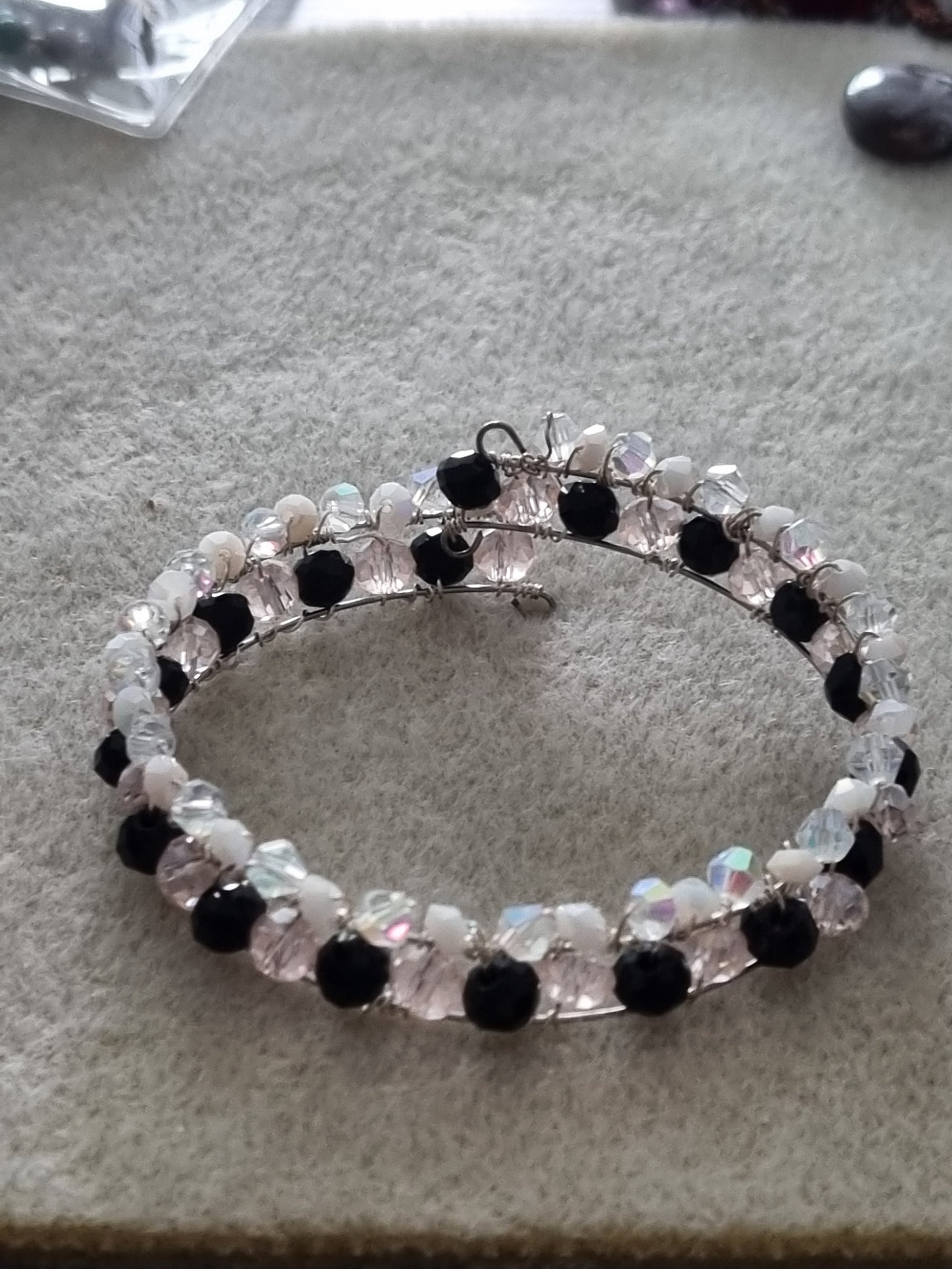 Done with glass beads and memory wire. It keeps it's shape. Some have extender chains and closures to make sure it can't be lost.