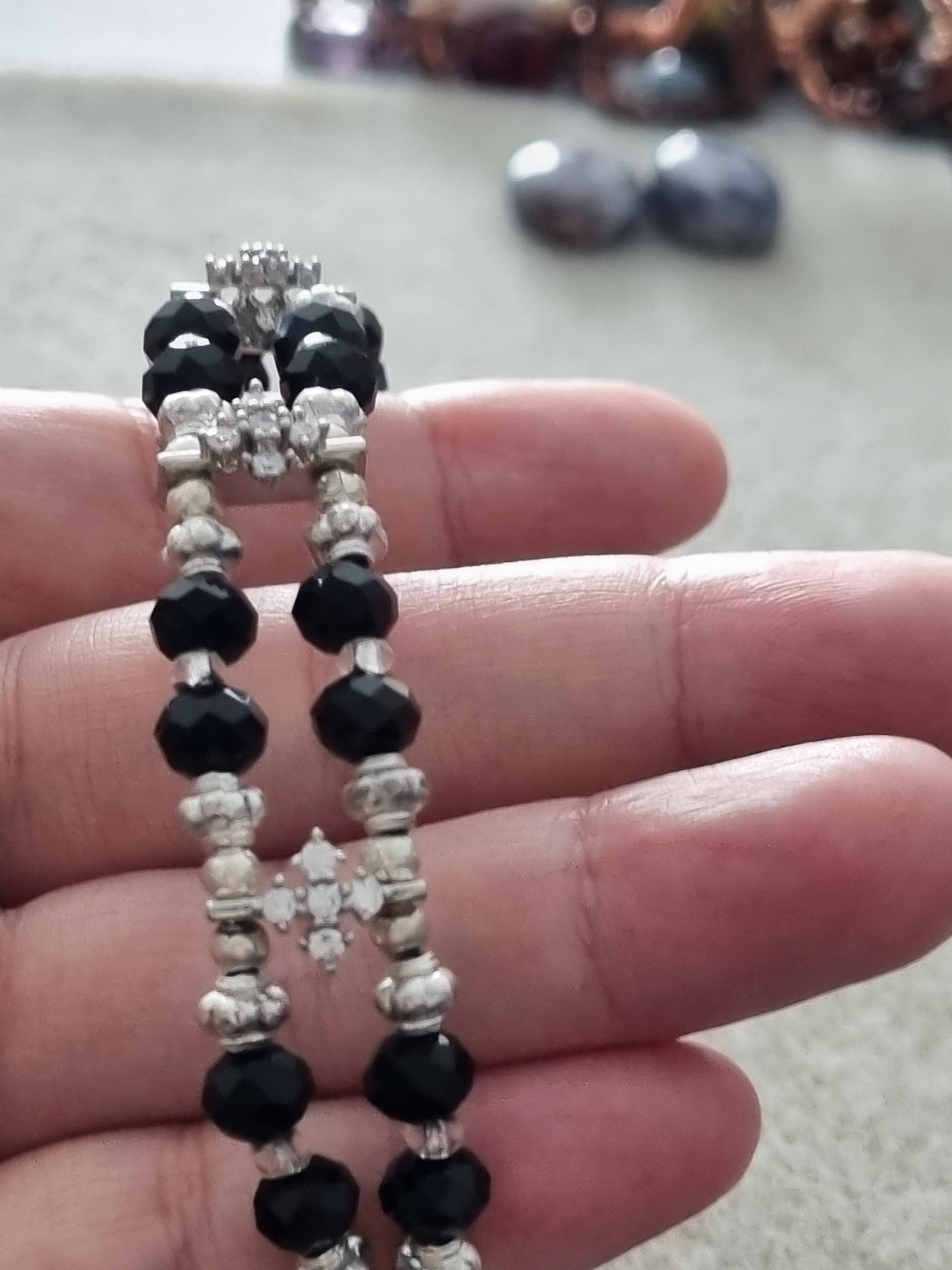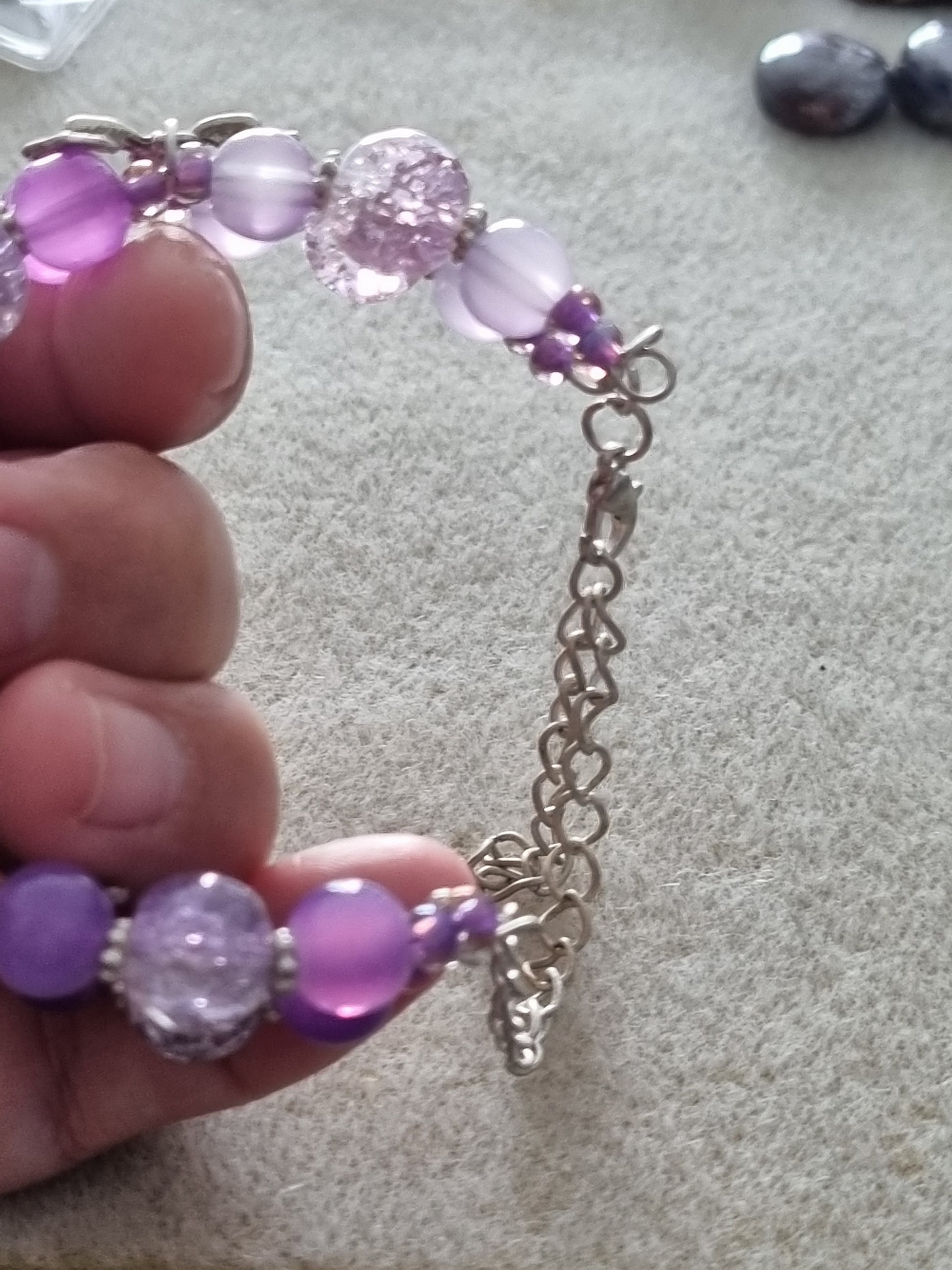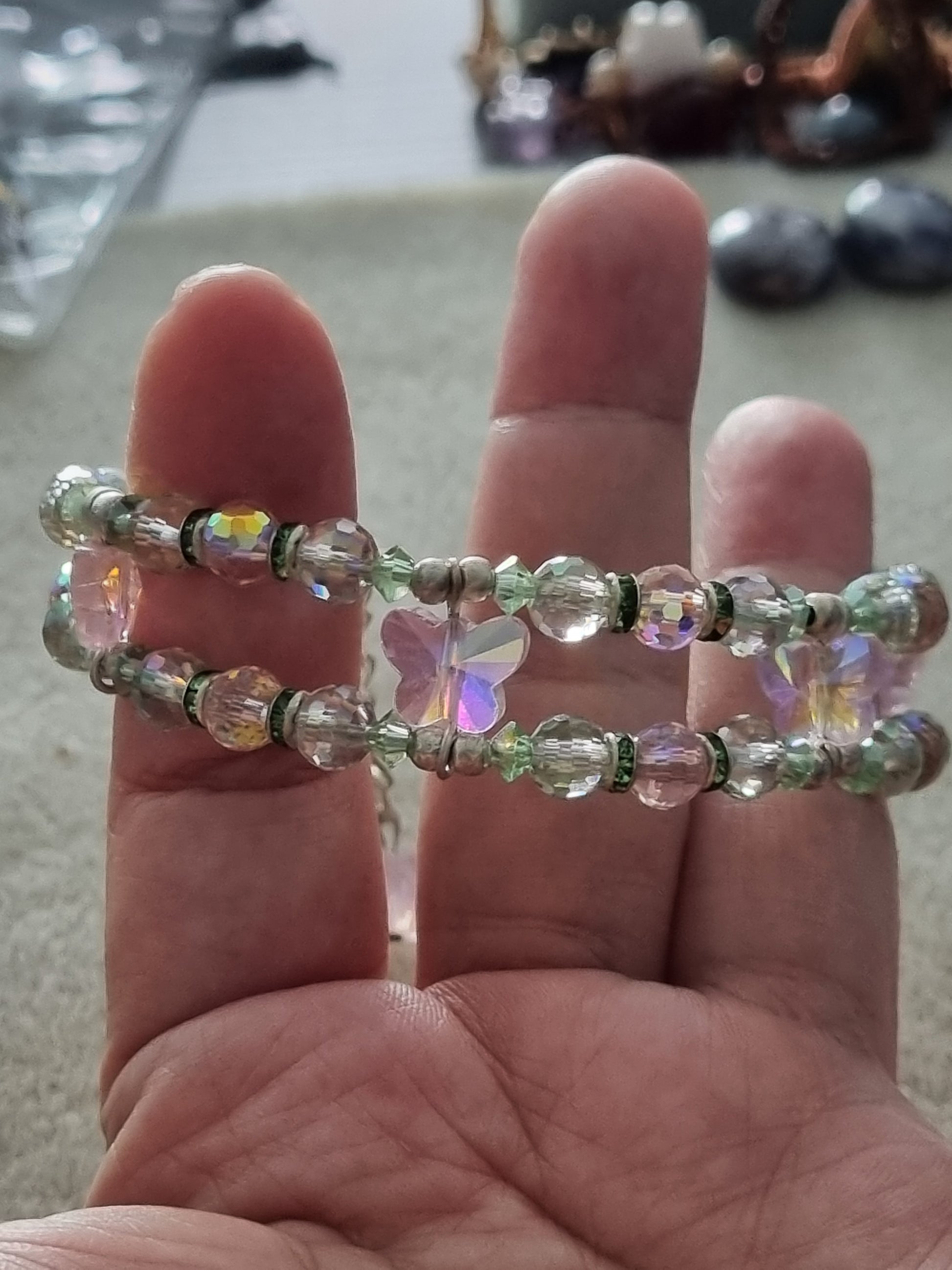 Done with glass beads and memory wire. It keeps it's shape. Some have extender chains and closures to make sure it can't be lost.