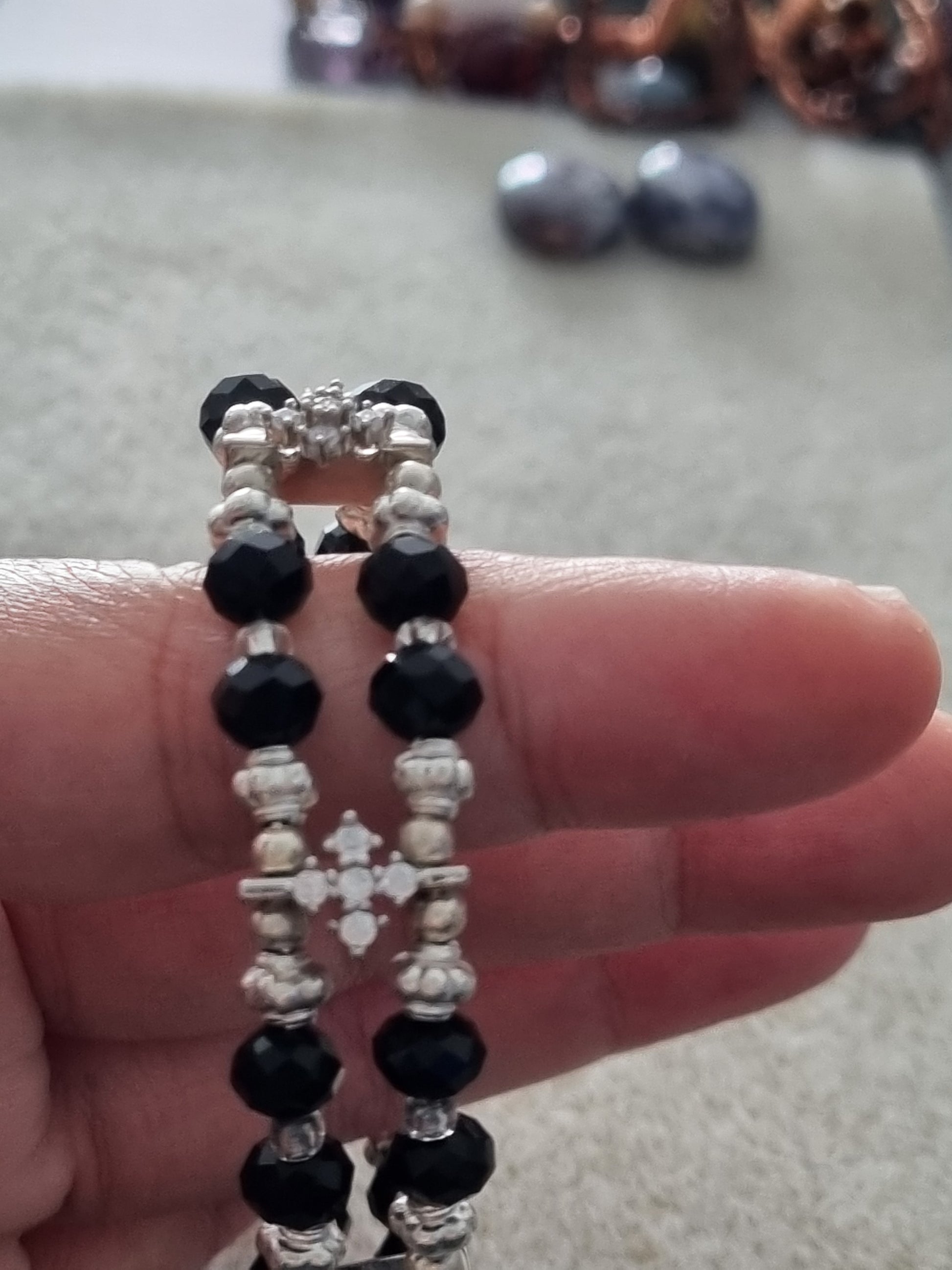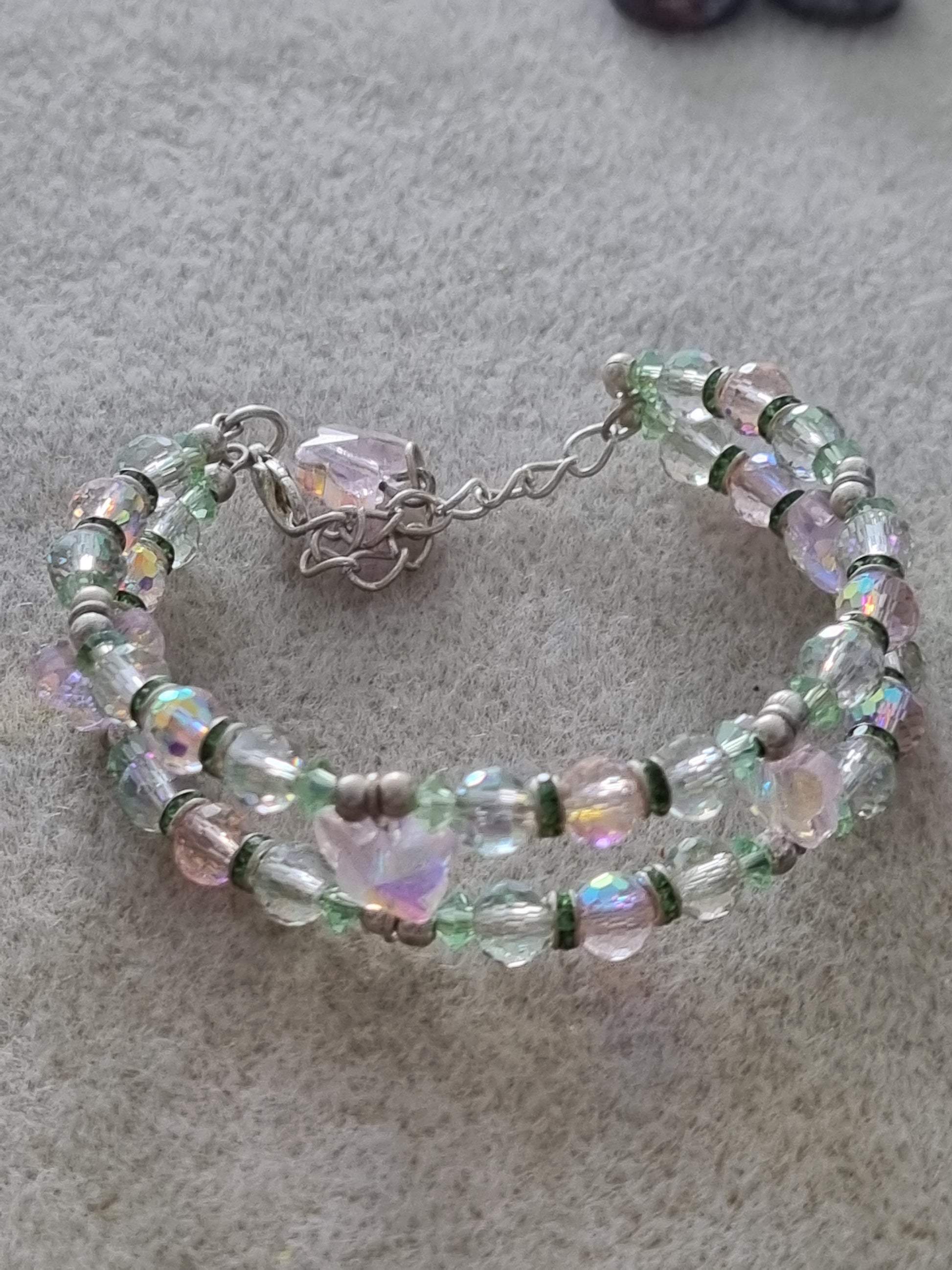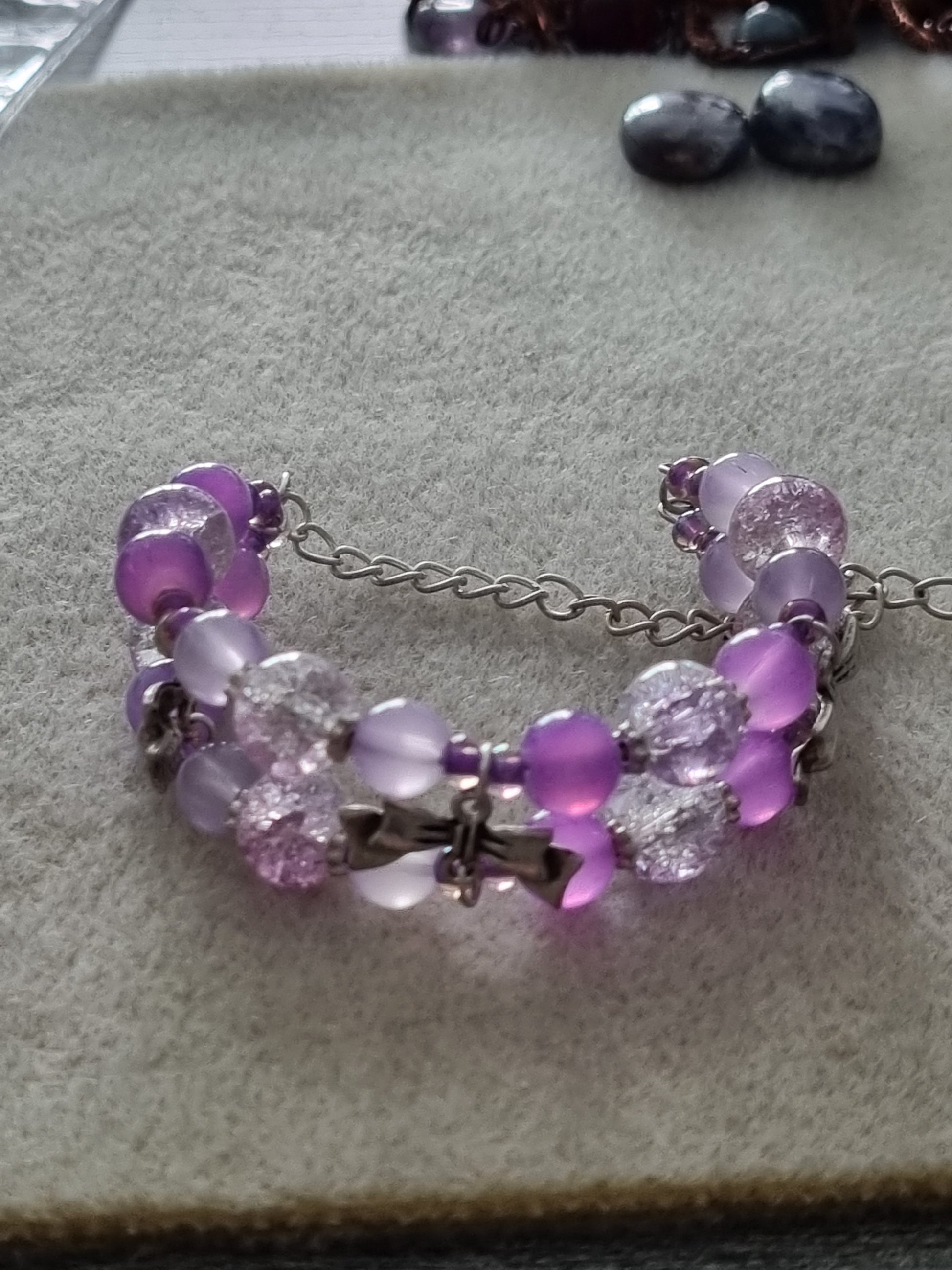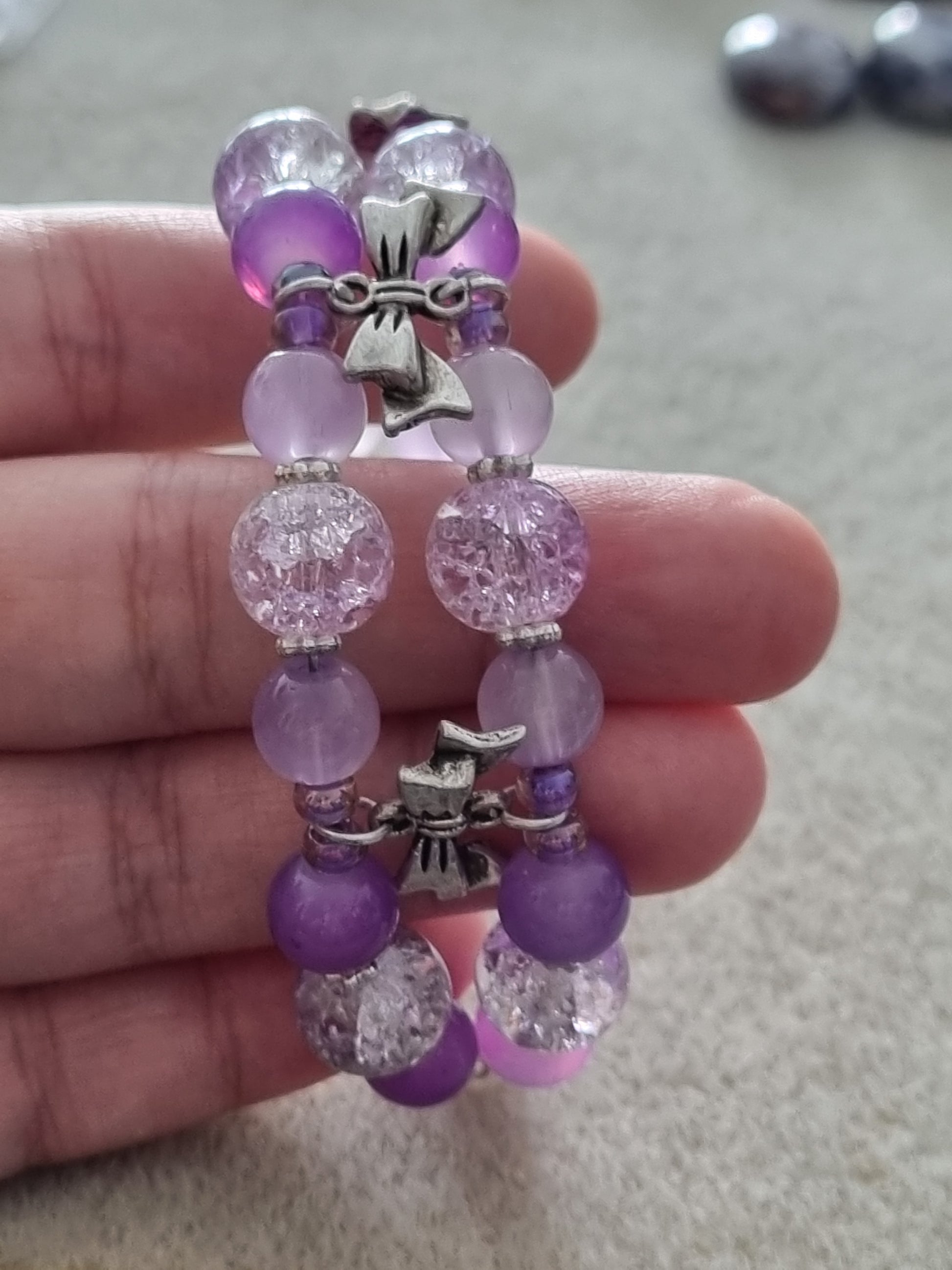 Done with glass beads and memory wire. It keeps it's shape. Some have extender chains and closures to make sure it can't be lost.