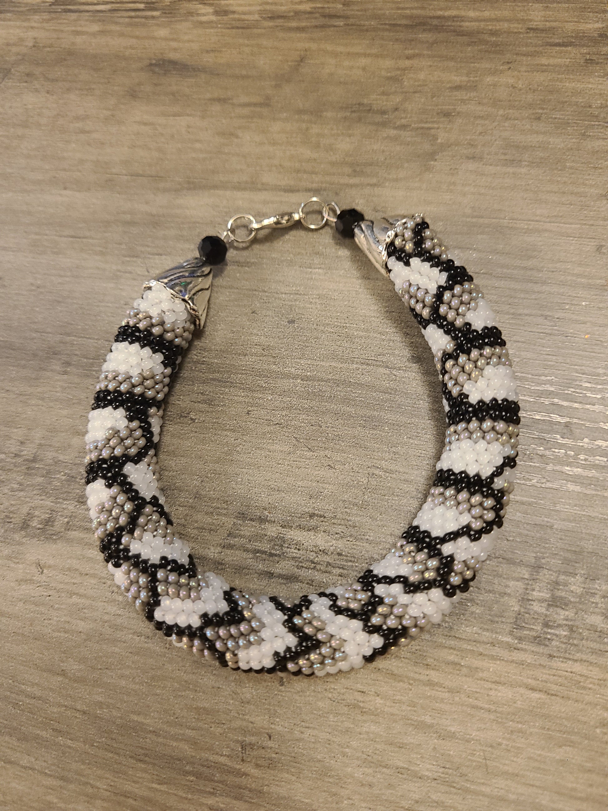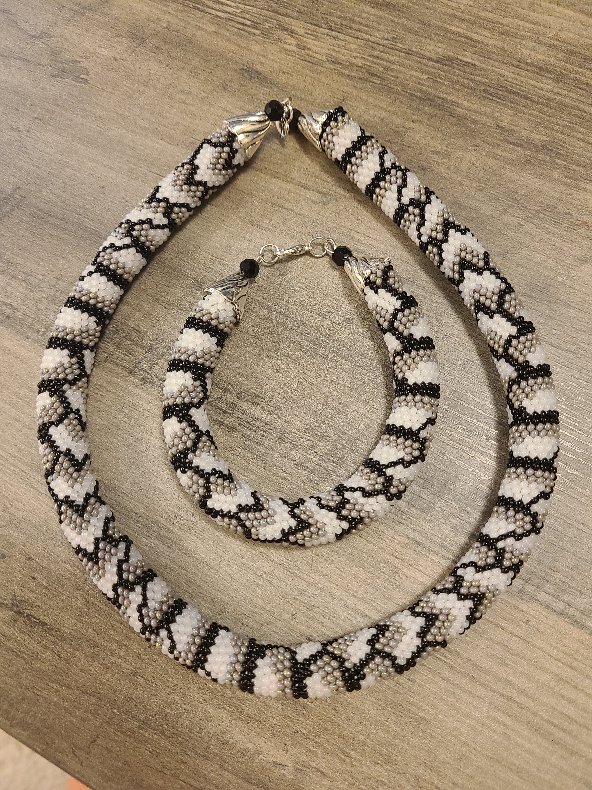 This set is a beaded crochet design by Crazyyy Academy. The design is done with seed beads. It's soft and flexible.