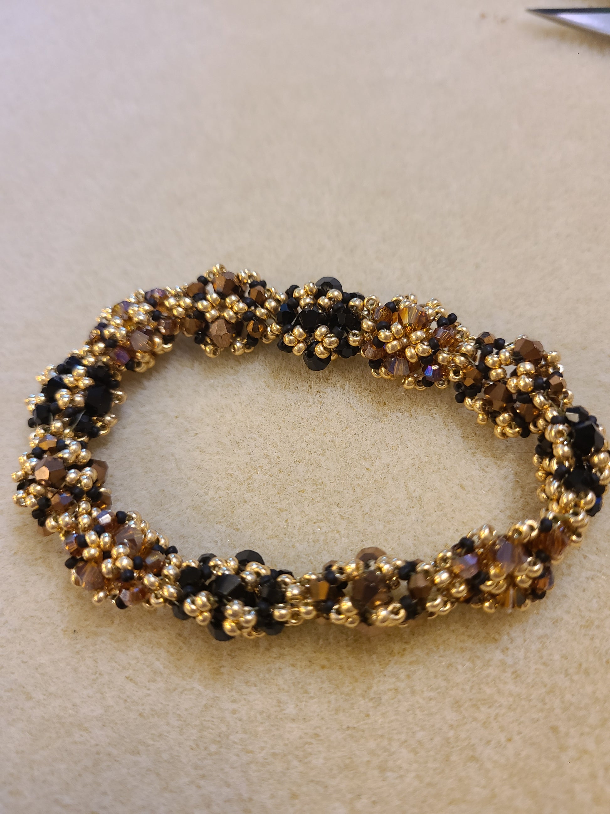 This is hand-beaded with seed beads and crystals. It's a bangle and does not have much stretch, so it's for smaller hands/wrists