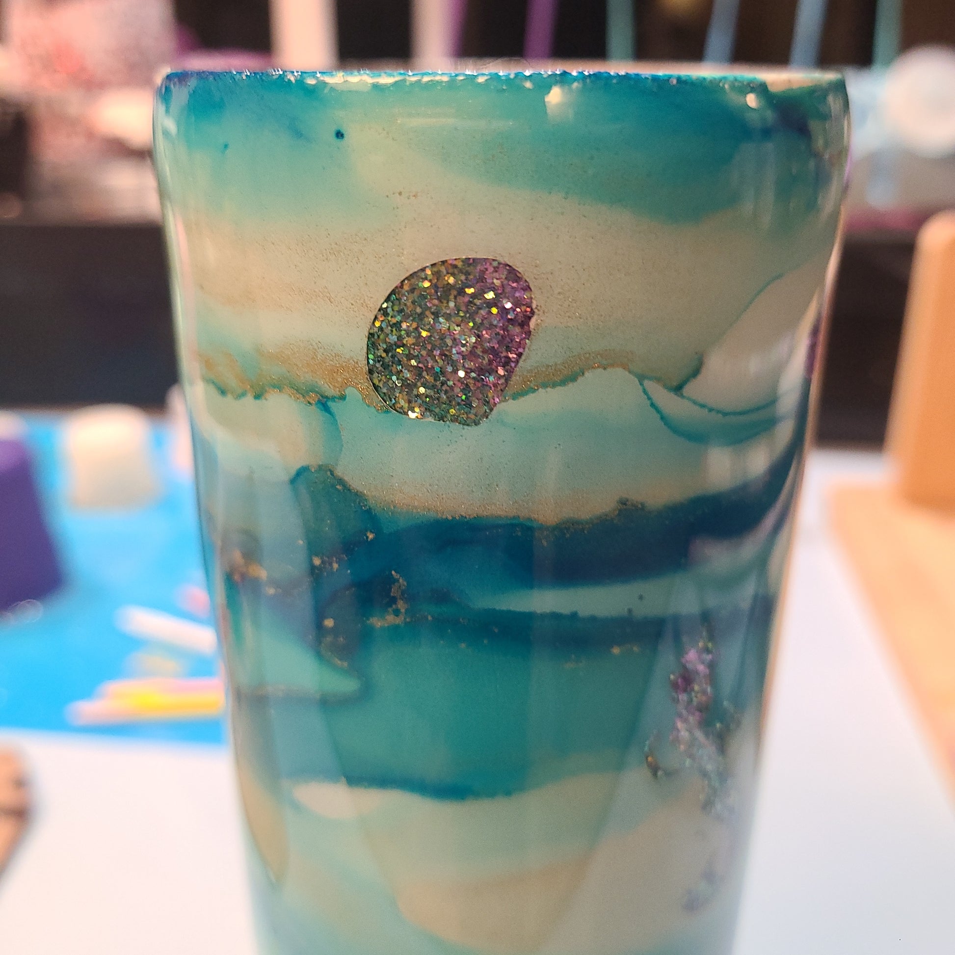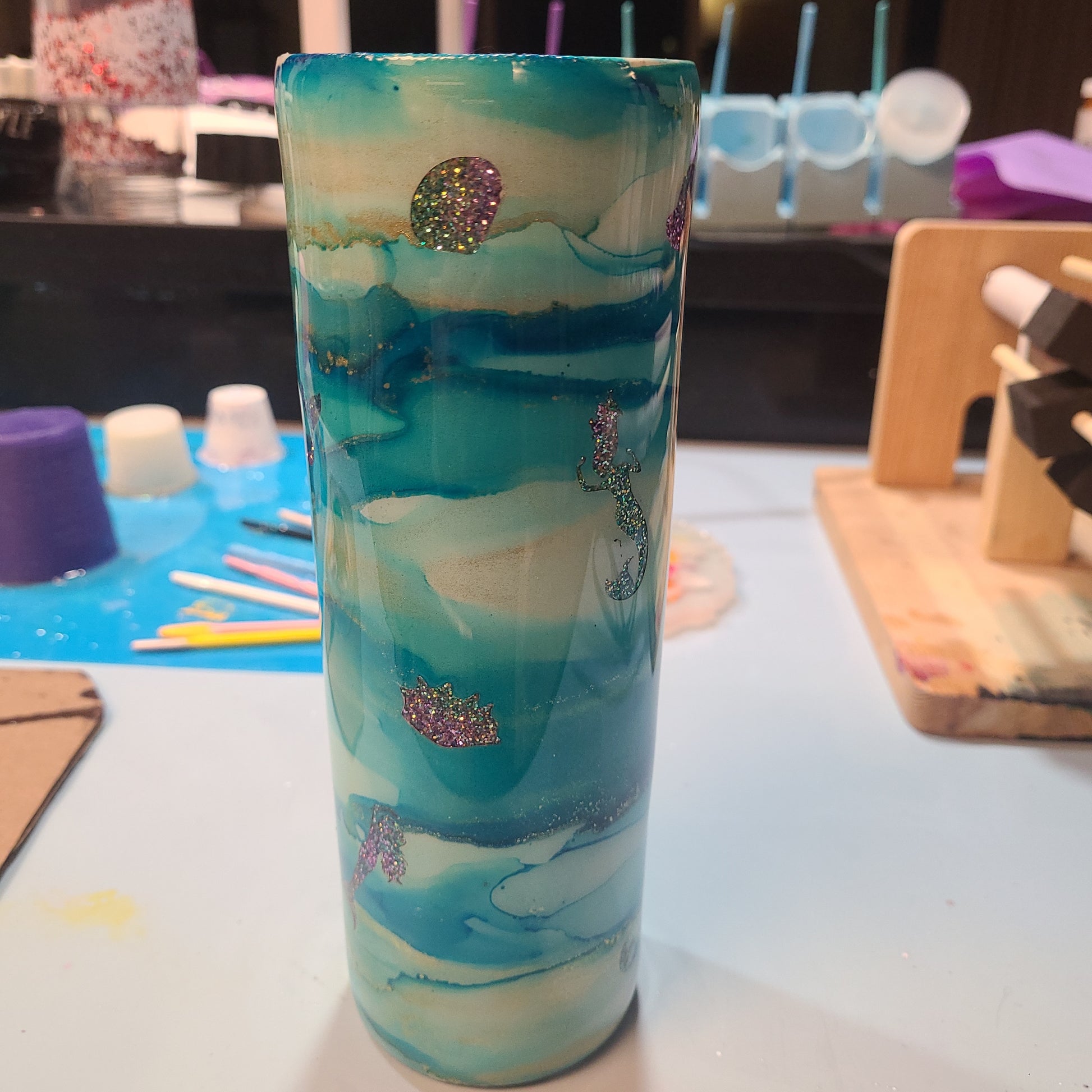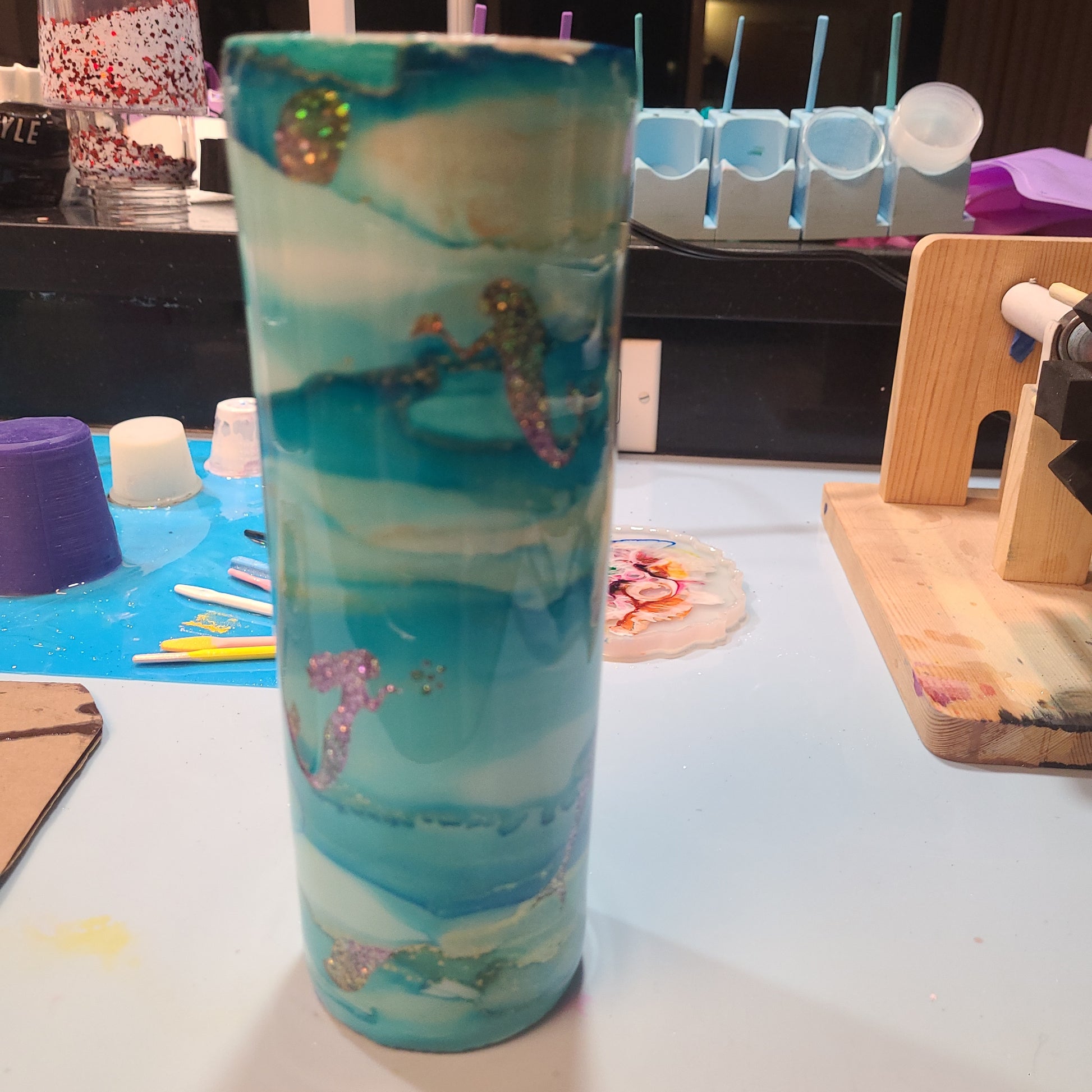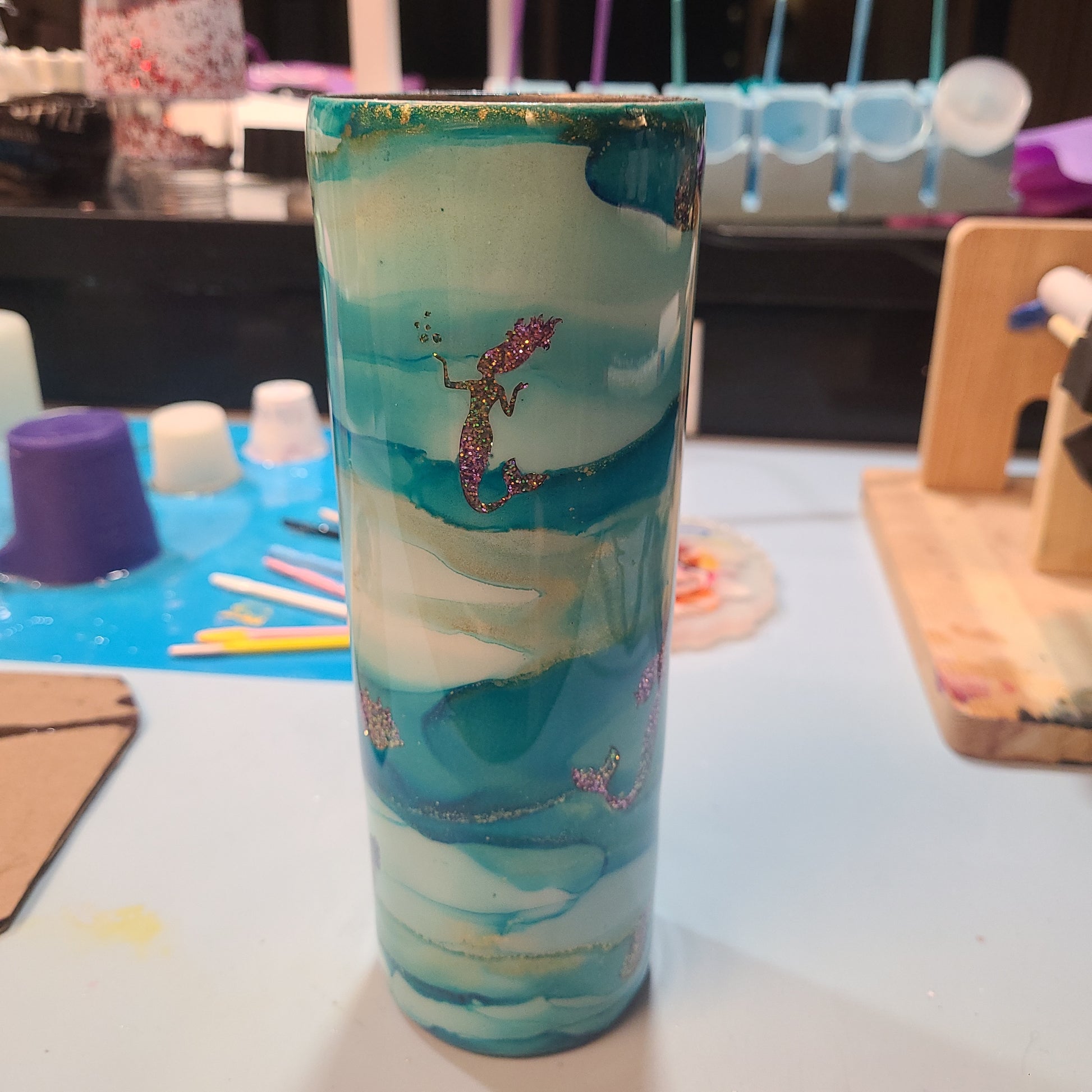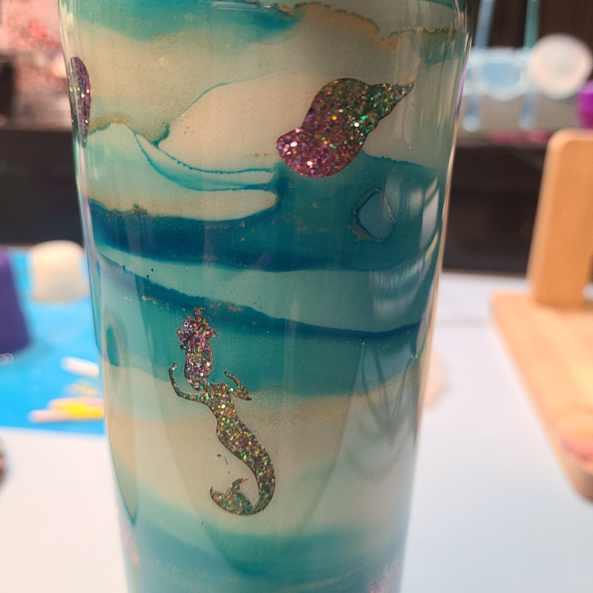 20oz slight tapered tumbler. Was a purple blue green and gold glittered cup with peekaboo mermaids and a watercolor done over it to seem like the mermaids are in water!