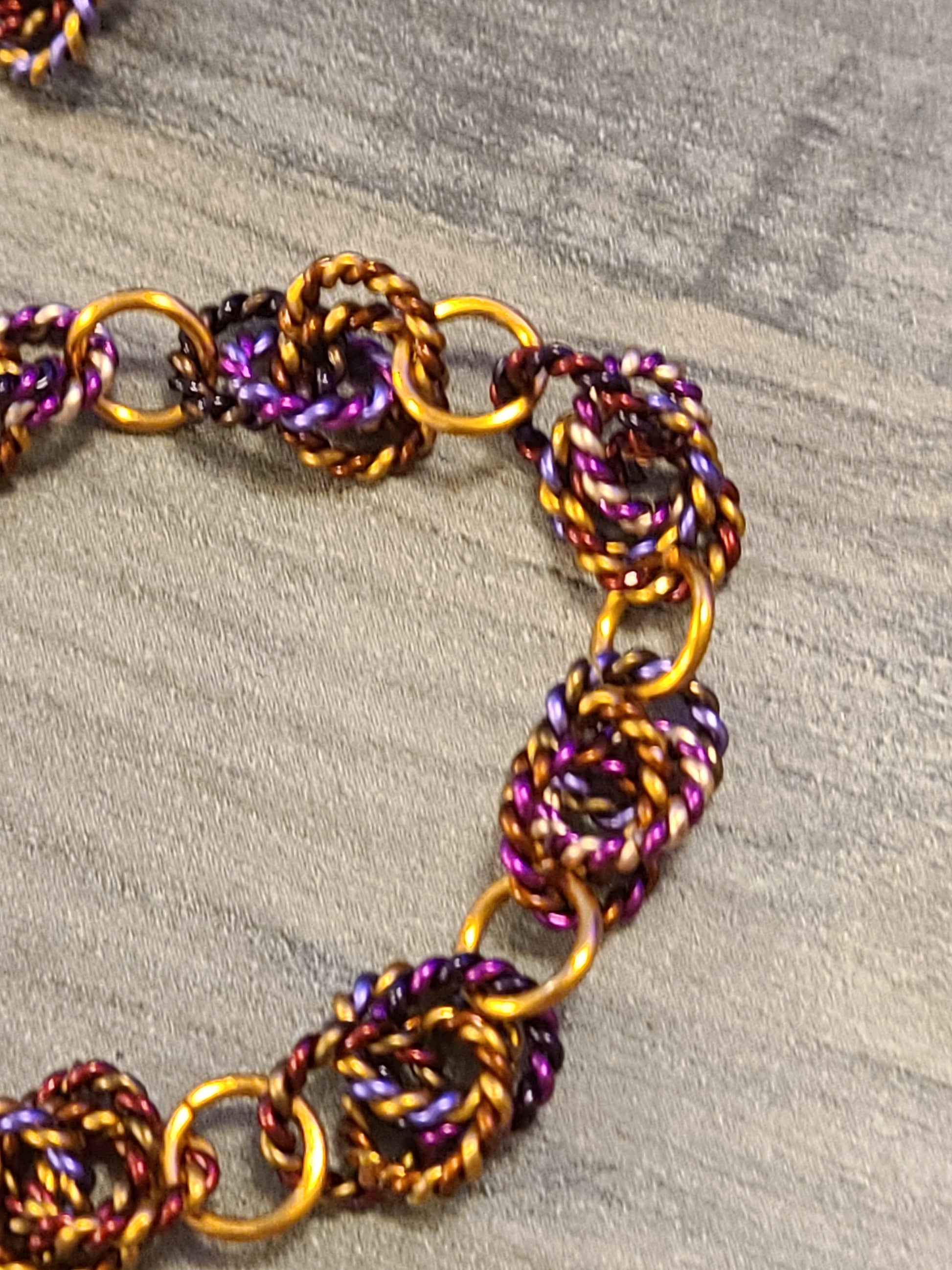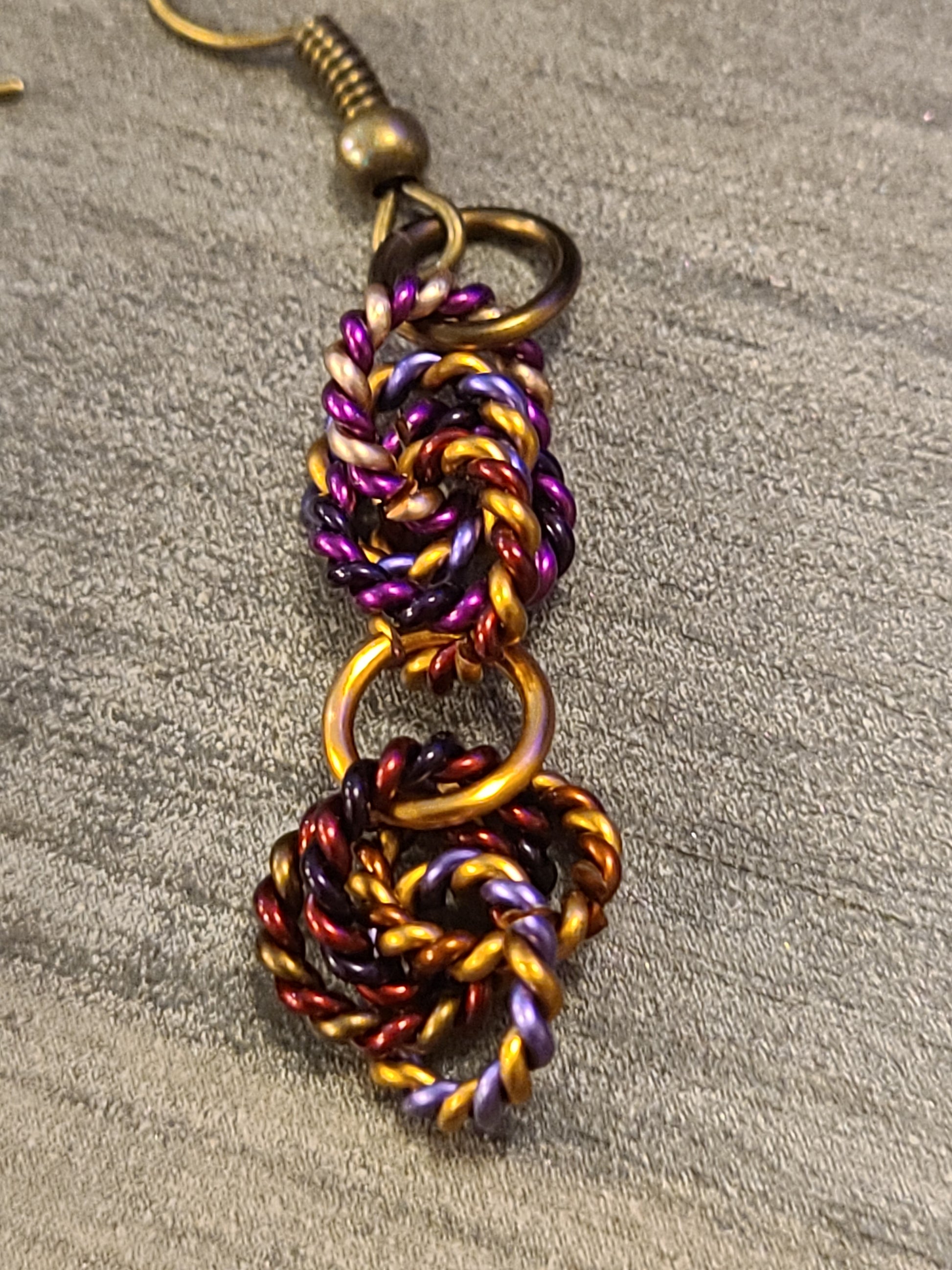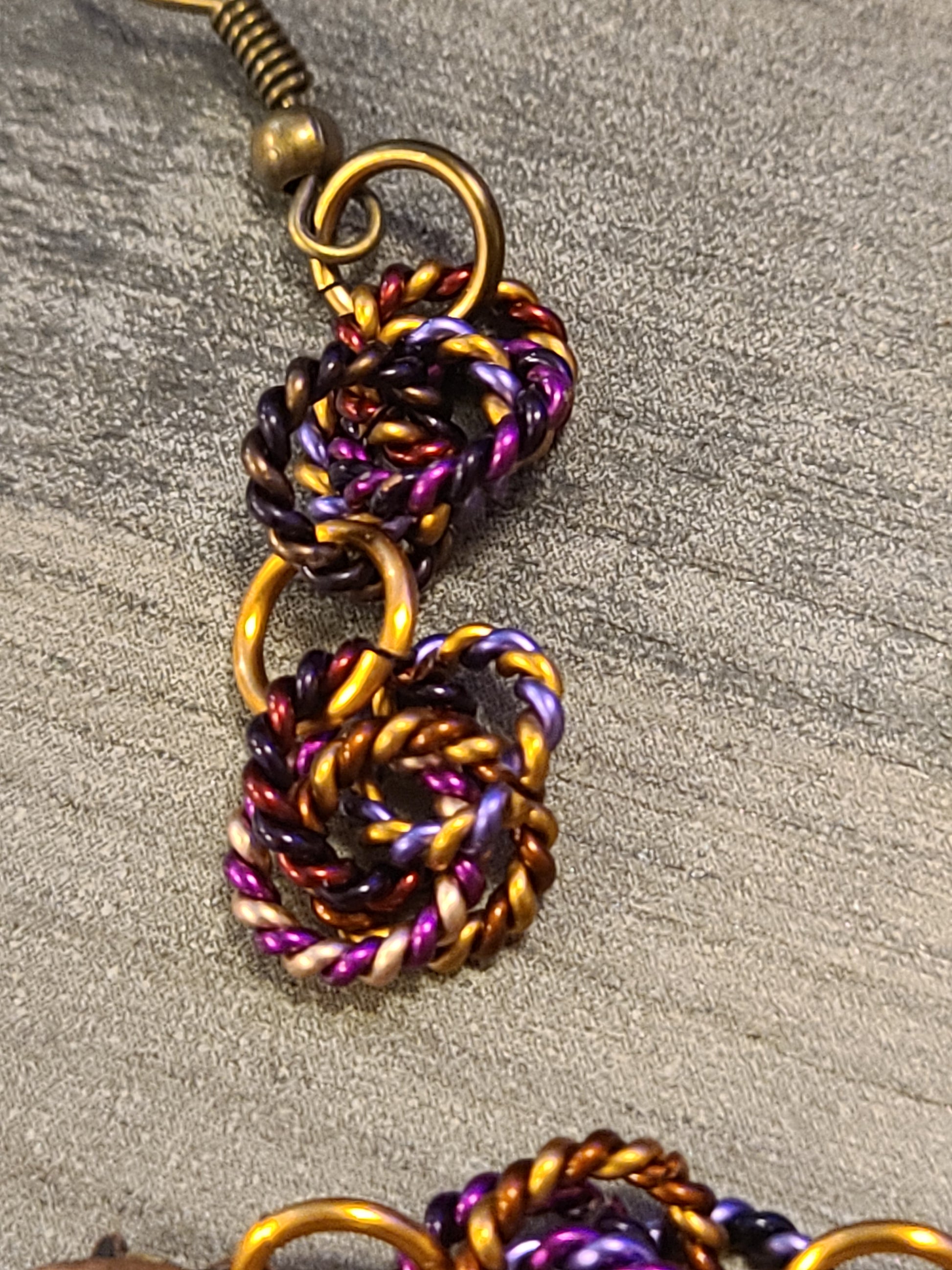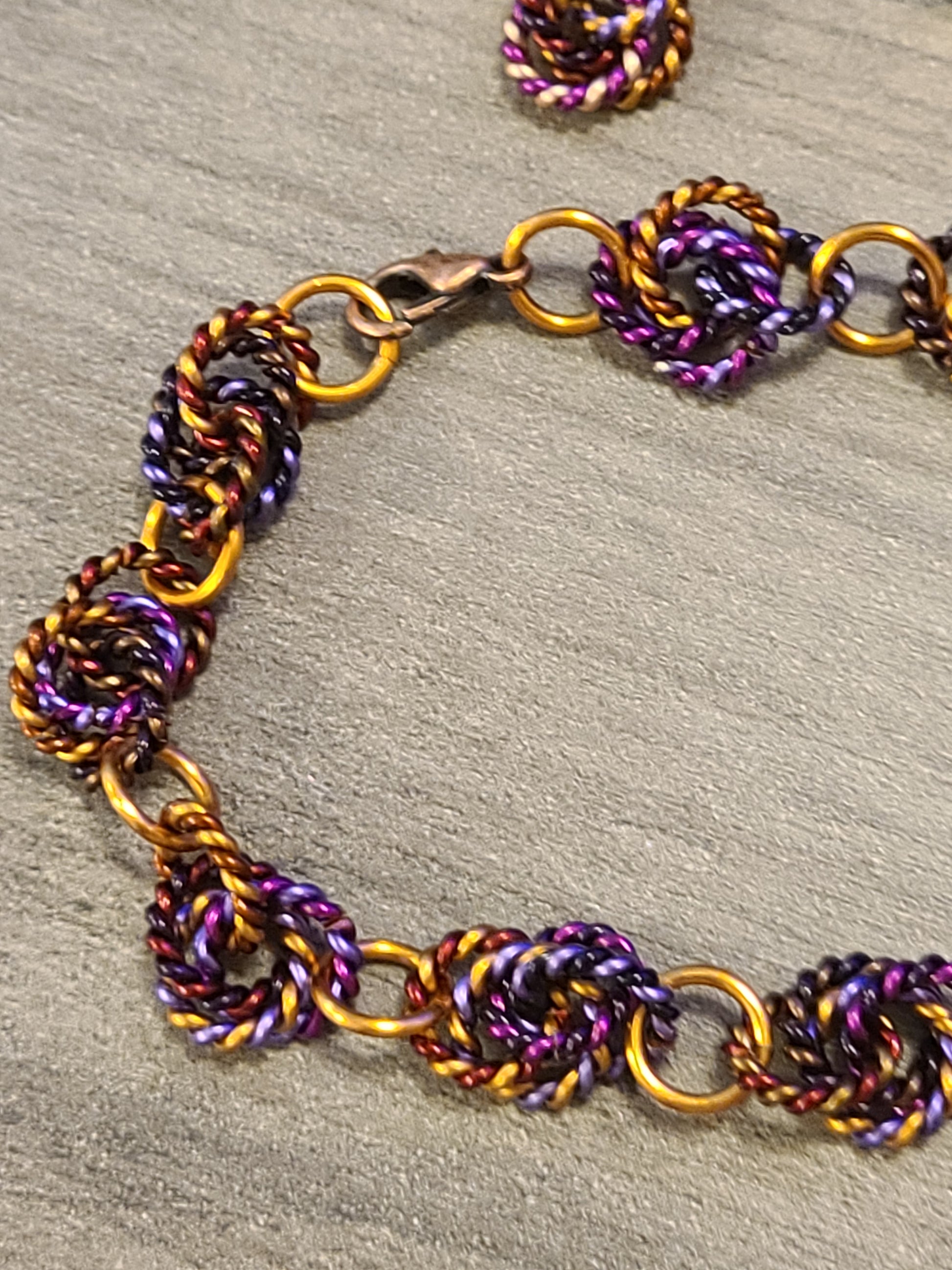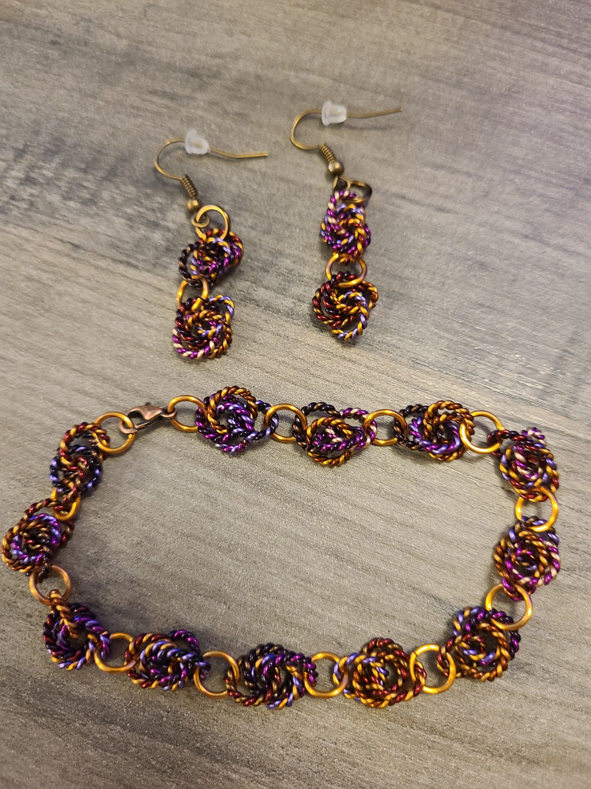 These mobii are made of intertwined wire of multiple colors and chained together with additional jumprings. This set comes with earrings and a bracelet.