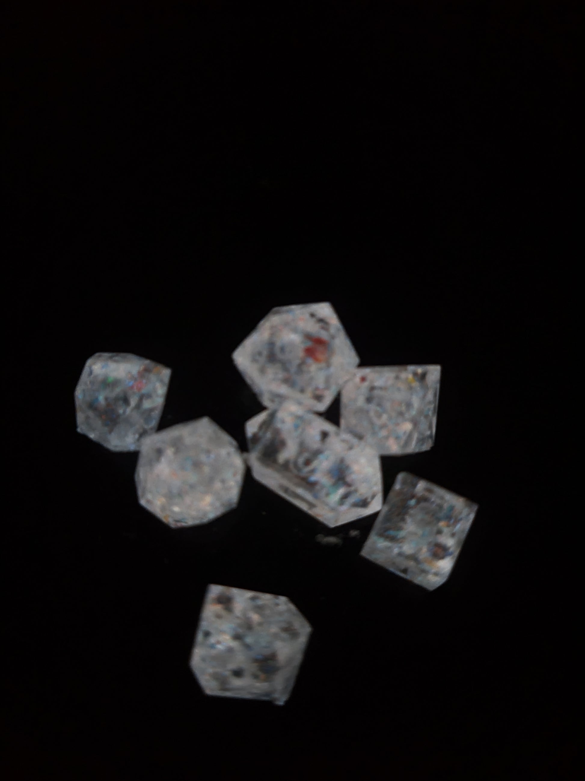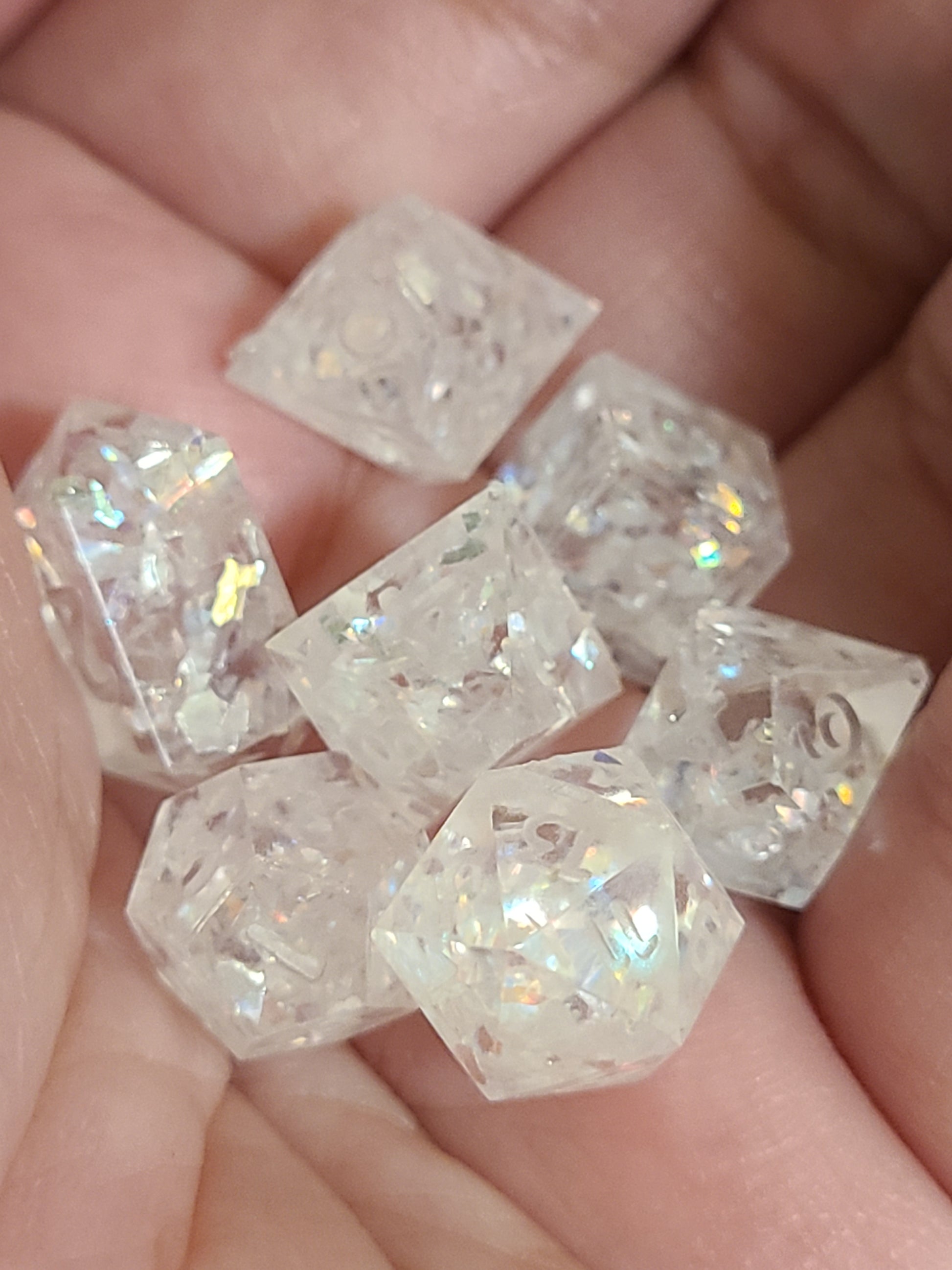 These dice are made with glow in the dark flakes and they are just the most adorable shiny things you've ever seen. They have a bright white glow when charged by the sun and then placed in the dark. They are the set of 7 dice - just in mini form.