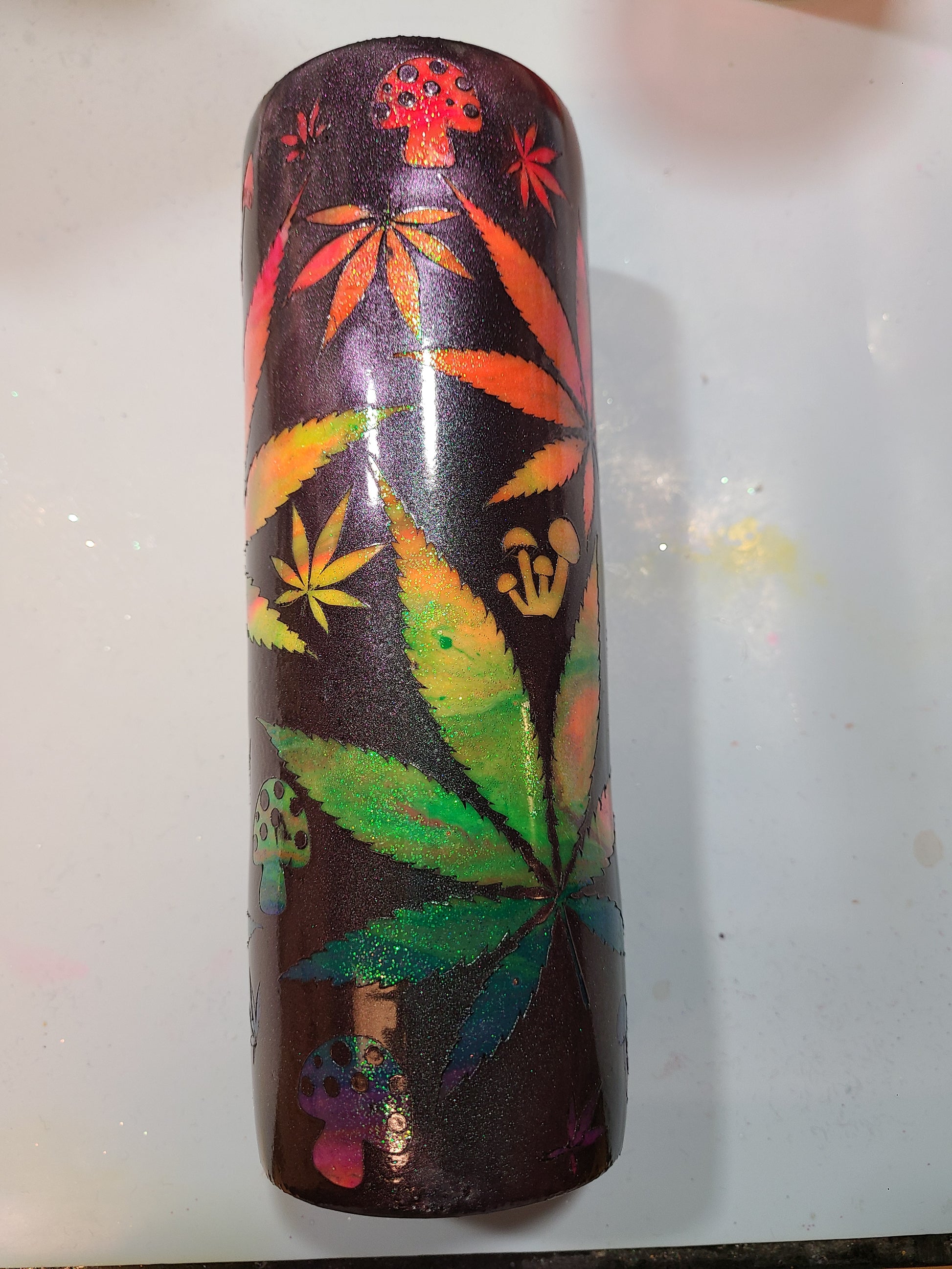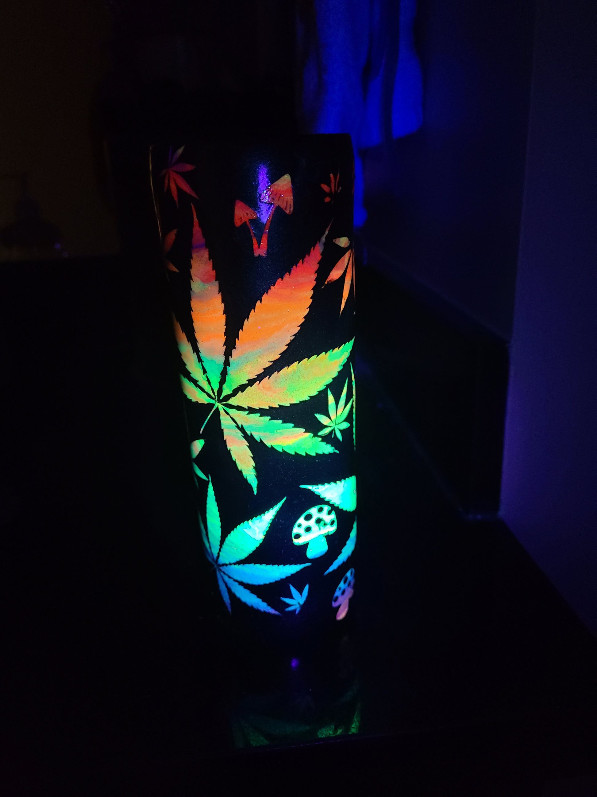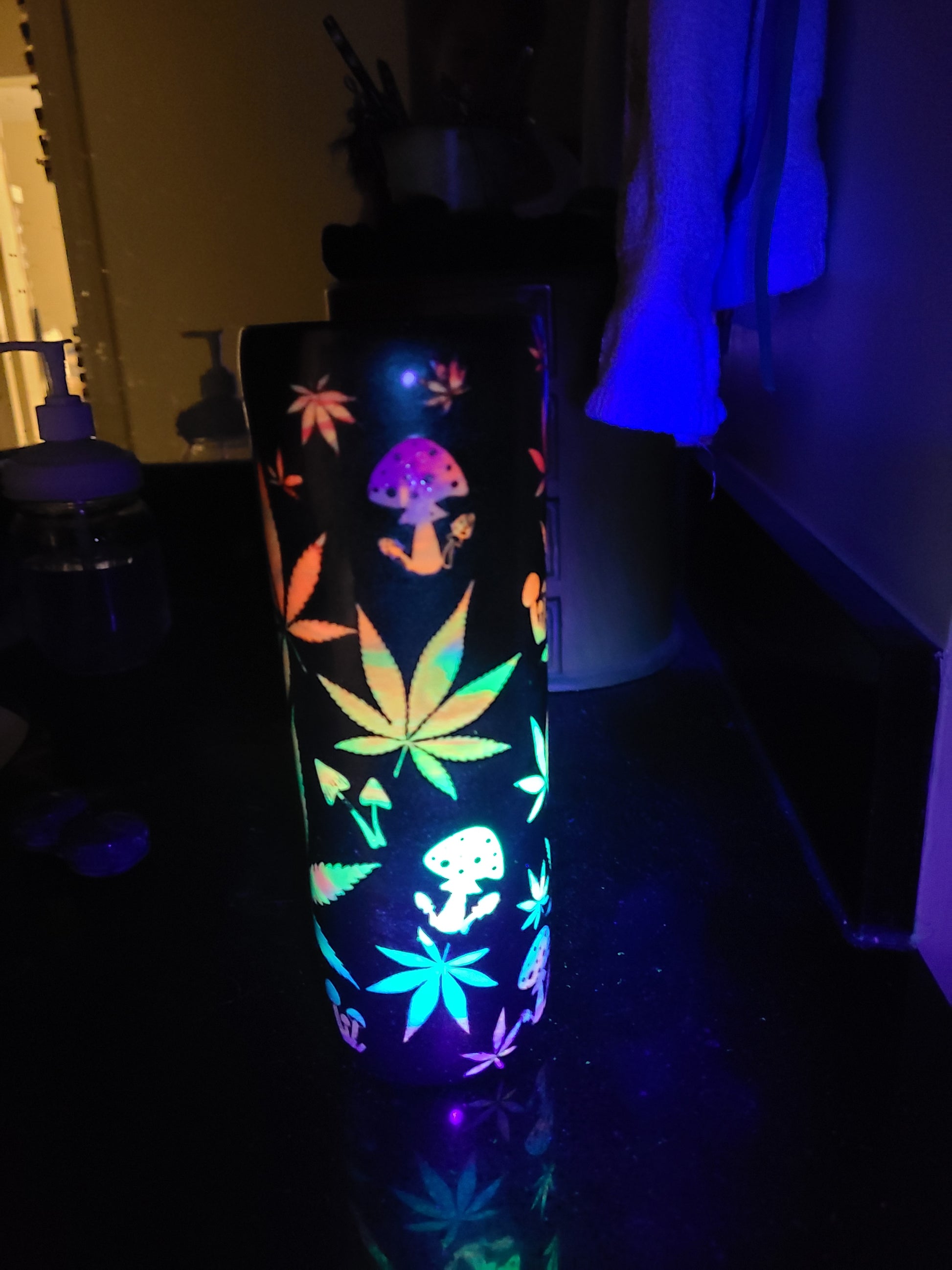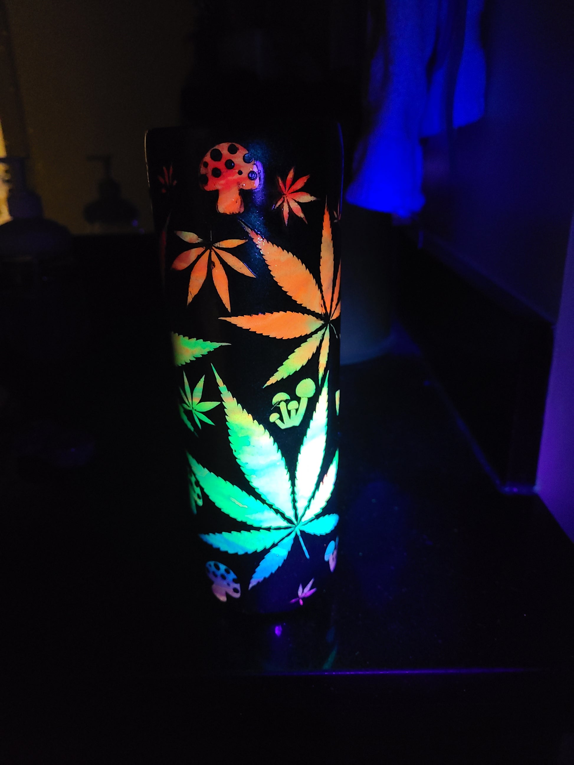 Lights up under blacklight due to the neon pigments. Peekaboo feature marijuana leaves and mushroom for the party vibe. The cup is has a color shifting purple green color.