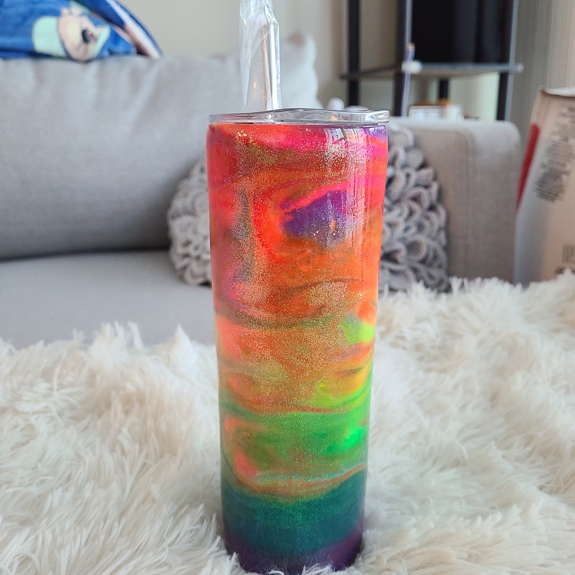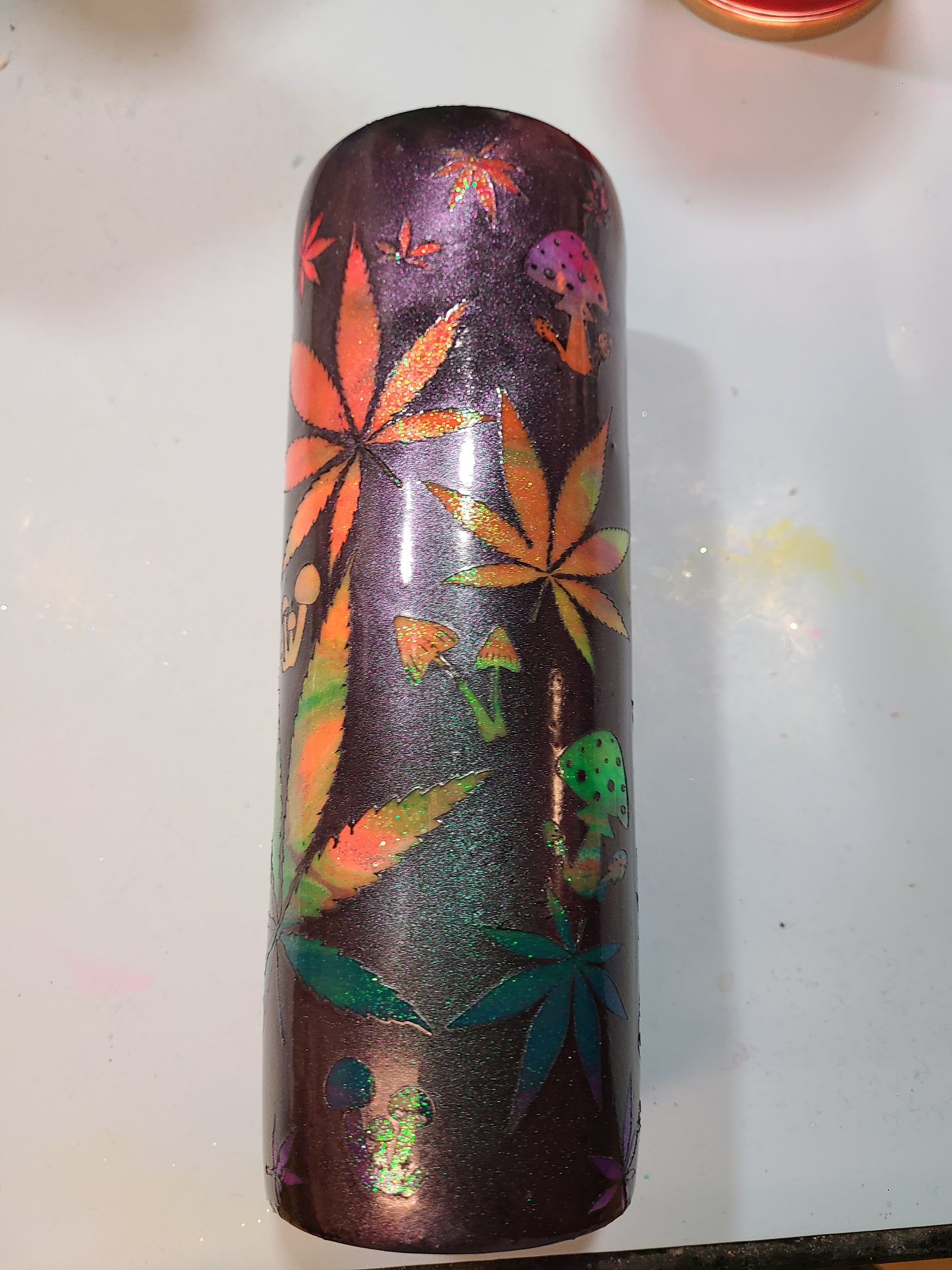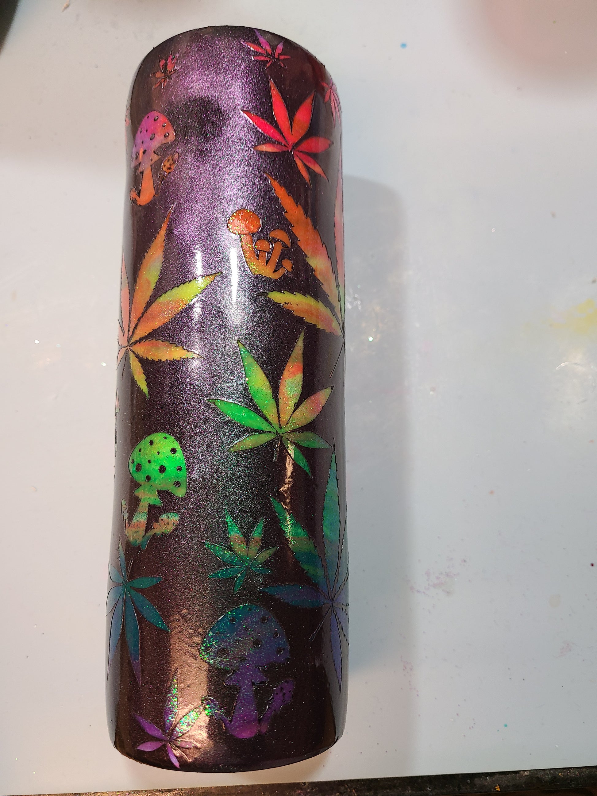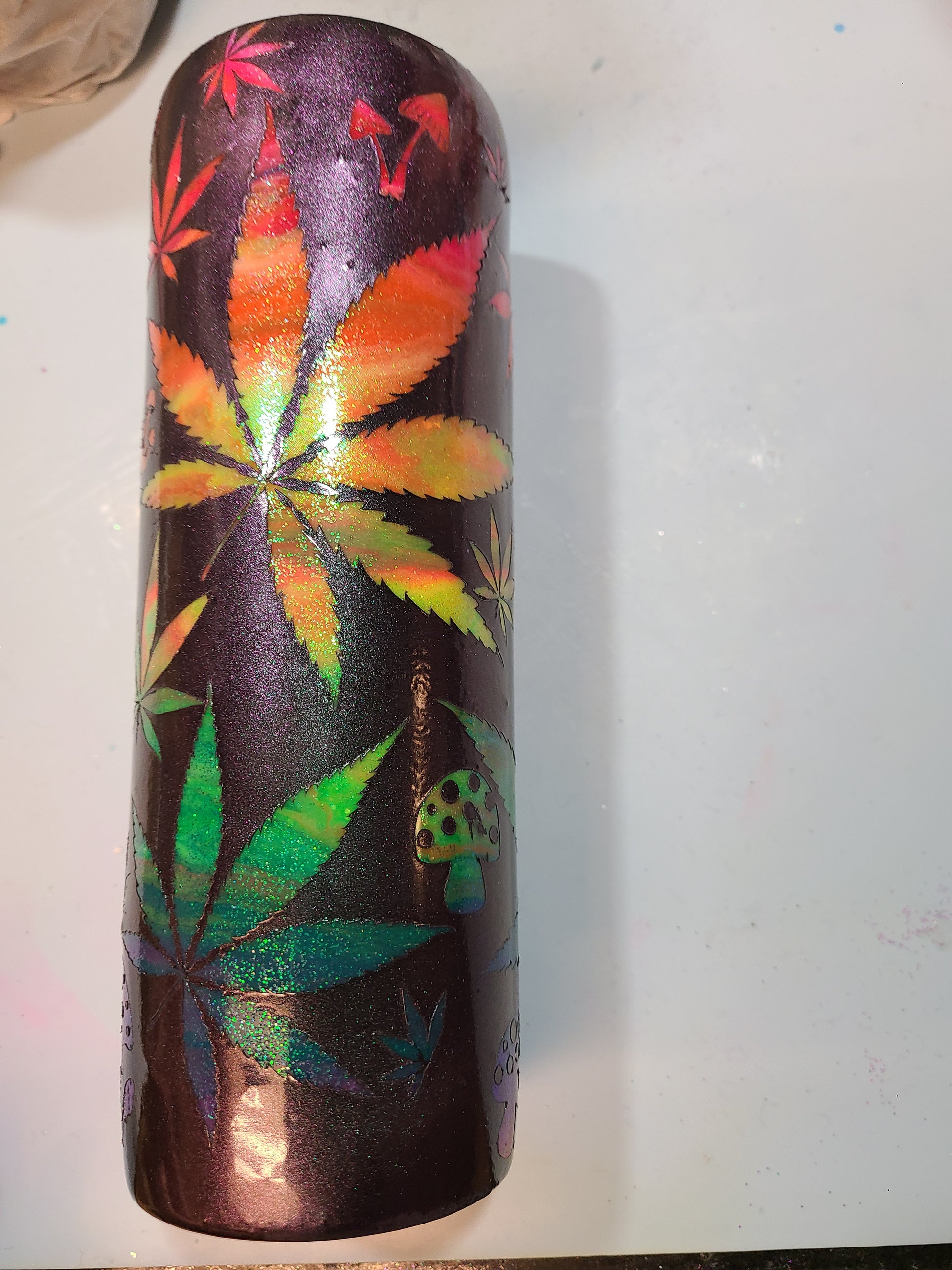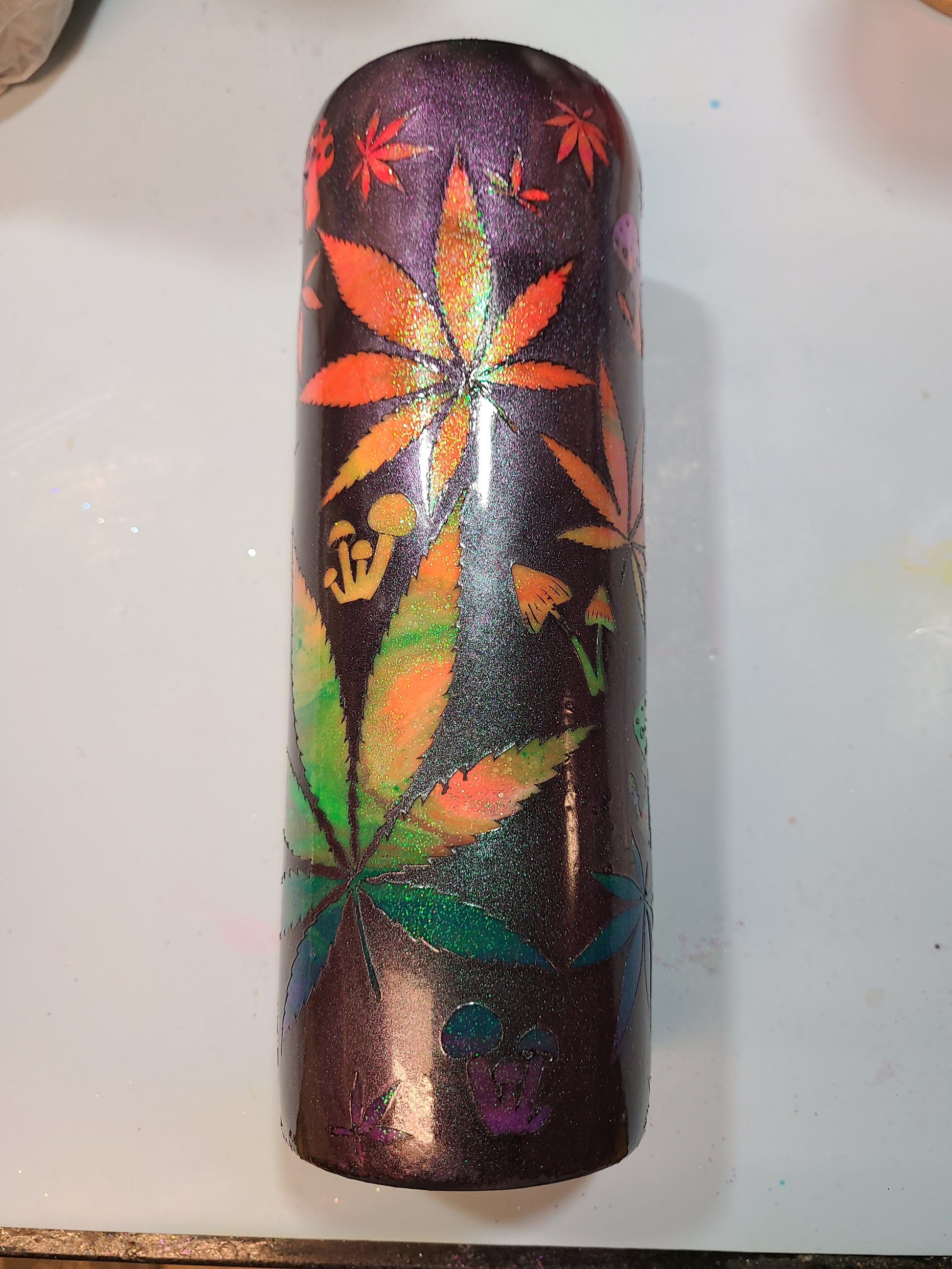 Lights up under blacklight due to the neon pigments. Peekaboo feature marijuana leaves and mushroom for the party vibe. The cup is has a color shifting purple green color.