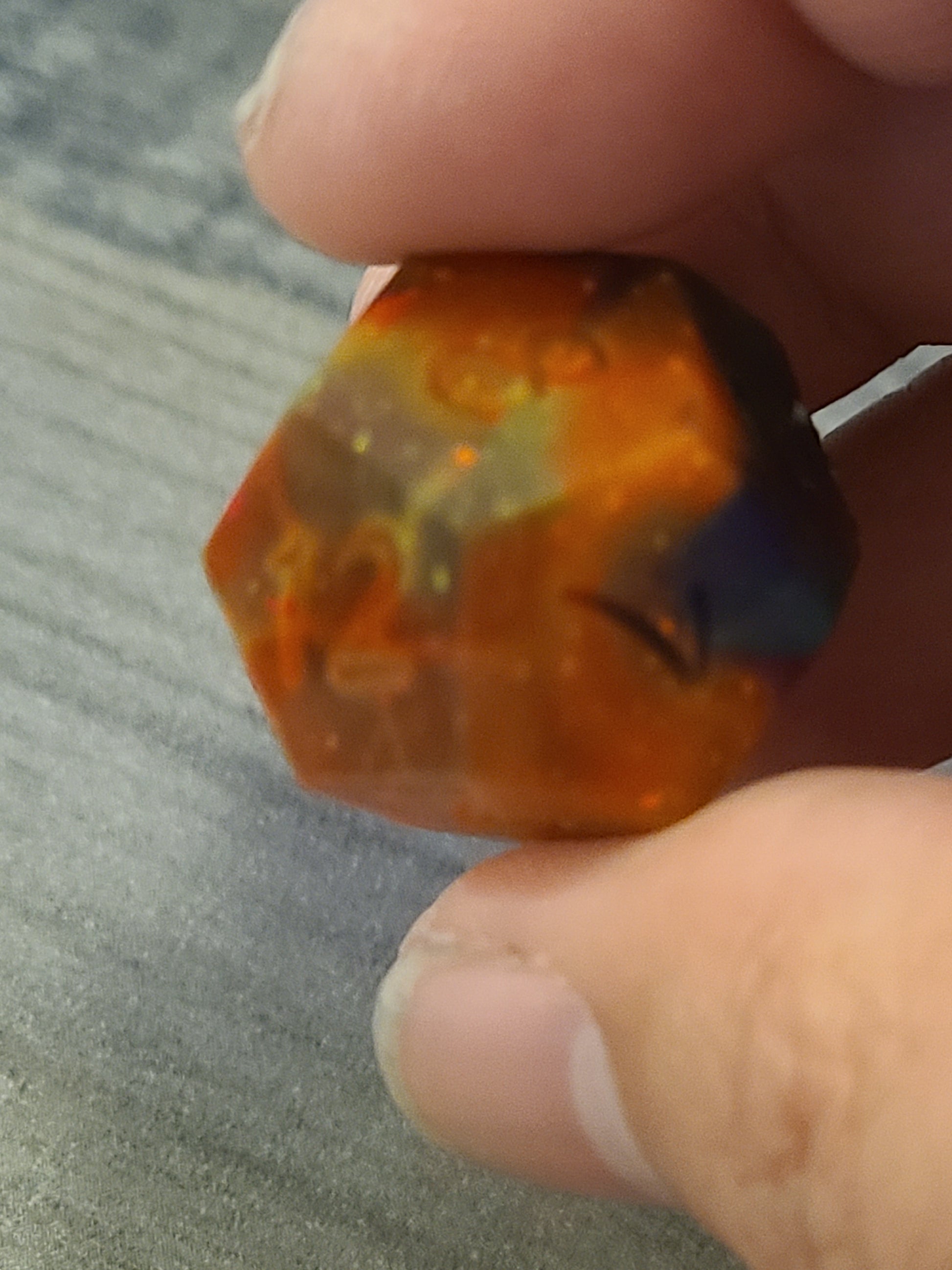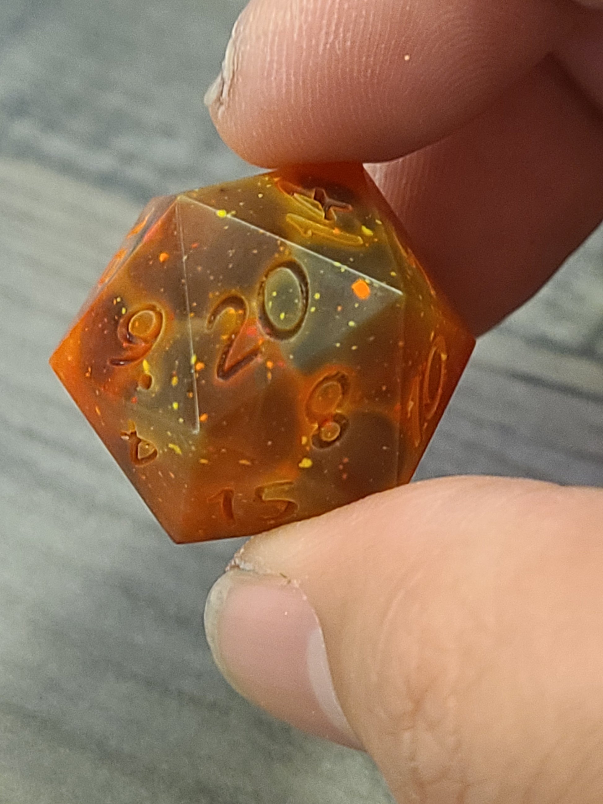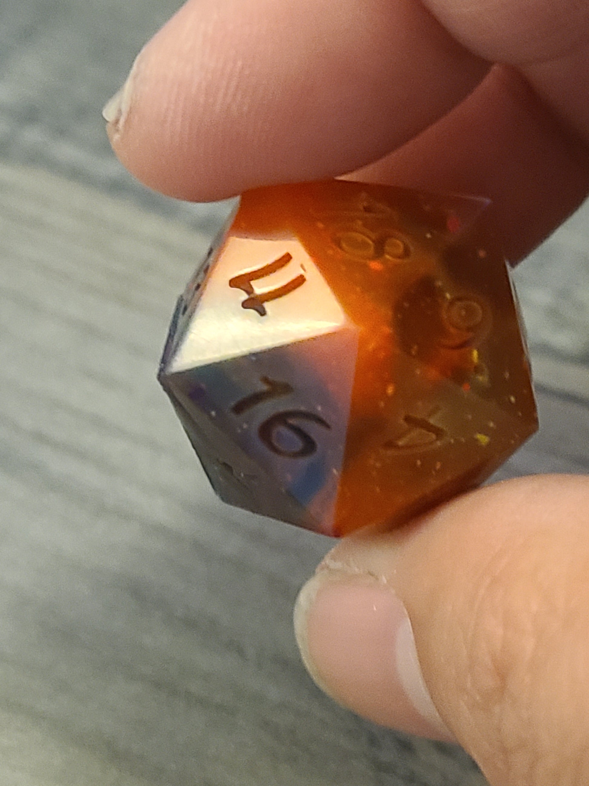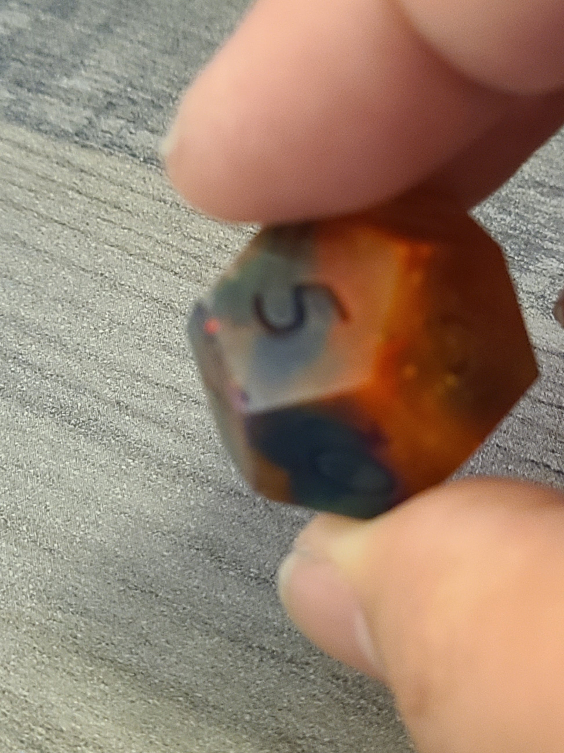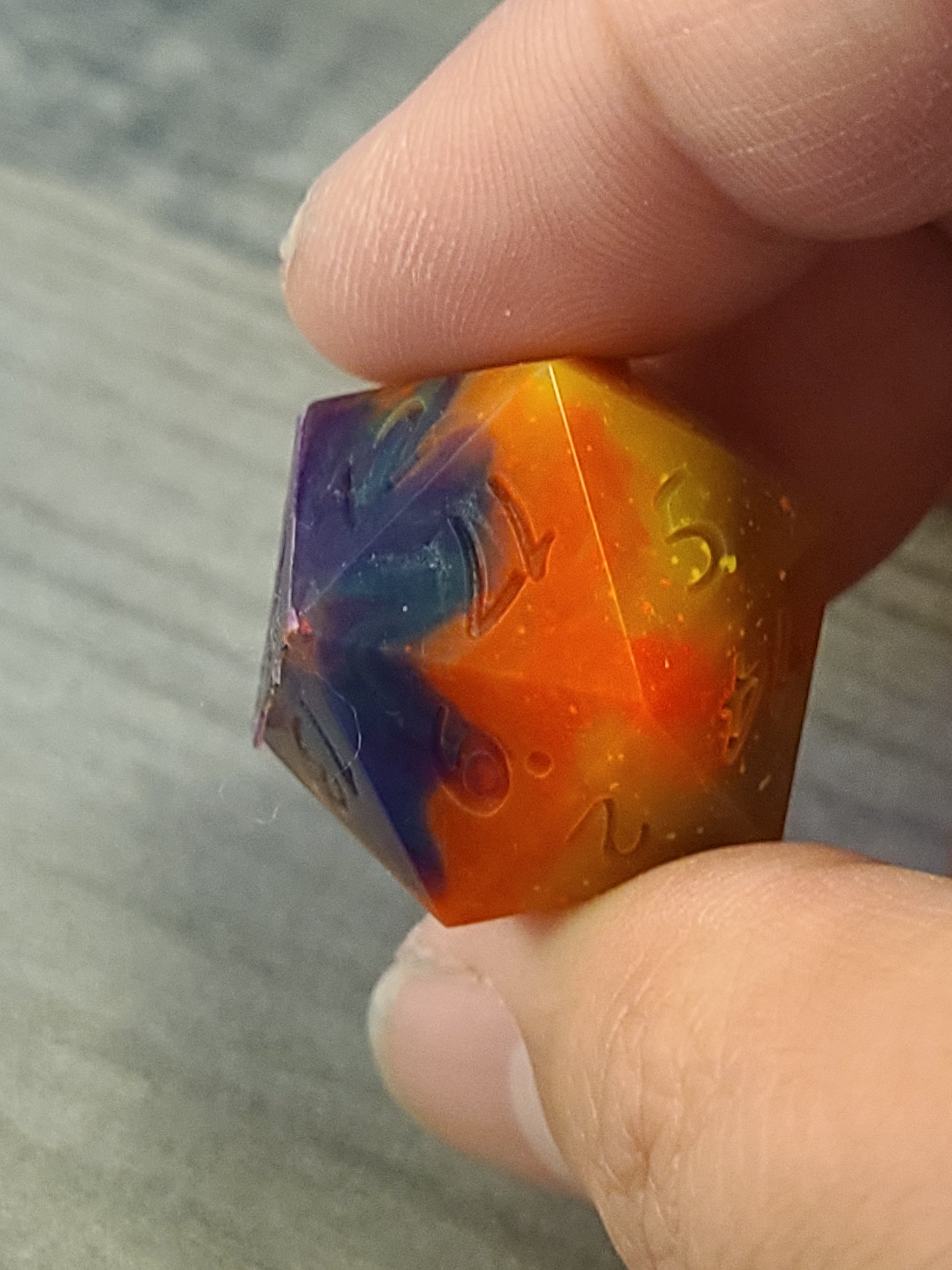 One of my attempts at a 6 color dirty pour - I waited too long trying to get swirls and resin started to cure which caused raised faces. Also some pigments didn't get full mixed in. There are voids in some and almost all of them have raised faces. A few are fine. This is a standard set and has d20's