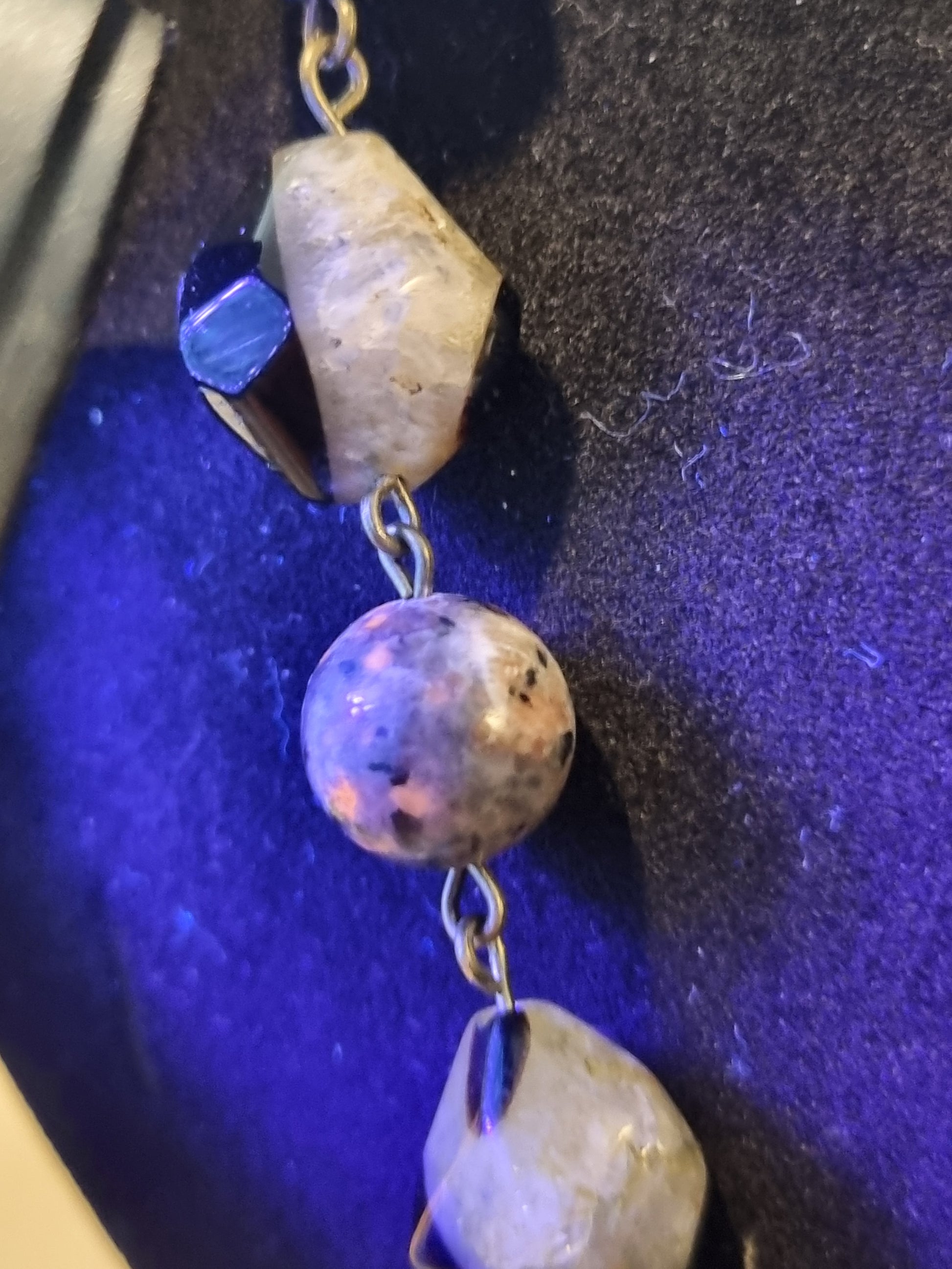 Larvikite - has a uv reaction in some of the stones. Larvikite is a stone of inner transformation that helps one better adapt to change, as well as accept and understand any benefits that may come with it.