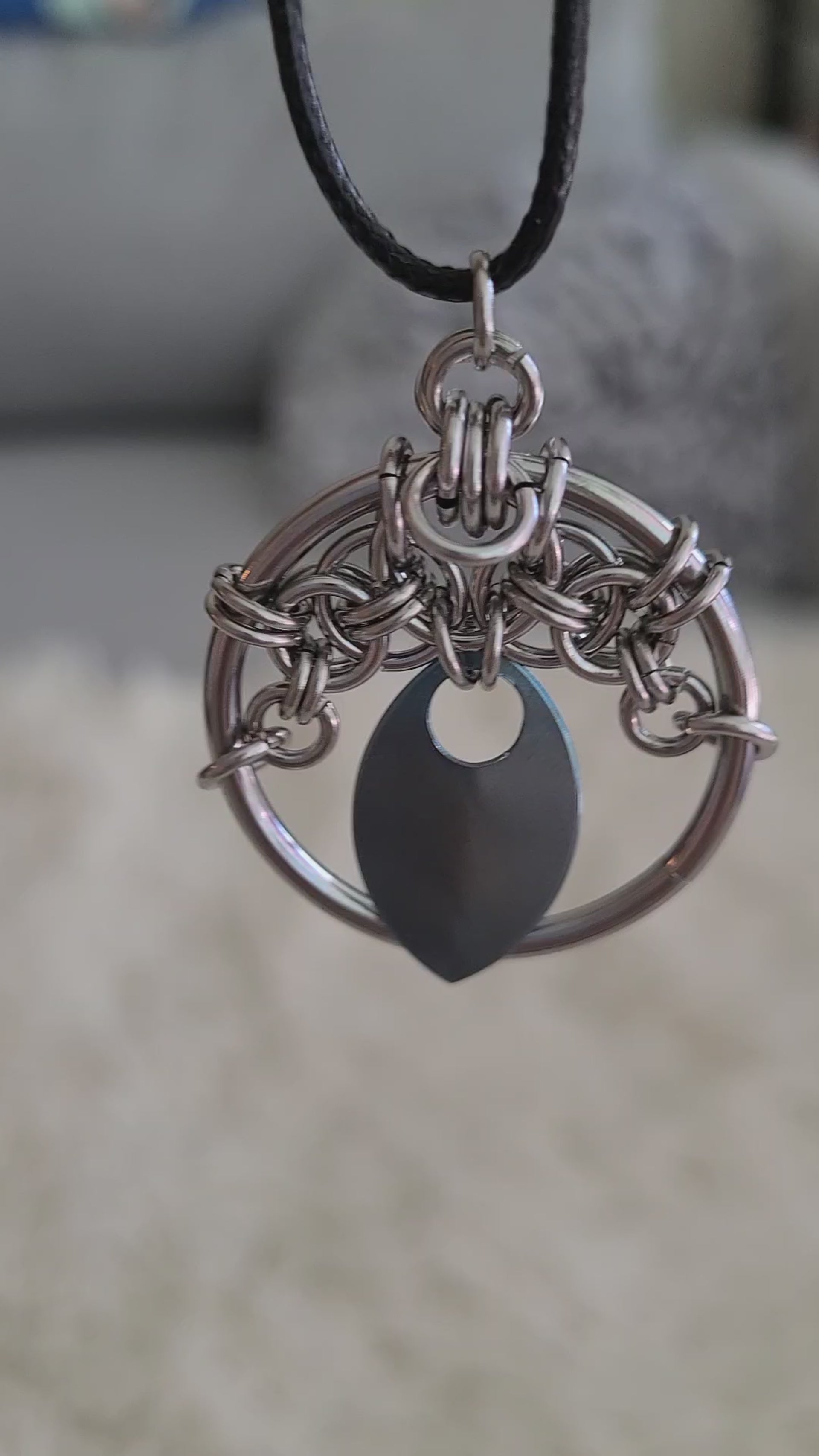 This pendant has stainless steel jump rings making a decorative "cage" to highlight the blue scale.