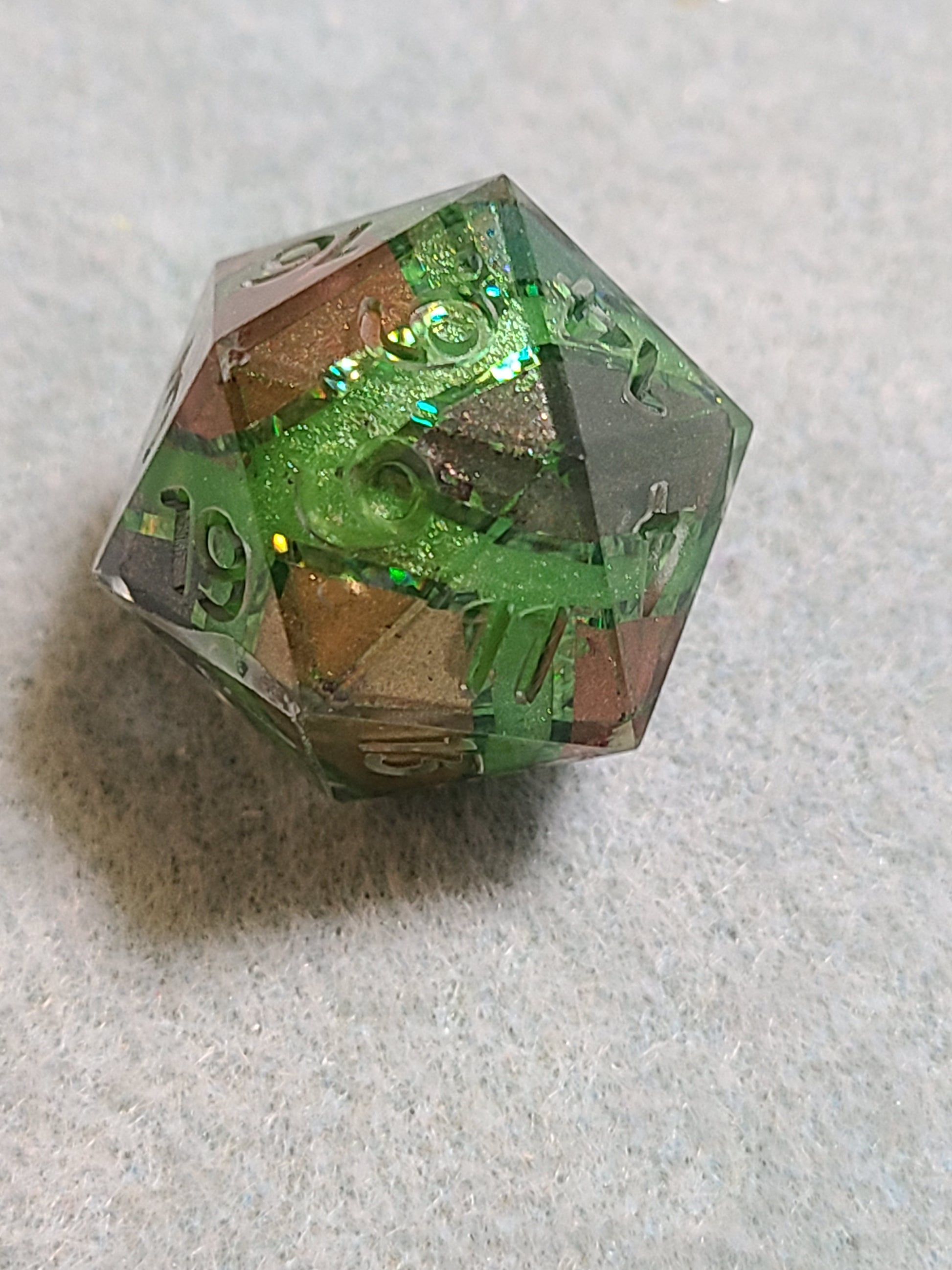 These beautiful dice takes the design from the epoxy cups where we "shatter" the glass and "put it back together". Like stained glass, but with more chaos.