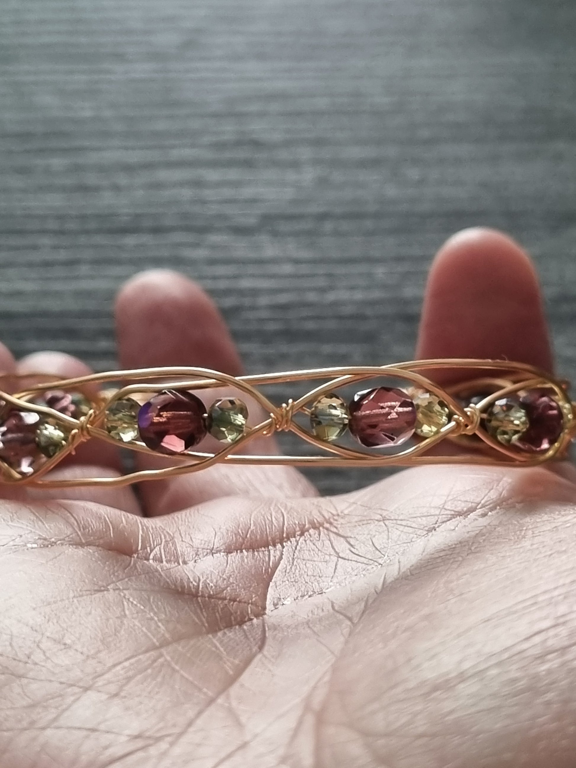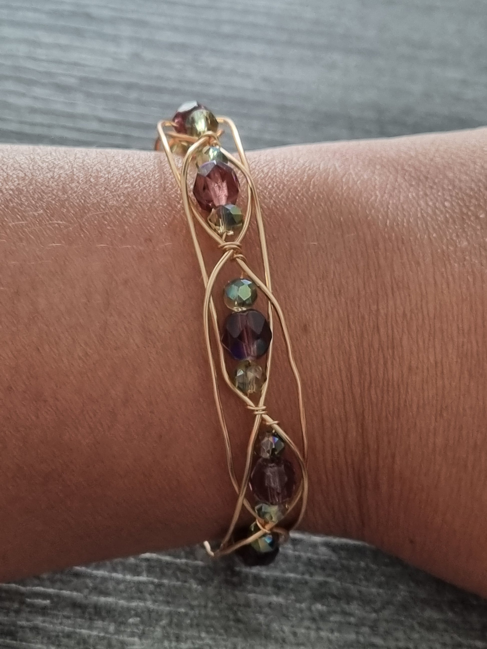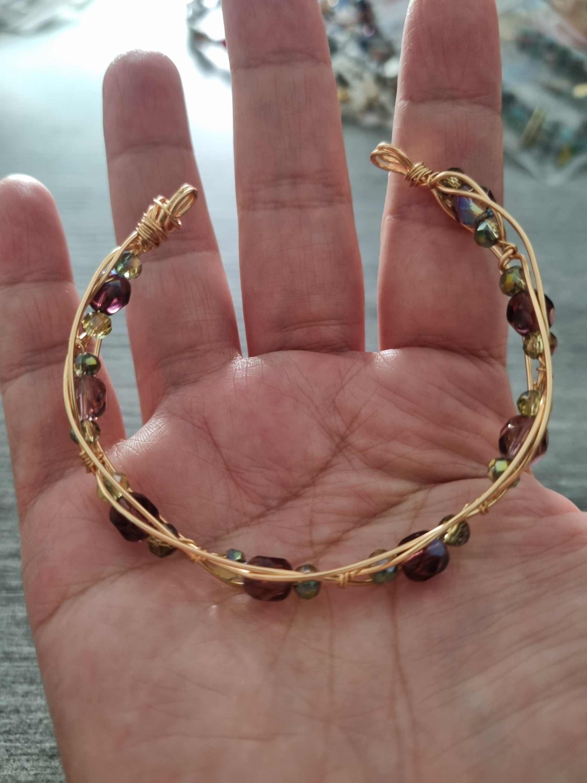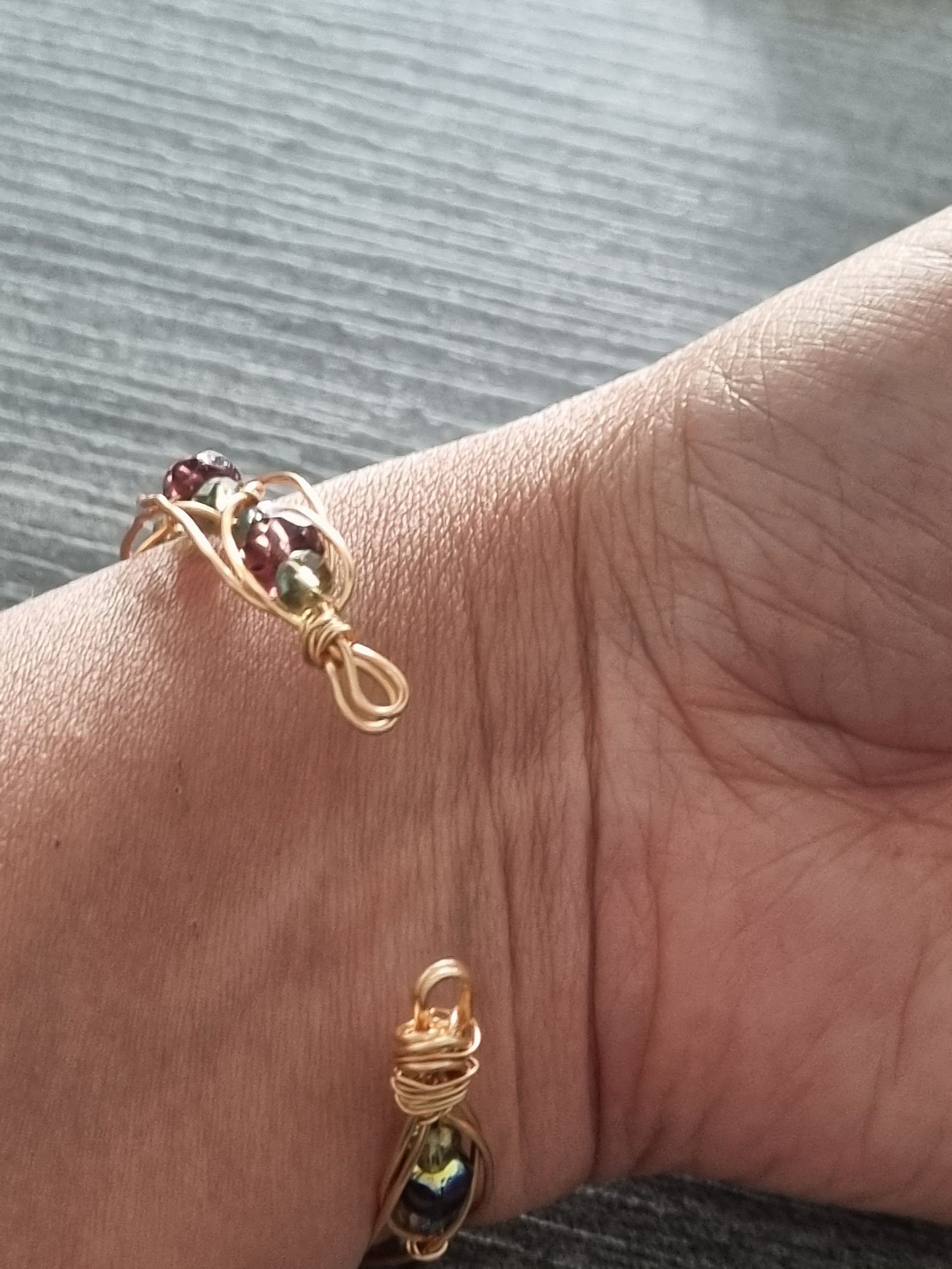 Made with soft gold plated copper wire and glass beads, this bangle is anti-tarnish and it is soft enough to mold around your wrist for a comfortable fit.