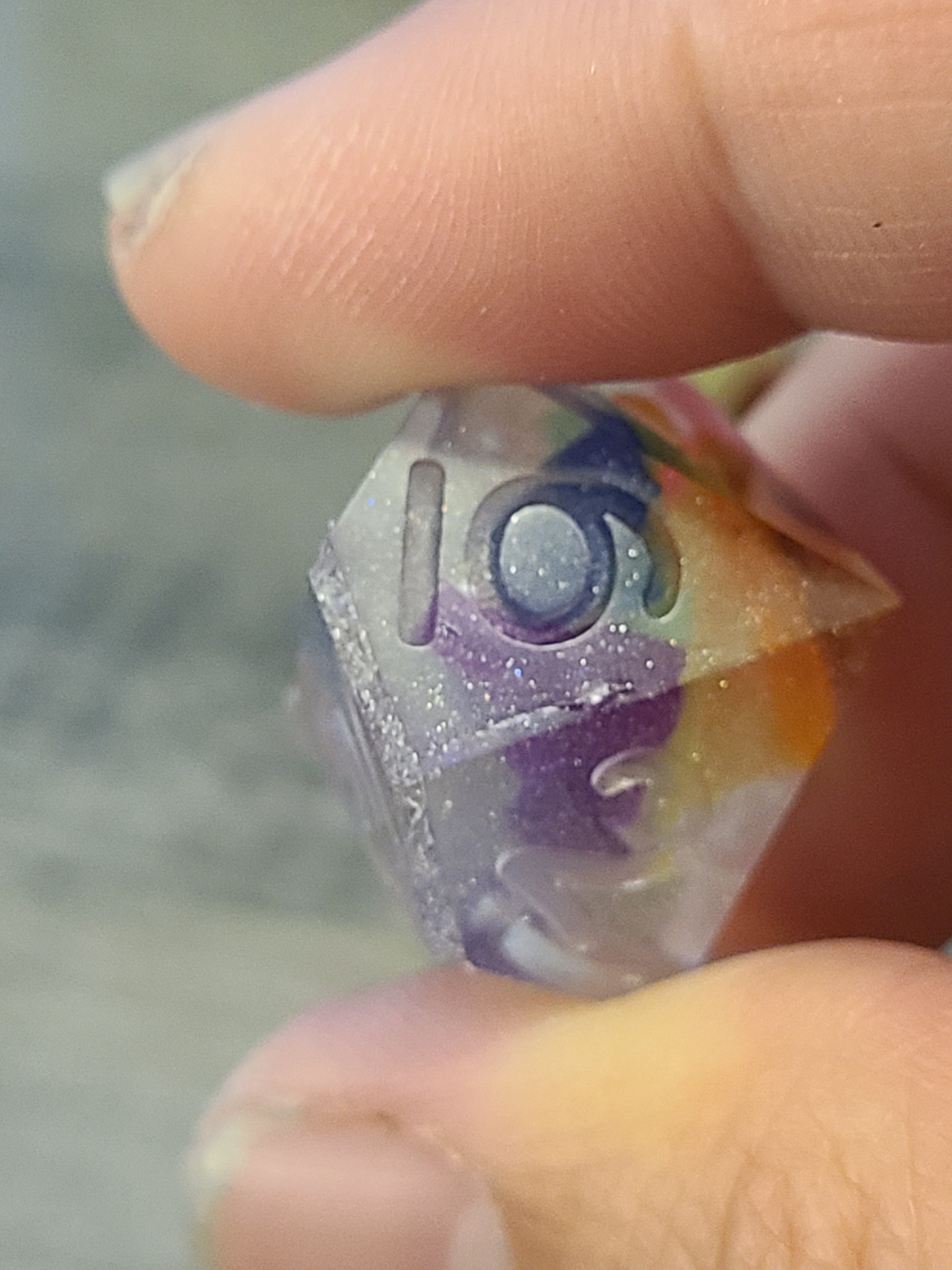 One of my attempts at the rainbow confetti set and the cap..always the cap. There are voids in some and almost all of them have raised faces. A few are fine. This is a standard set and has an additional crystal d4 and a d2. My logo is on all the high faces.