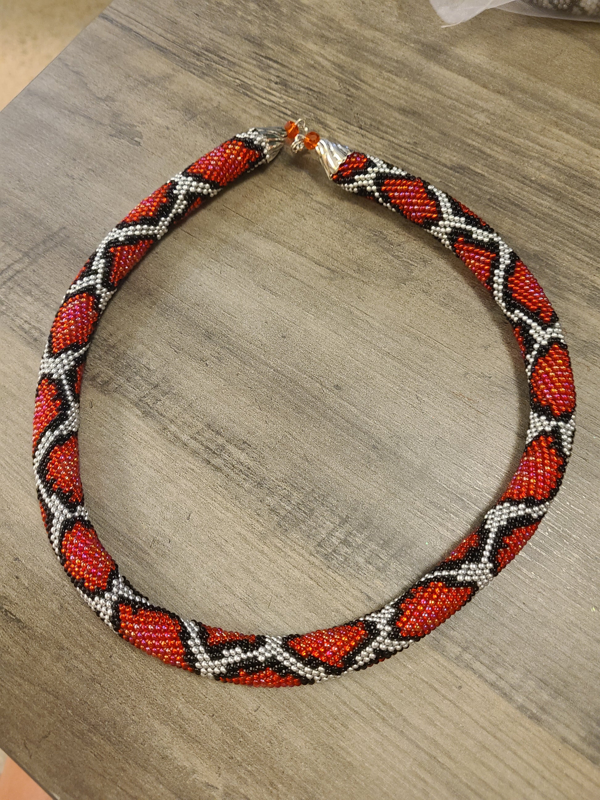 This set is a beaded crochet design by Crazyyy Academy. The design is done with transparent seed beads. It's soft and flexible.
