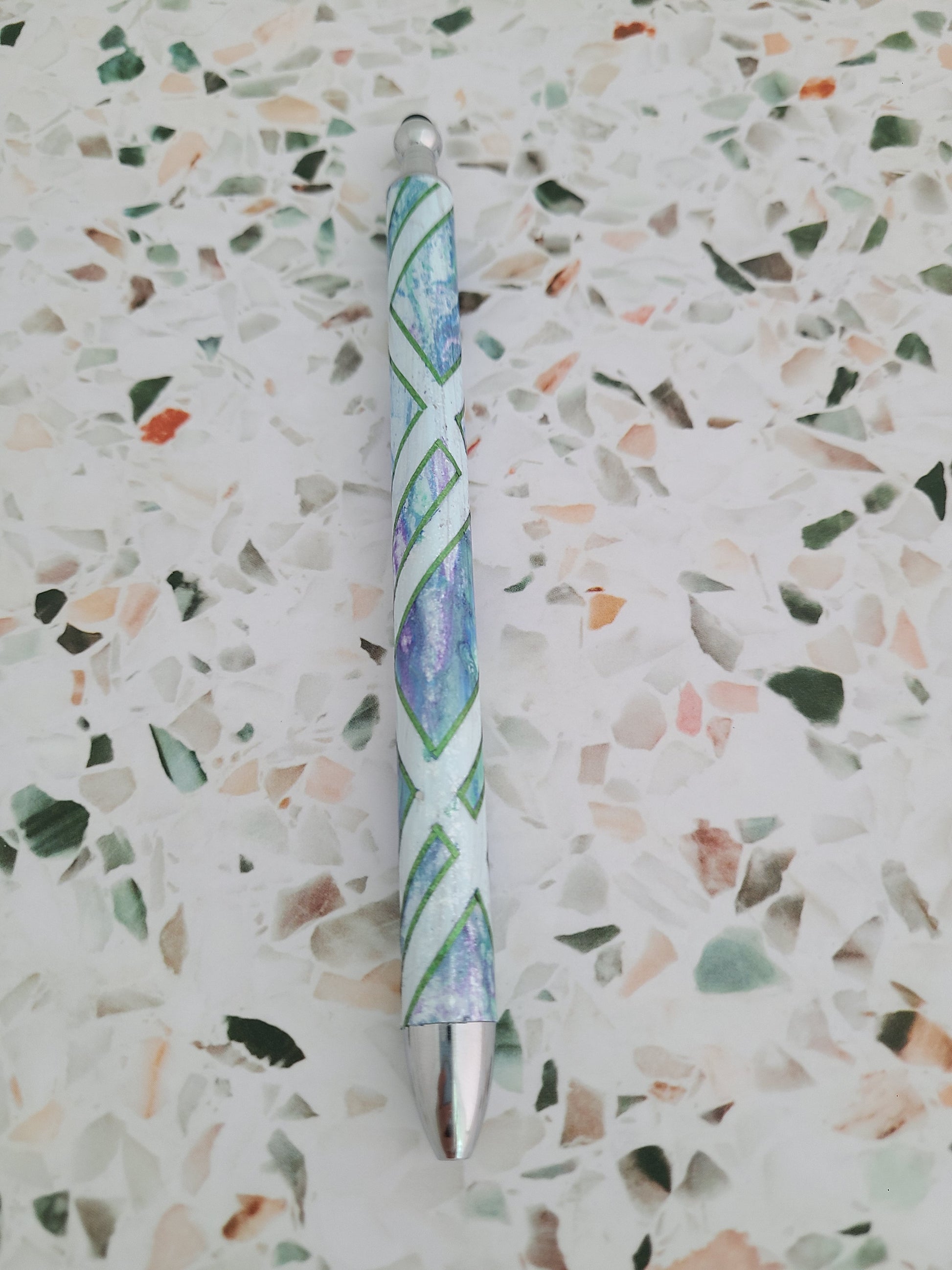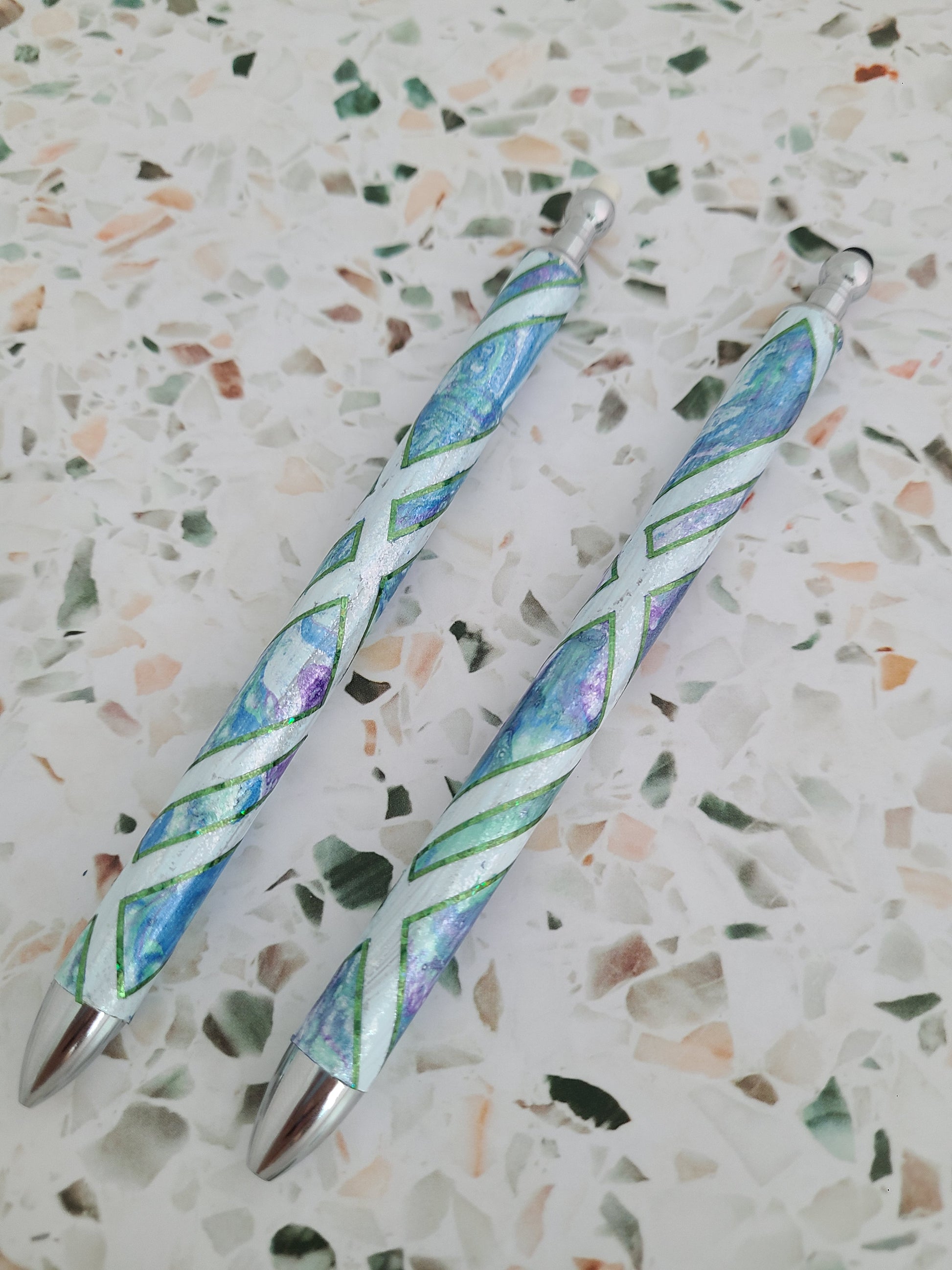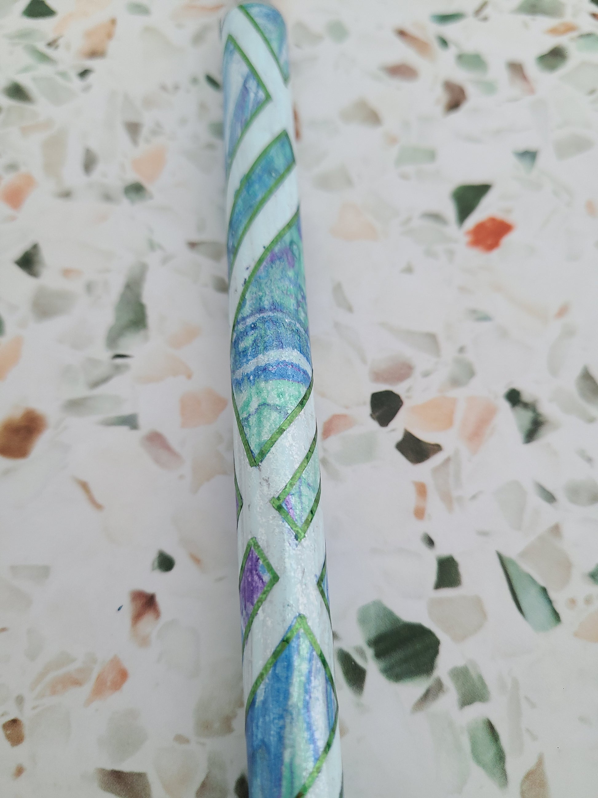 A glittered background, then shattered and hydrop dipped in green blue and purple metallic.