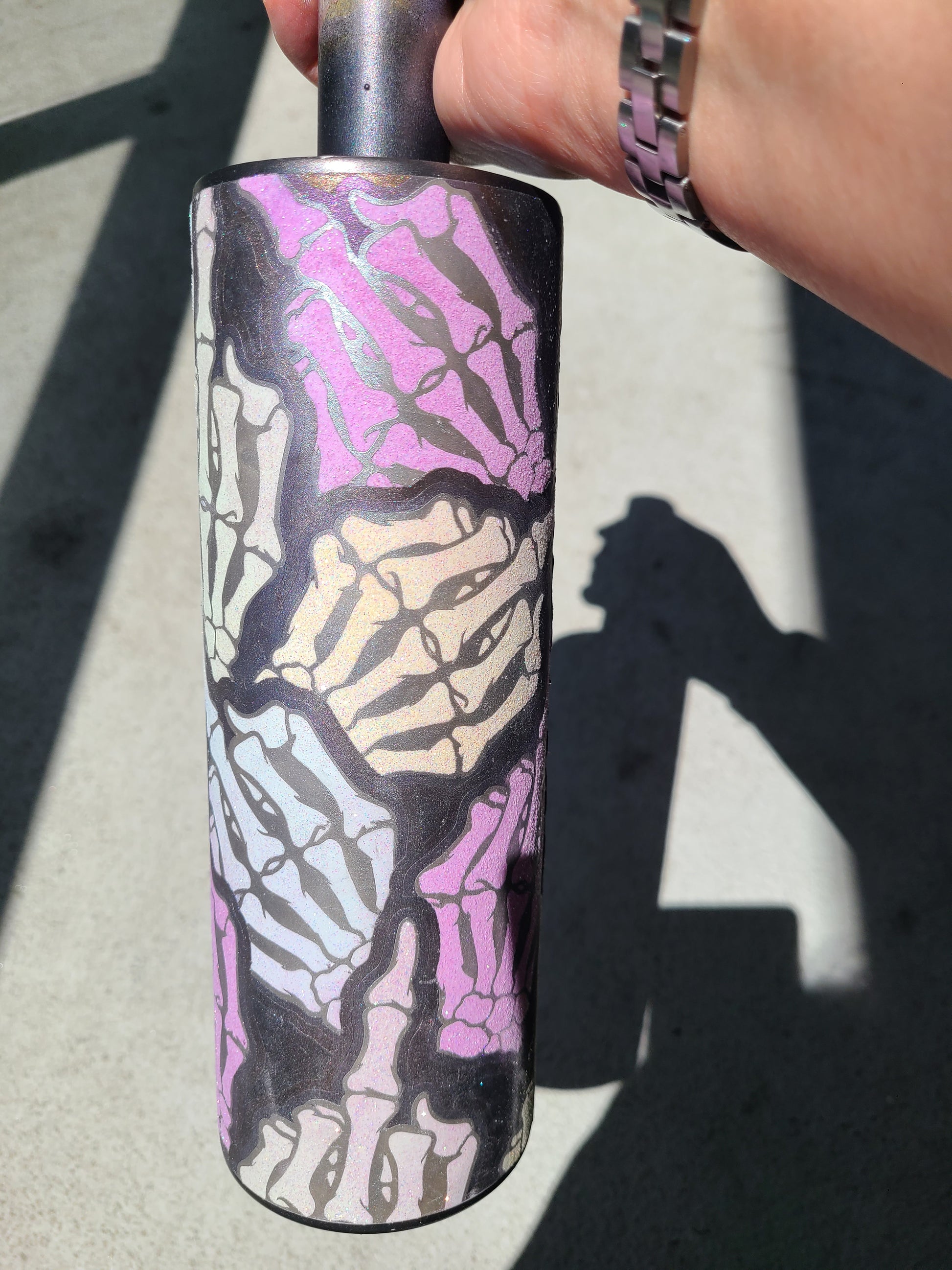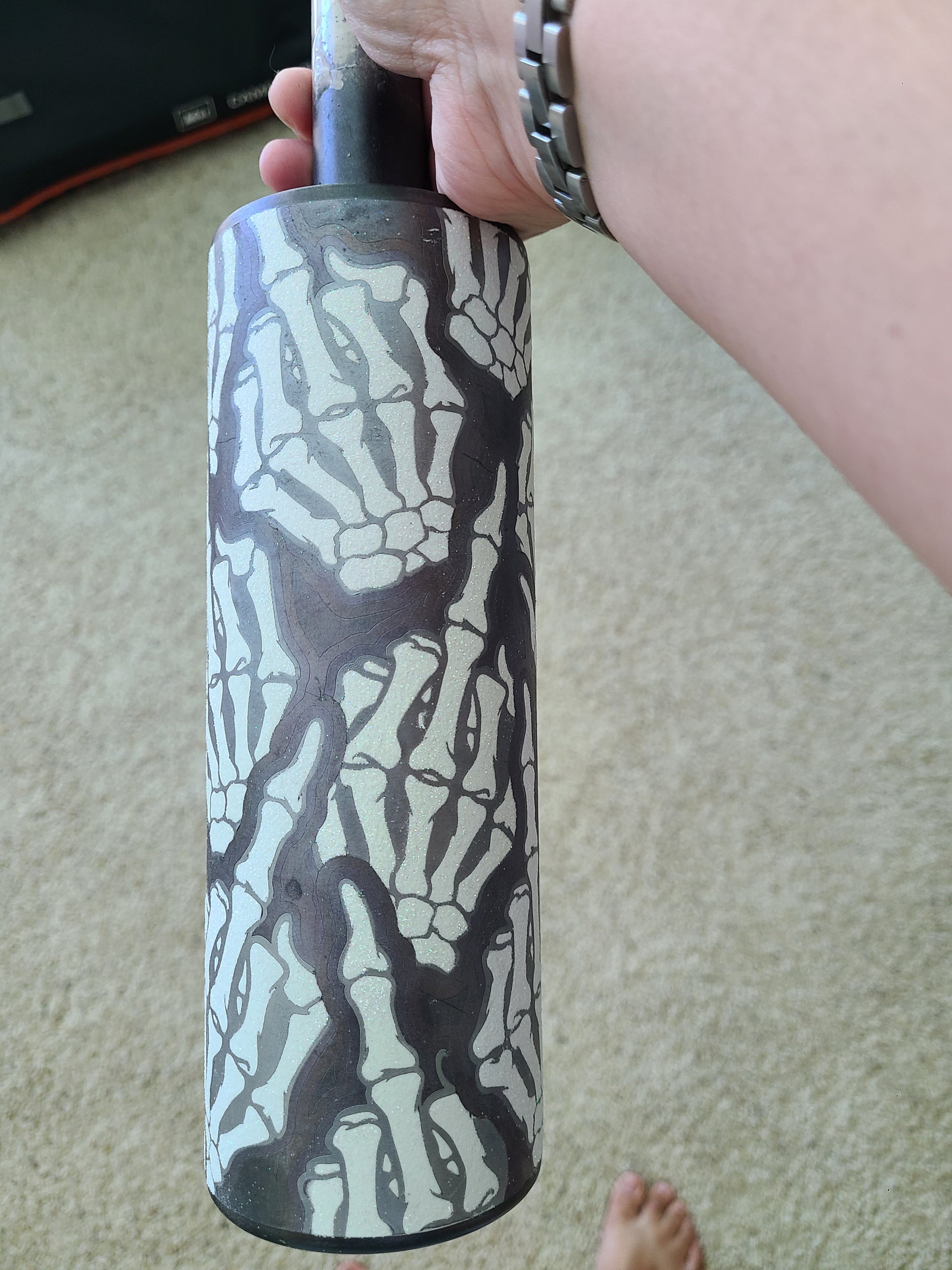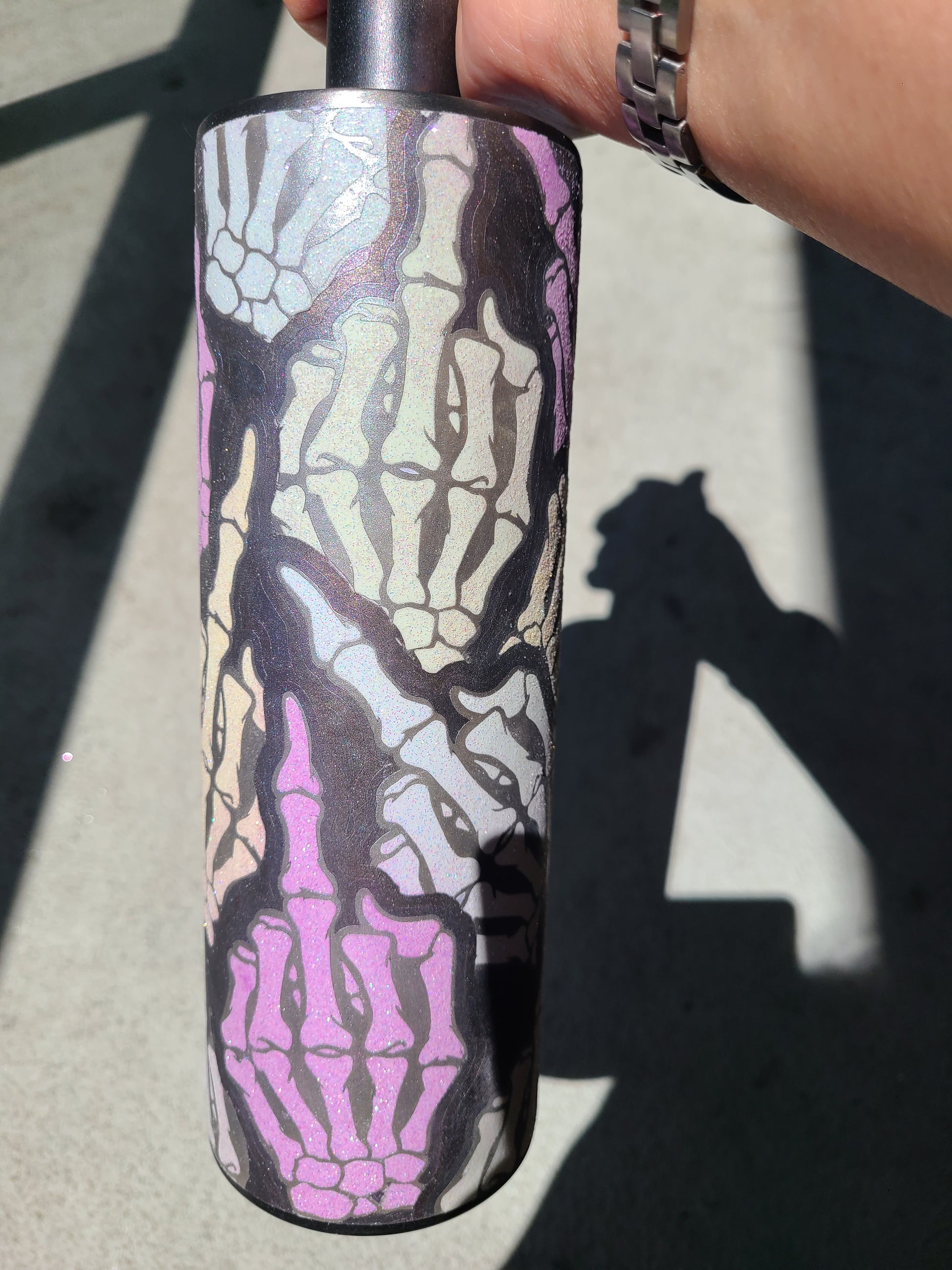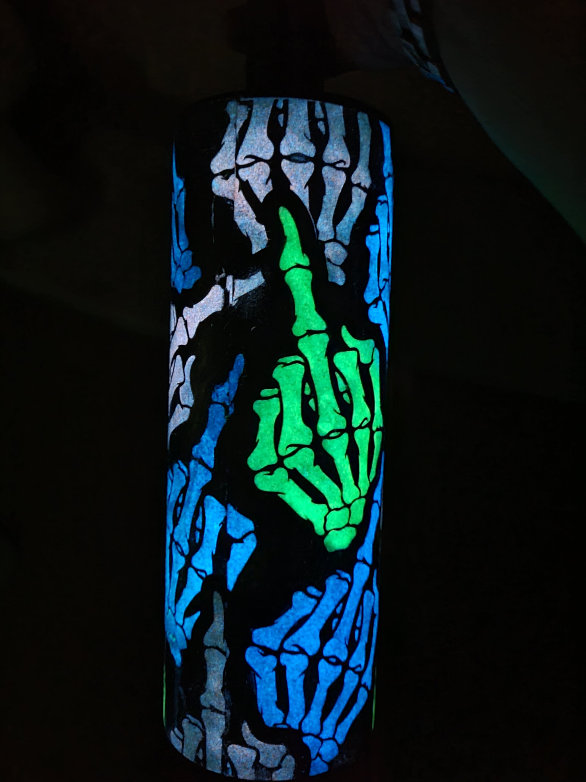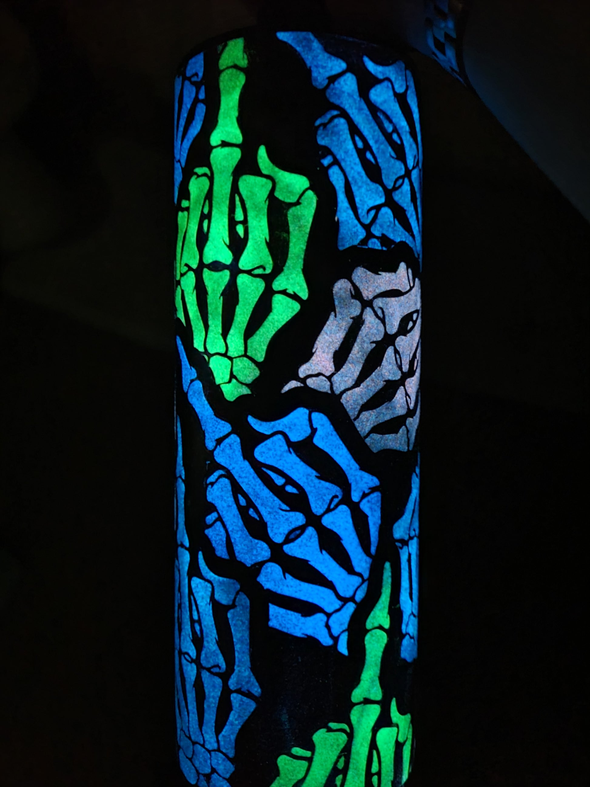 This is done with a uv glow glitter so the cup changes in the sunlight as well as glows in the dark.