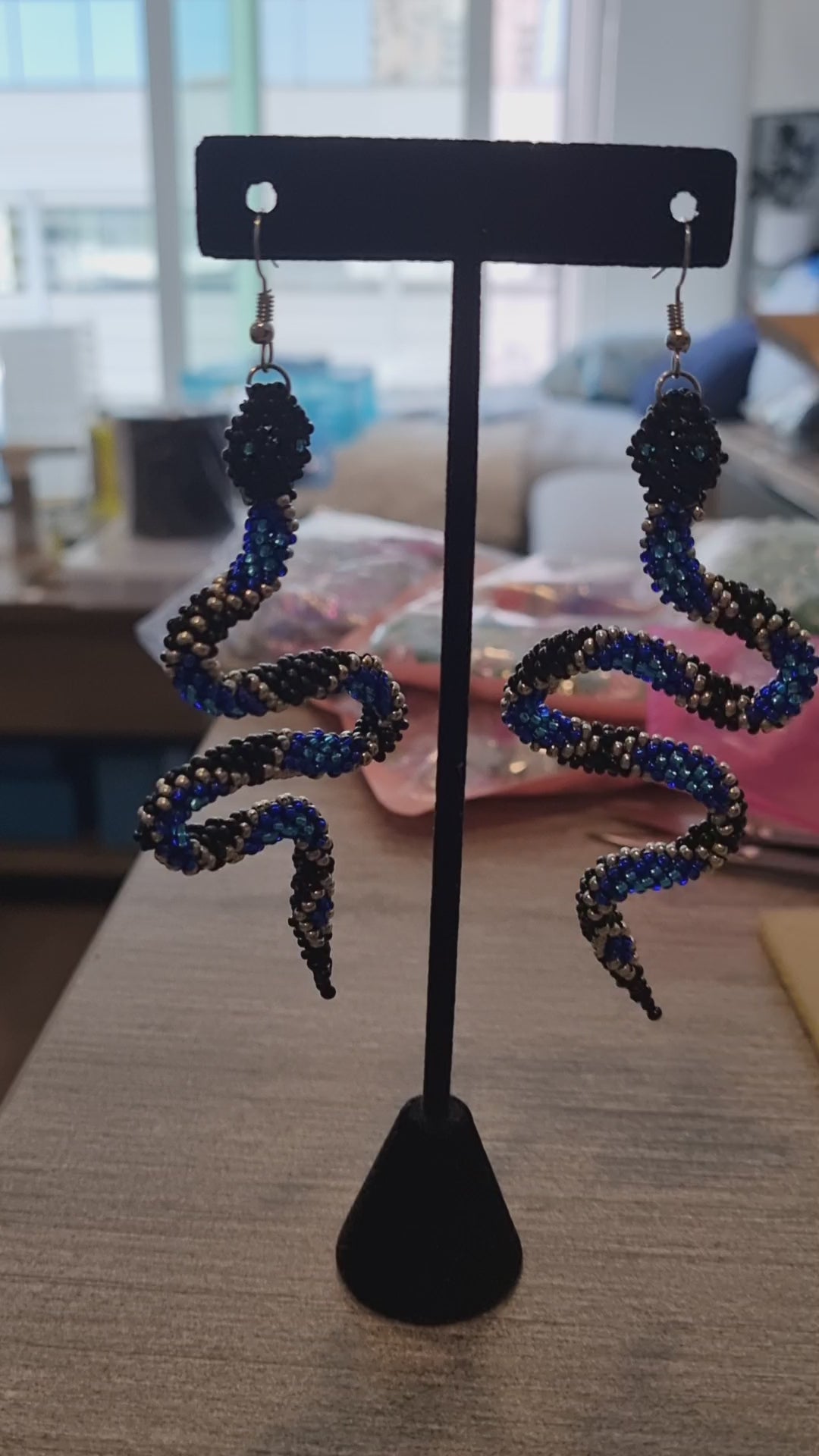 There are hand beaded and one of a kind. They are statement earrings and very large and in charge. Roughly 4" long! They do have a wire running through them and are bendable/adjustable to some extent.