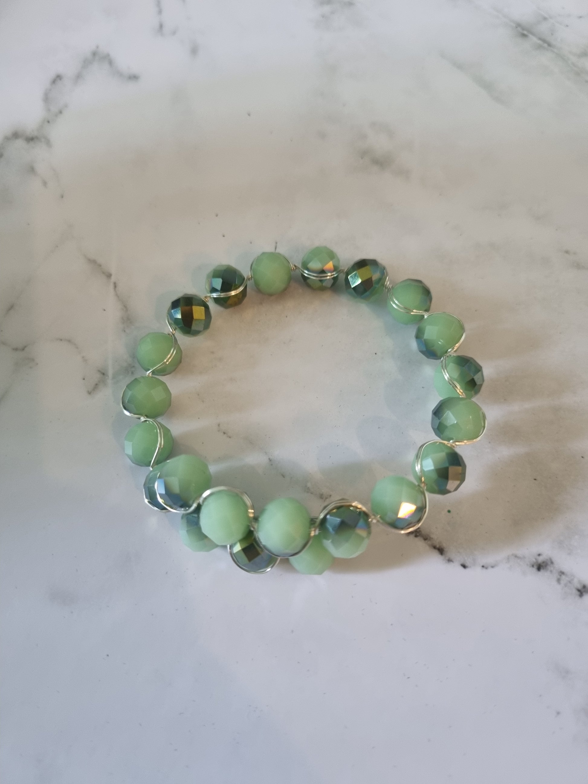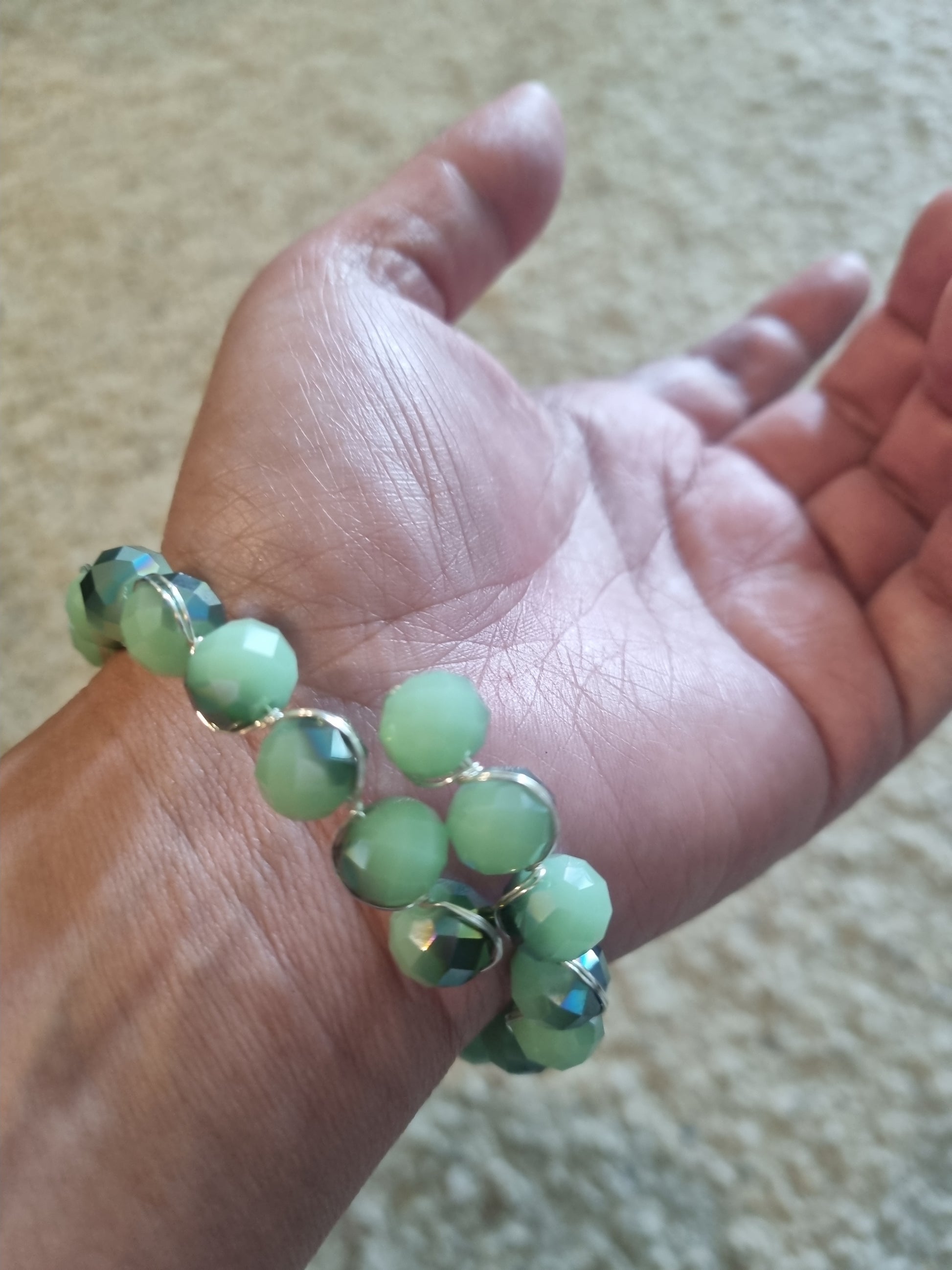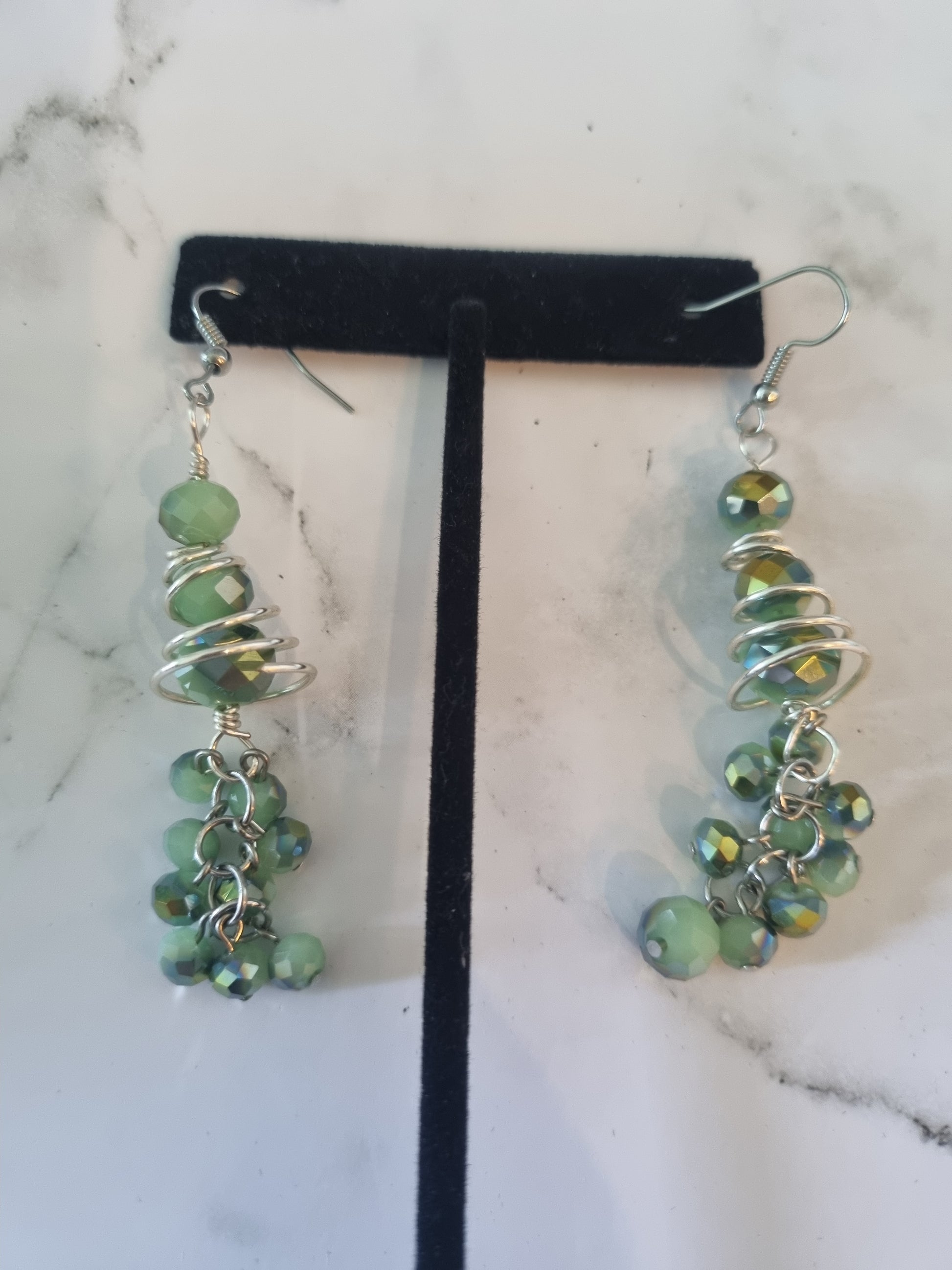 The party never stop with these sparkly babies. These delicate earrings are wire wrapped in spirals to make those beads shine. As these are individual made and wrapped, there are individual differences. Measures roughly 3" in length and .5" in width.