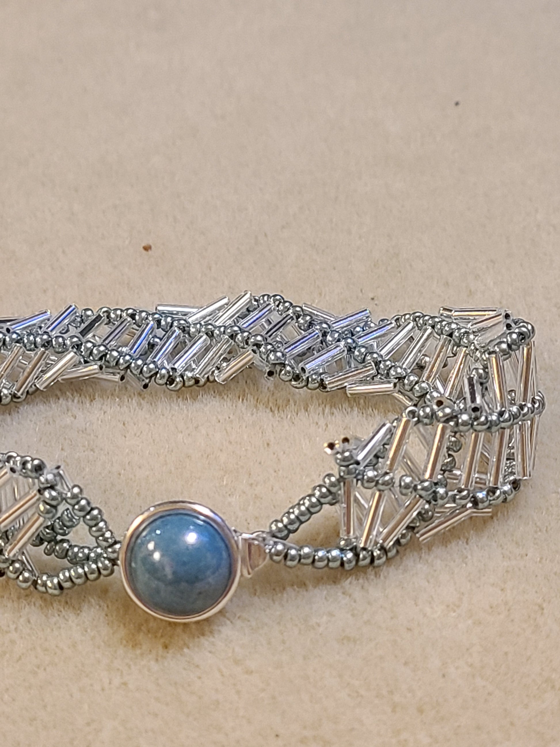 This is hand-beaded with seed beads and bugles. Looks like a some fancy double helix dna.