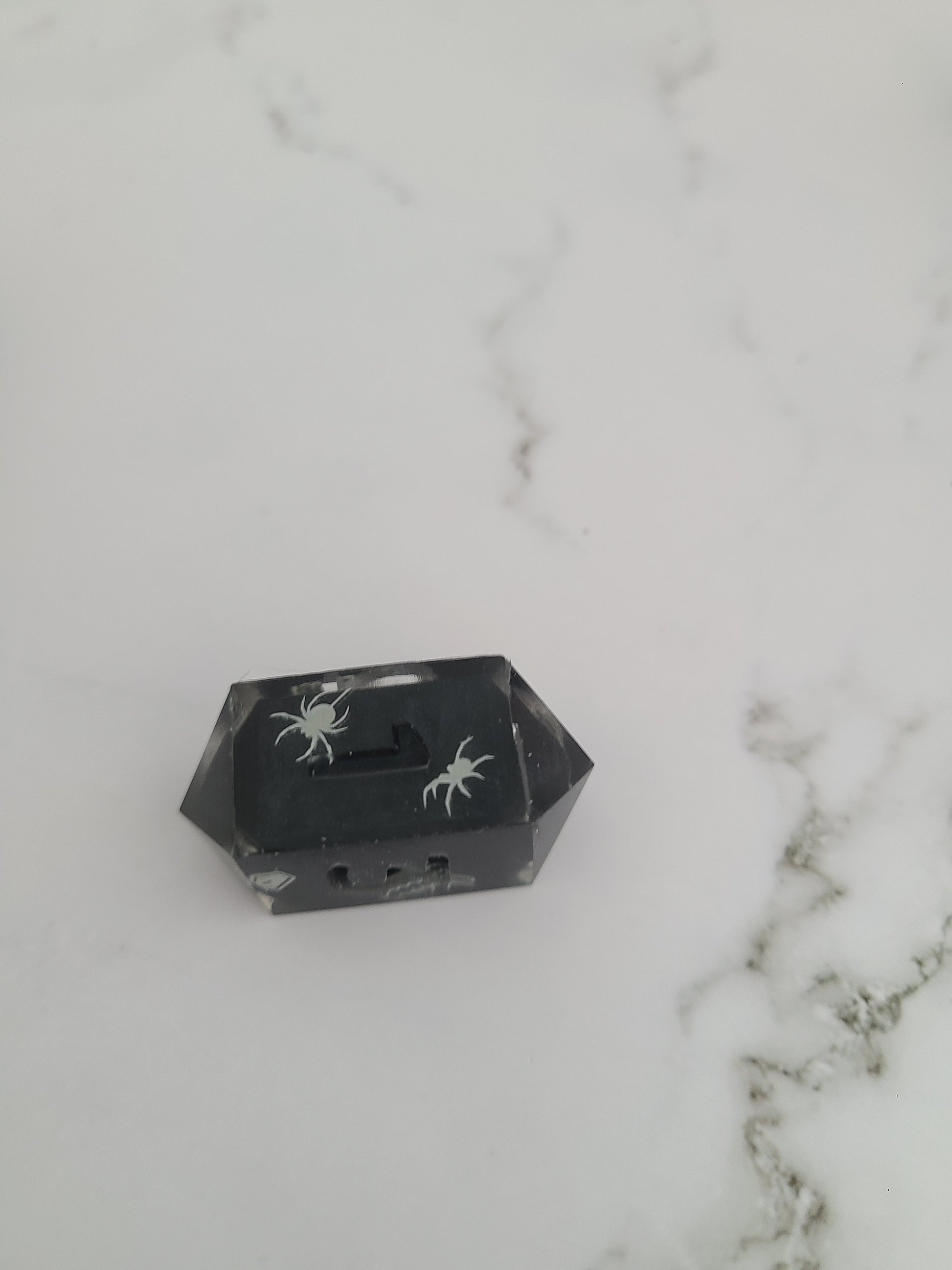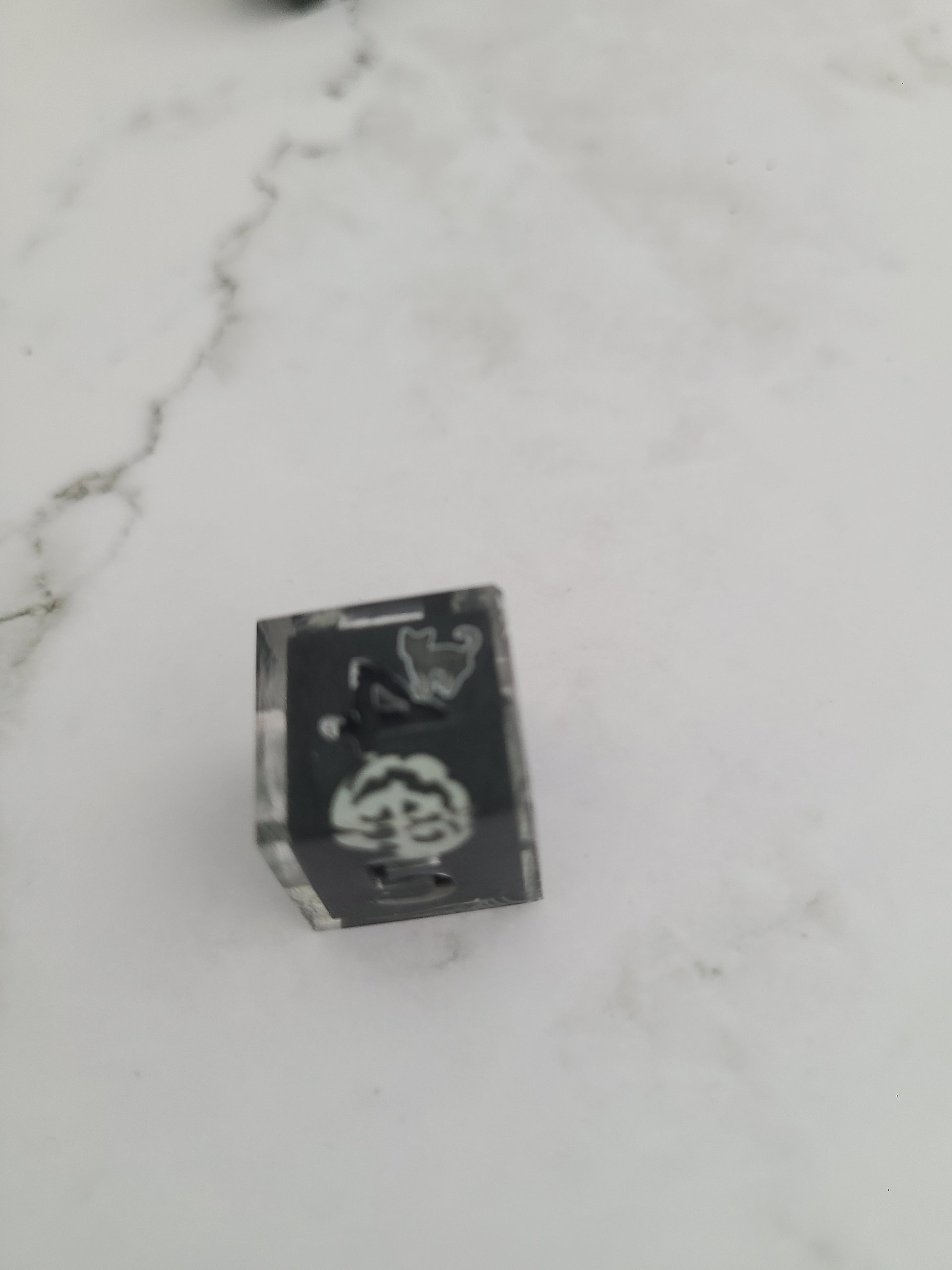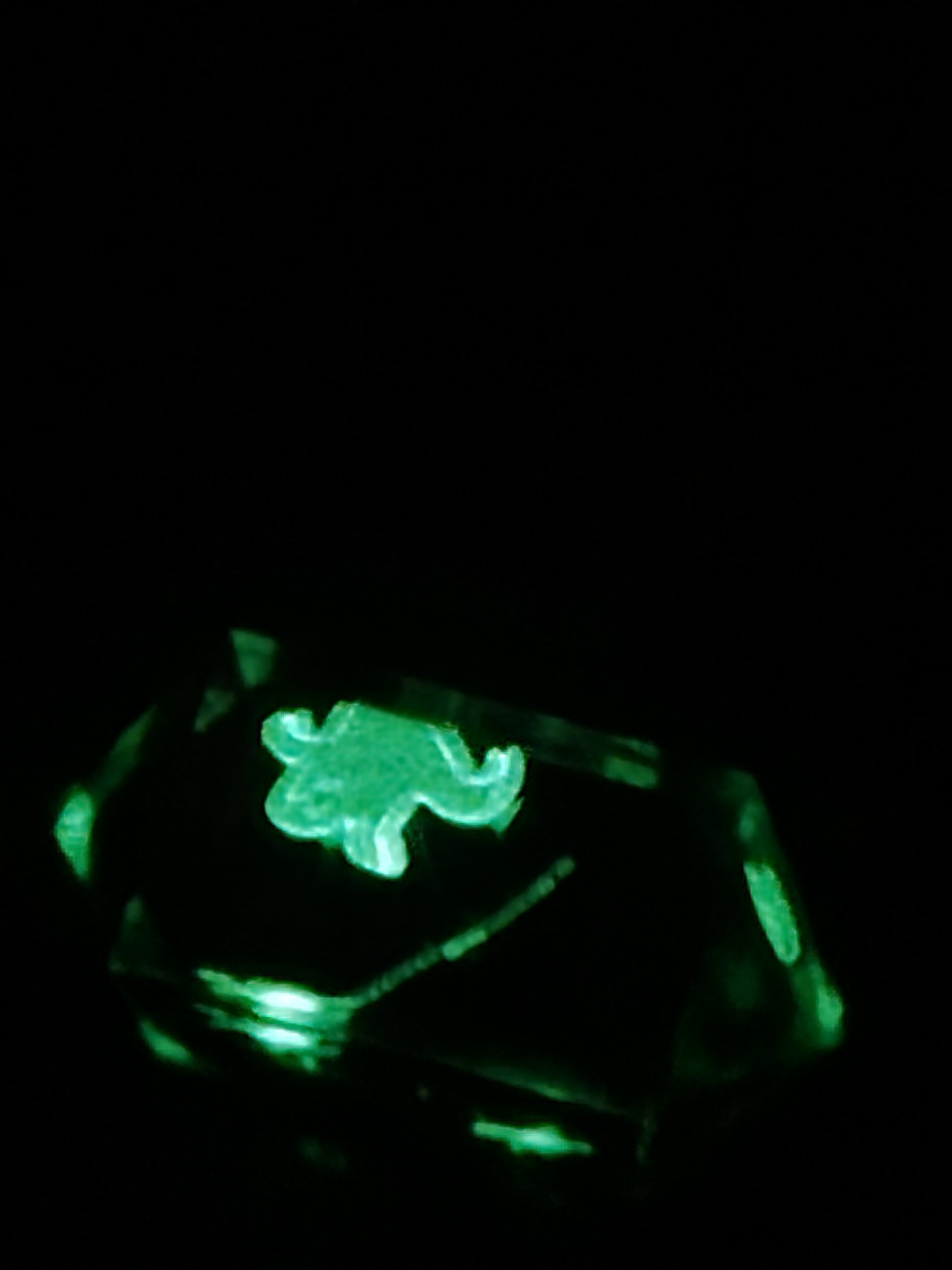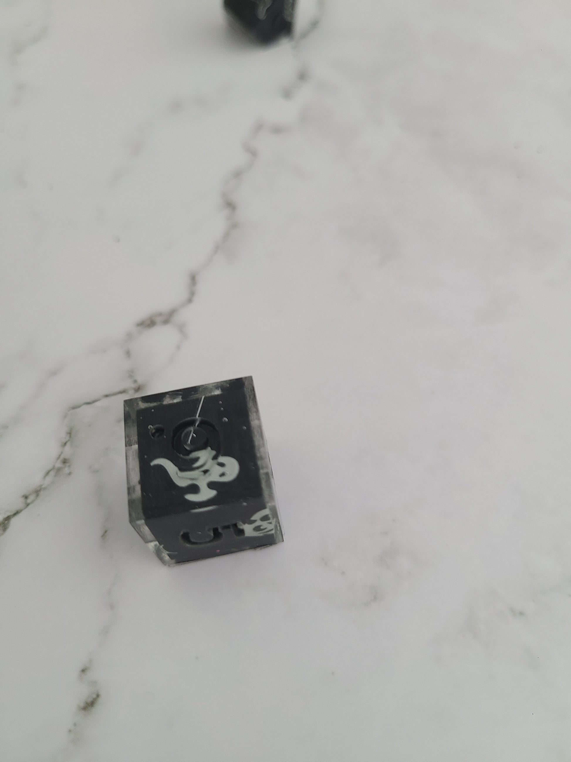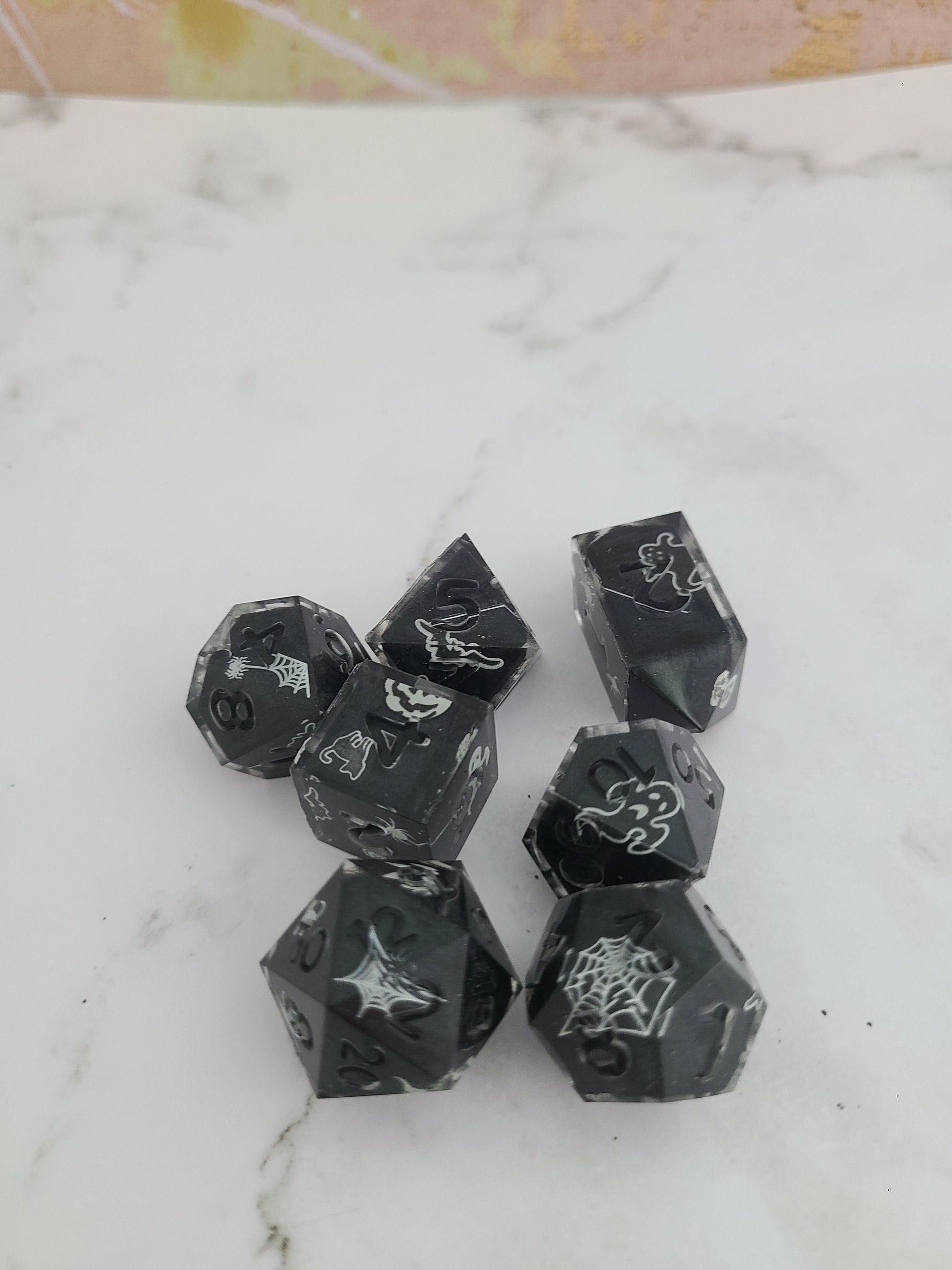 These have dice blanks decorated with glow in the dark stickers and then cast in their numbers. Can ink in glow in the dark ink.