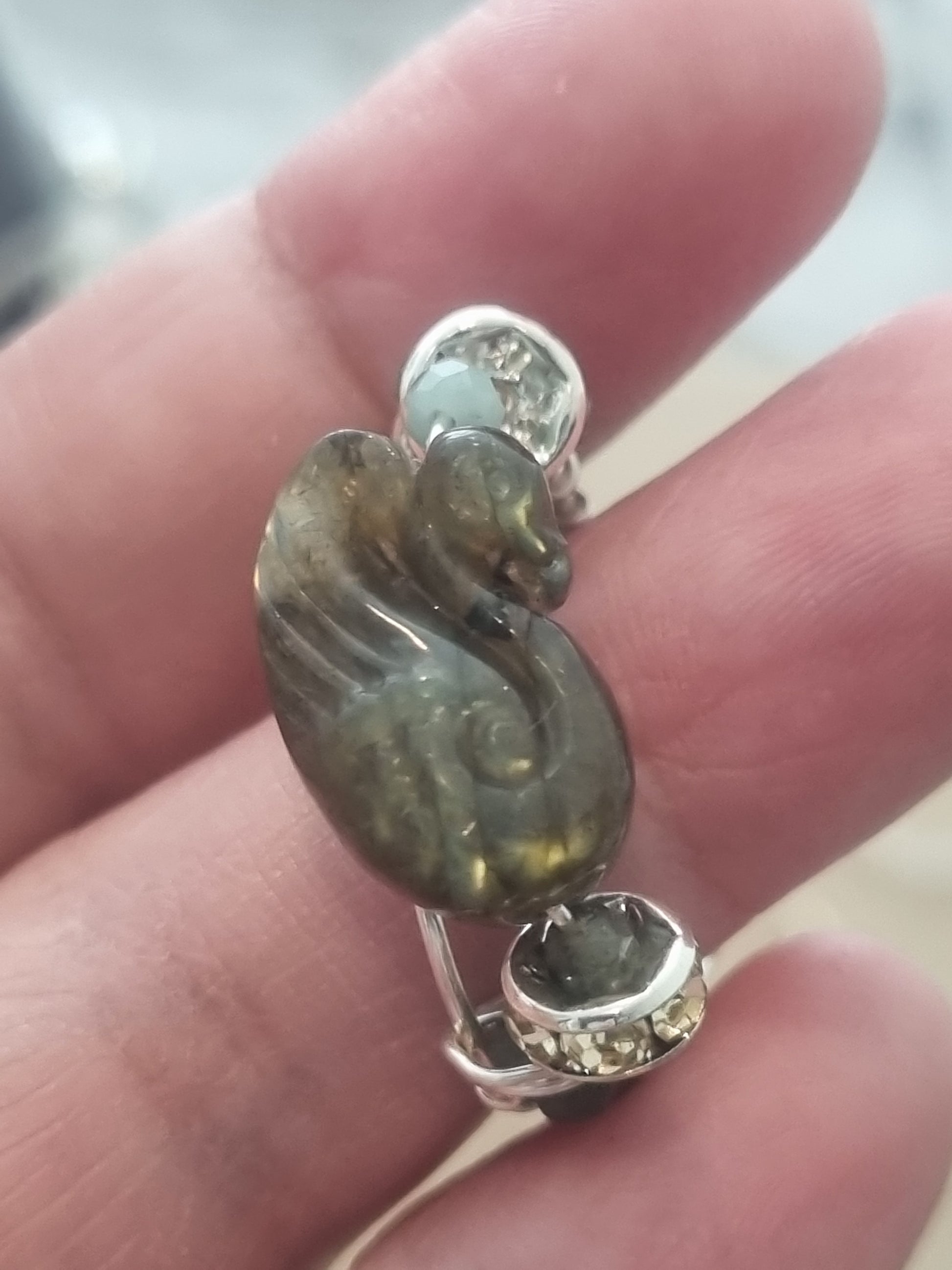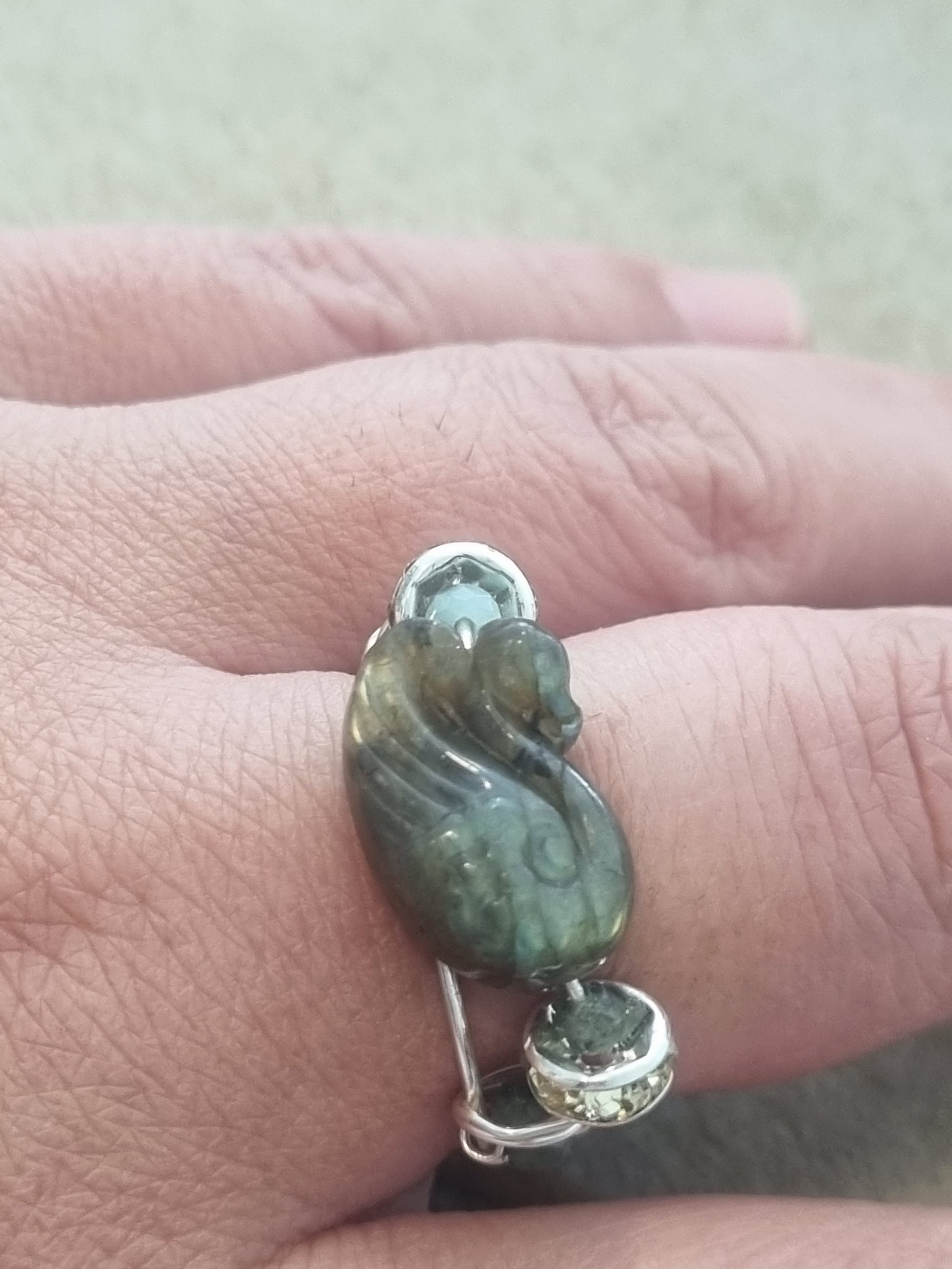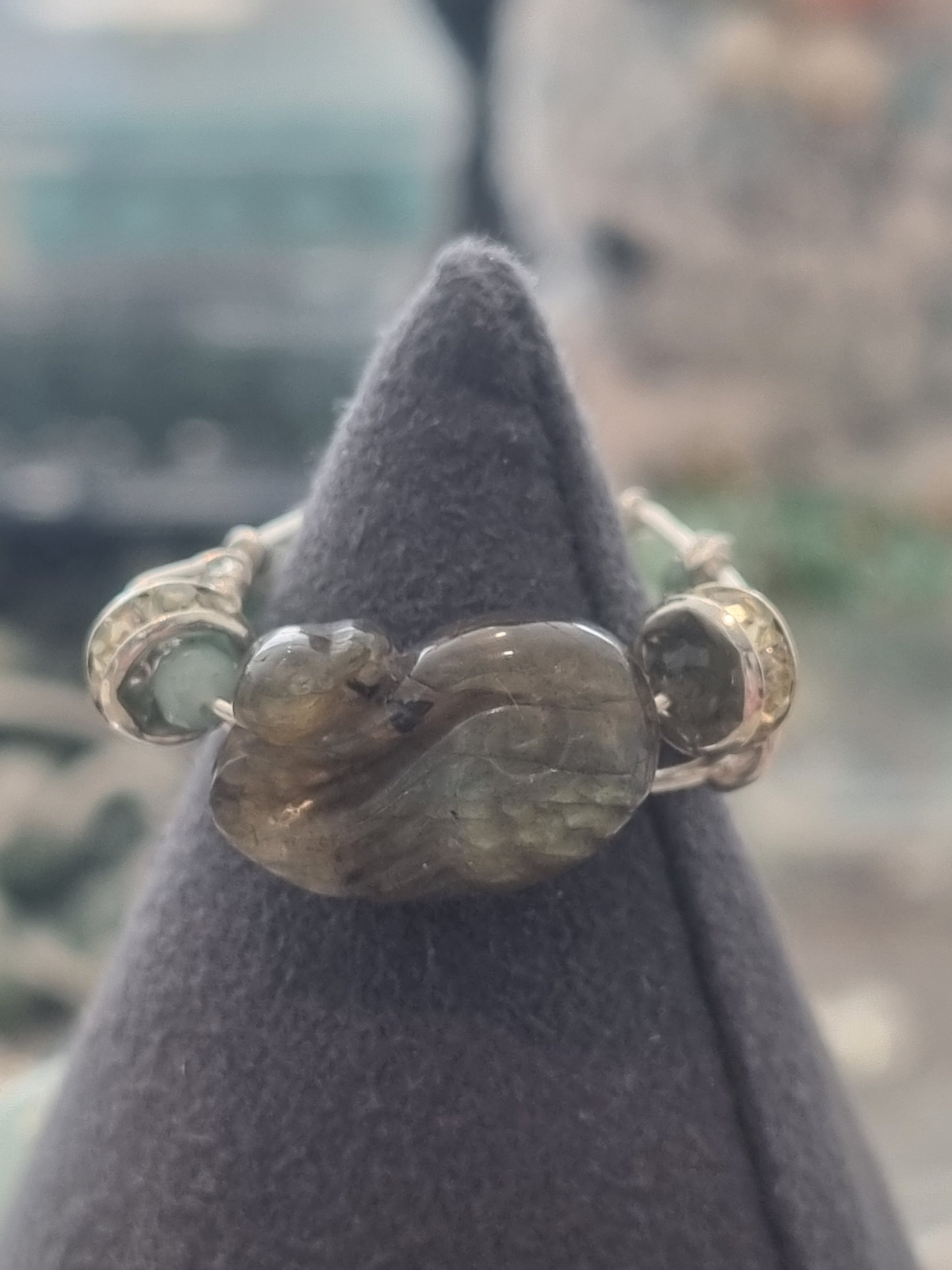 Labradorite Swan (mostly green) with emerald crystals and green cz spacer. Size 8 - slightly adjustable