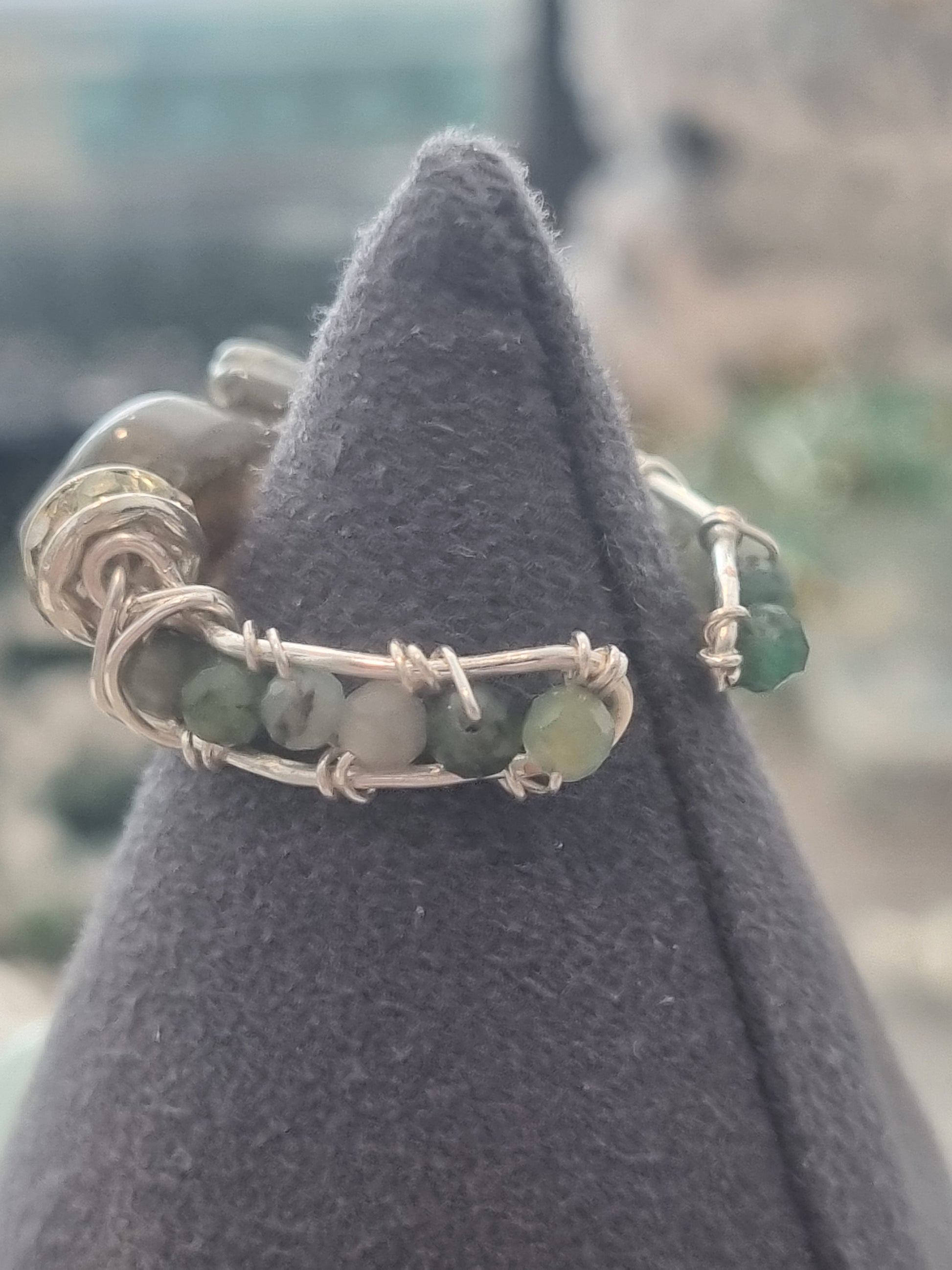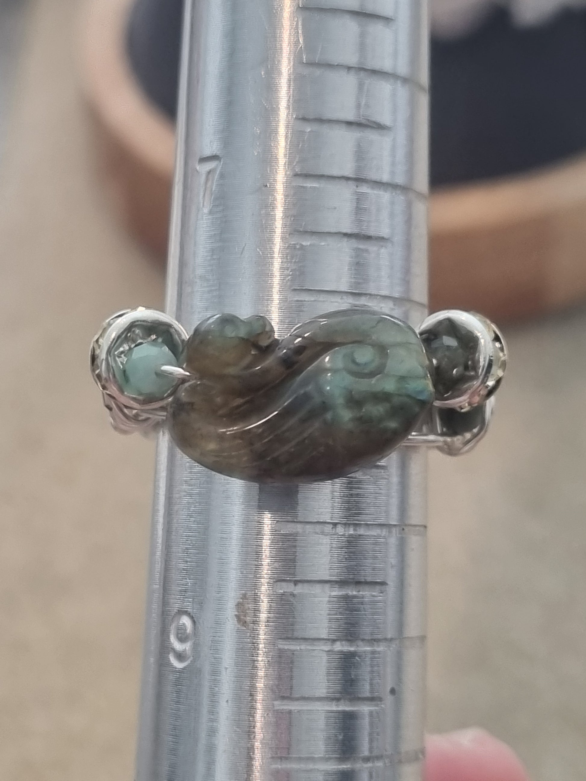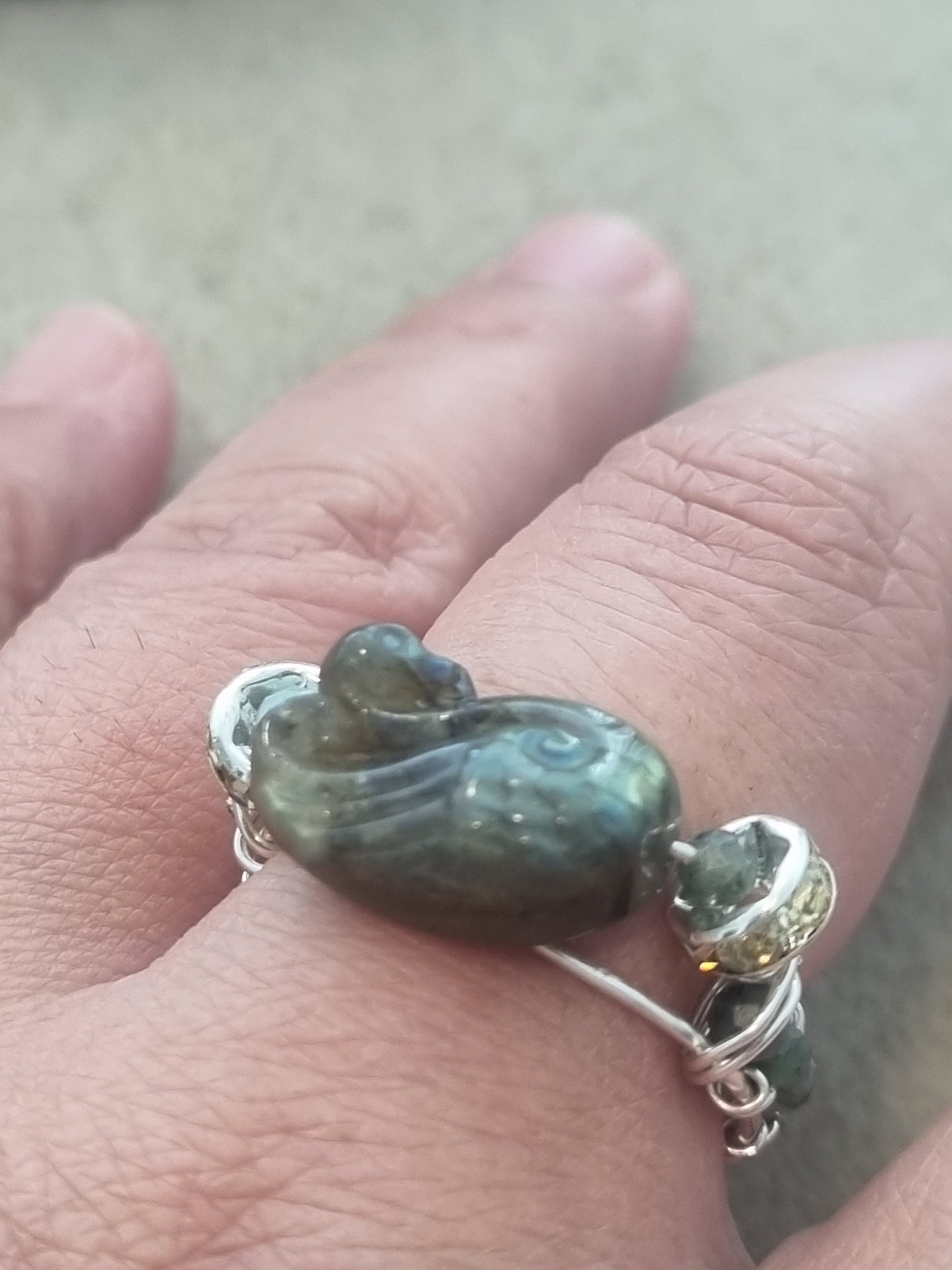 Labradorite Swan (mostly green) with emerald crystals and green cz spacer. Size 8 - slightly adjustable