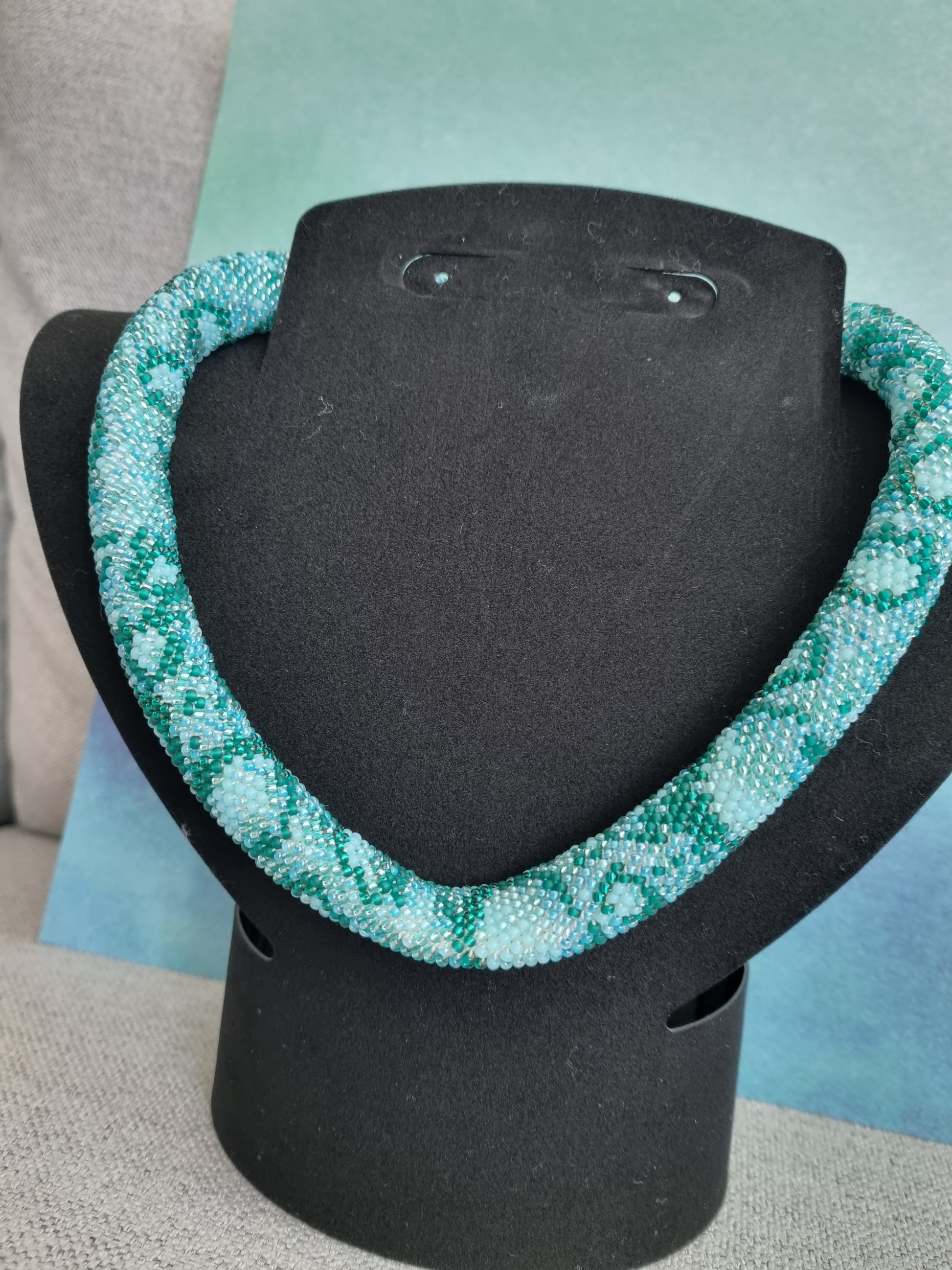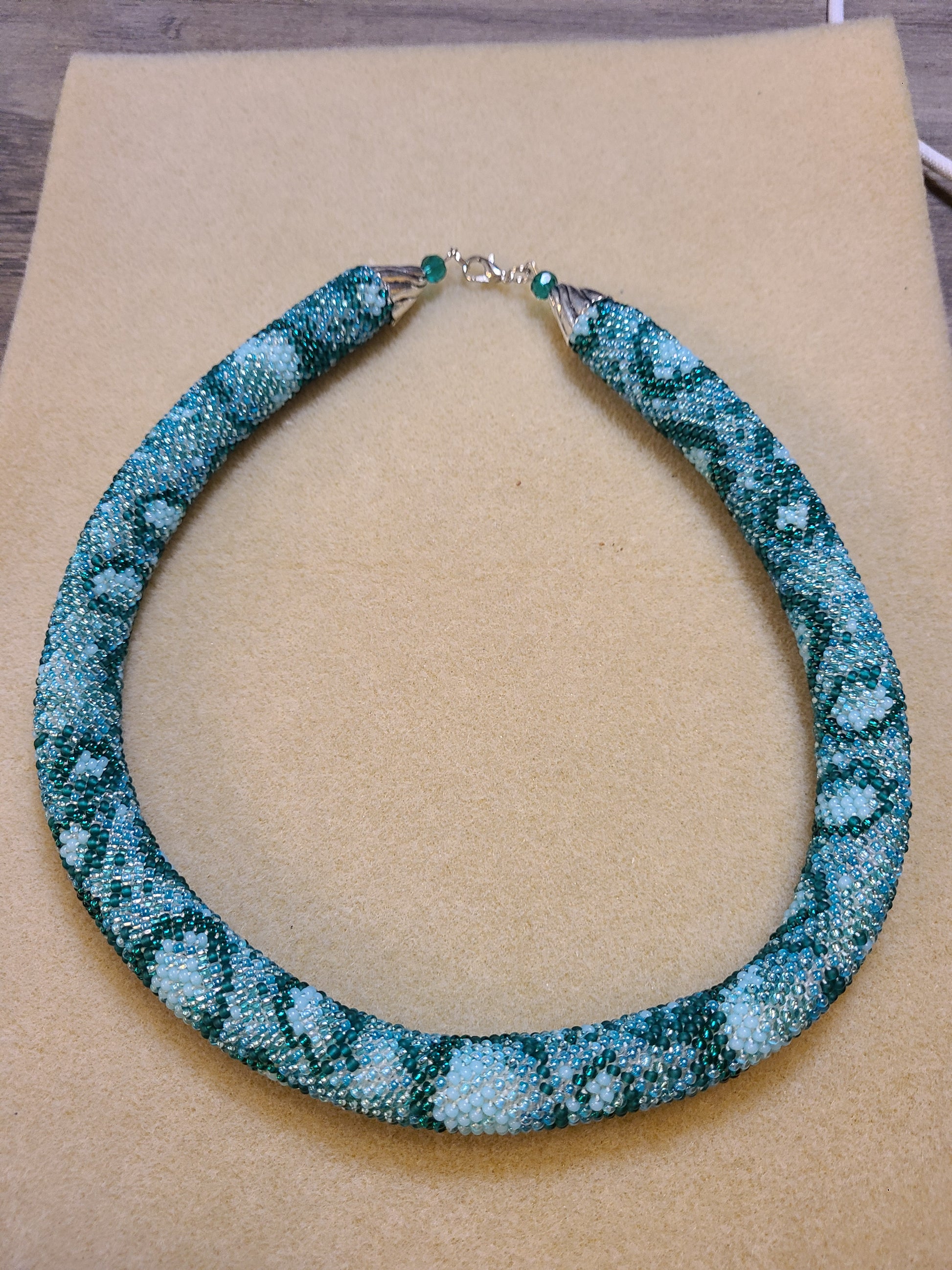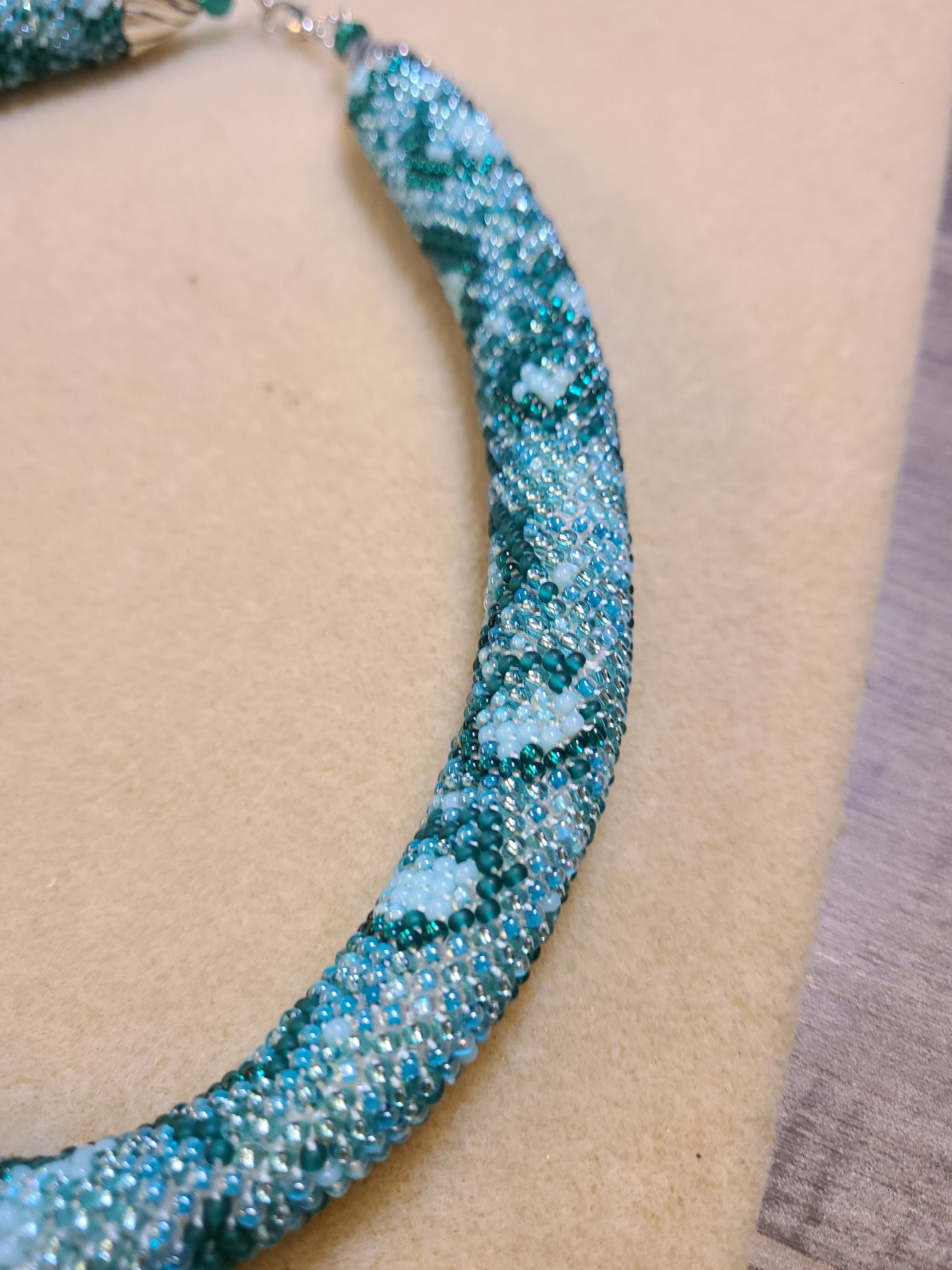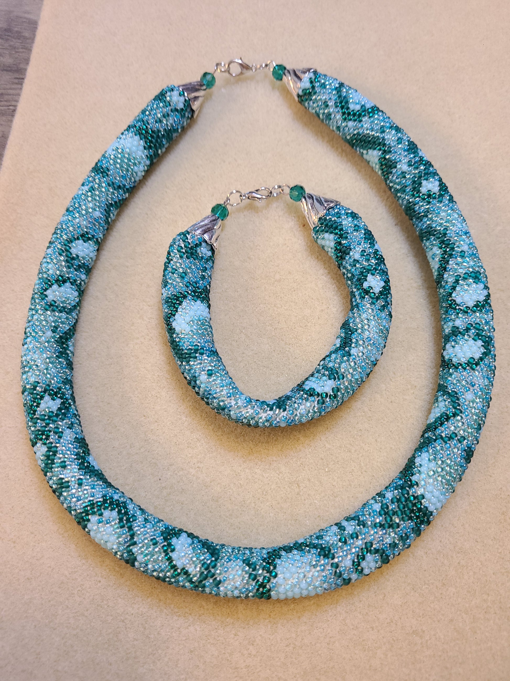 This set is a beaded crochet design by Crazyyy Academy. The design is done with transparent seed beads. It's soft and flexible.